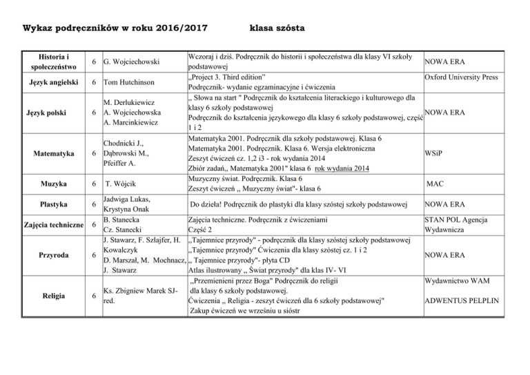 Wykaz podręczników w roku 2016/2017 Historia i społeczeństwo 6 G. Wojciechowski Język angielski 6 Tom Hutchinson Język polski Matematyka M. Derlukiewicz 6 A. Wojciechowska A. Marcinkiewicz Chodnicki J., 6 Dąbrowski M., Pfeiffer A. Muzyka 6 Plastyka 6 Zajęcia techniczne Przyroda Religia T. Wójcik klasa szósta Wczoraj i dziś. Podręcznik do historii i społeczeństwa dla klasy VI szkoły NOWA ERA podstawowej „Project 3. Third edition” Oxford University Press Podręcznik- wydanie egzaminacyjne i ćwiczenia ,, Słowa na start " Podręcznik do kształcenia literackiego i kulturowego dla klasy 6 szkoły podstawowej NOWA ERA Podręcznik do kształcenia językowego dla klasy 6 szkoły podstawowej, część 1i2 Matematyka 2001. Podręcznik dla szkoły podstawowej. Klasa 6 Matematyka 2001. Podręcznik. Klasa 6. Wersja elektroniczna WSiP Zeszyt ćwiczeń cz. 1,2 i3 - rok wydania 2014 Zbiór zadań,, Matematyka 2001" klasa 6 rok wydania 2014 Muzyczny świat. Podręcznik. Klasa 6 MAC Zeszyt ćwiczeń ,, Muzyczny świat"- klasa 6 Jadwiga Lukas, Do dzieła! Podręcznik do plastyki dla klasy szóstej szkoły podstawowej Krystyna Onak B. Stanecka Zajęcia techniczne. Podręcznik z ćwiczeniami 6 Cz. Stanecki Część 2 J. Stawarz, F. Szlajfer, H. ,,Tajemnice przyrody" - podręcznik dla klasy szóstej szkoły podstawowej Kowalczyk ,,Tajemnice przyrody" Ćwiczenia dla klasy szóstej cz. 1 i 2 6 D. Marszał, M. Mochnacz, ,, Tajemnice przyrody"- płyta CD J. Stawarz Atlas ilustrowany ,, Świat przyrody" dla klas IV- VI ,,Przemienieni przez Boga" Podręcznik do religii Ks. Zbigniew Marek SJdla klasy 6 szkoły podstawowej. 6 red. Ćwiczenia ,, Religia - zeszyt ćwiczeń dla 6 szkoły podstawowej" Zakup ćwiczeń we wrześniu u sióstr NOWA ERA STAN POL Agencja Wydawnicza NOWA ERA Wydawnictwo WAM ADWENTUS PELPLIN