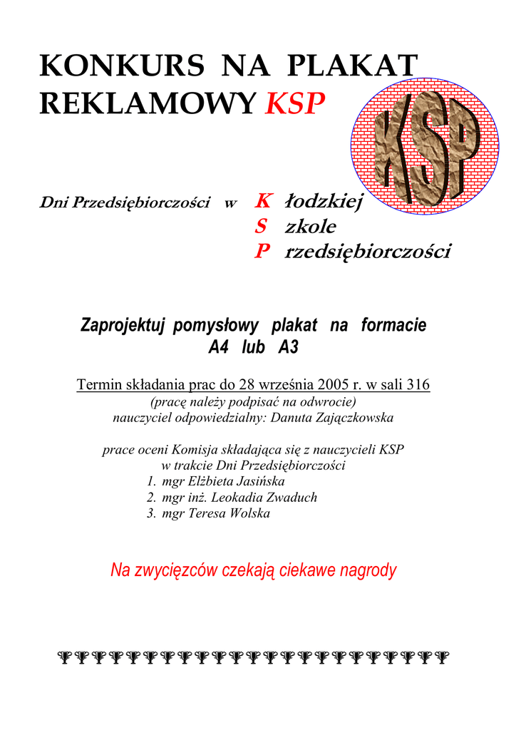 KONKURS NA PLAKAT REKLAMOWY KSP Dni Przedsiębiorczości w K łodzkiej S zkole P rzedsiębiorczości Zaprojektuj pomysłowy plakat na formacie A4 lub A3 Termin składania prac do 28 września 2005 r. w sali 316 (pracę należy podpisać na odwrocie) nauczyciel odpowiedzialny: Danuta Zajączkowska prace oceni Komisja składająca się z nauczycieli KSP w trakcie Dni Przedsiębiorczości 1. mgr Elżbieta Jasińska 2. mgr inż. Leokadia Zwaduch 3. mgr Teresa Wolska Na zwycięzców czekają ciekawe nagrody