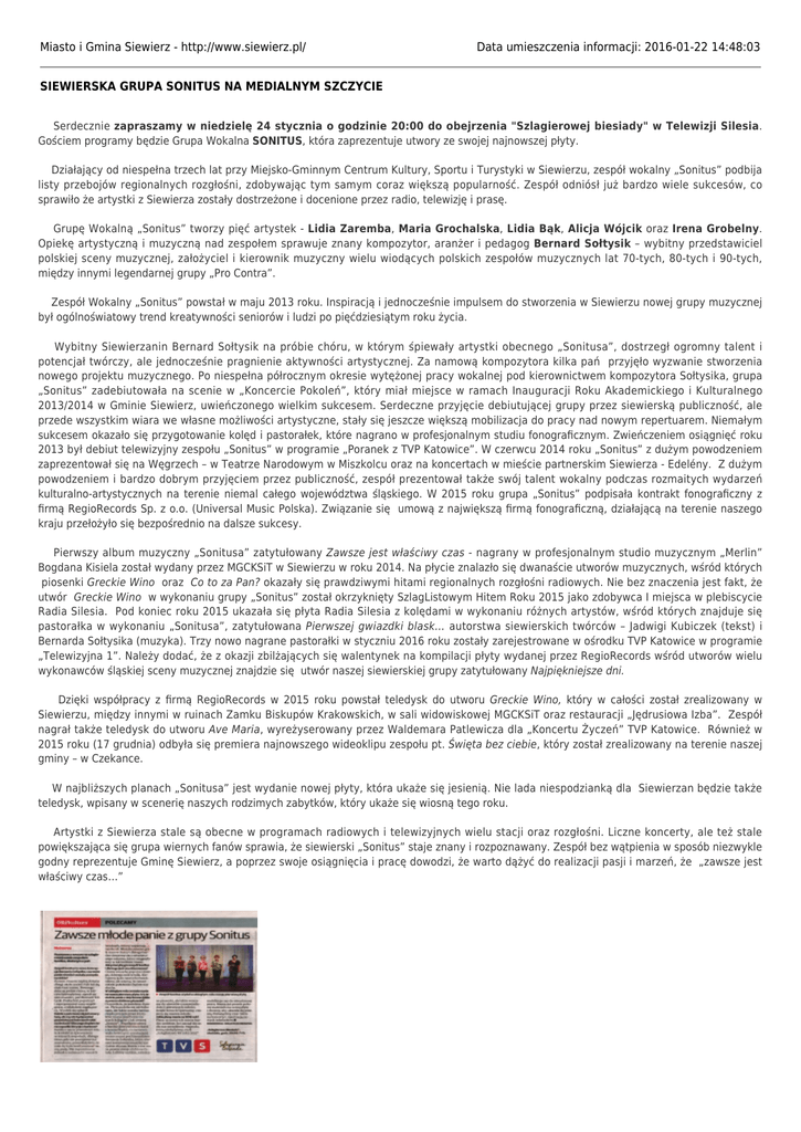 Miasto i Gmina Siewierz - http://www.siewierz.pl/ Data umieszczenia informacji: 2016-01-22 14:48:03 SIEWIERSKA GRUPA SONITUS NA MEDIALNYM SZCZYCIE Serdecznie zapraszamy w niedzielę 24 stycznia o godzinie 20:00 do obejrzenia "Szlagierowej biesiady" w Telewizji Silesia. Gościem programy będzie Grupa Wokalna SONITUS, która zaprezentuje utwory ze swojej najnowszej płyty. Działający od niespełna trzech lat przy Miejsko-Gminnym Centrum Kultury, Sportu i Turystyki w Siewierzu, zespół wokalny „Sonitus” podbija listy przebojów regionalnych rozgłośni, zdobywając tym samym coraz większą popularność. Zespół odniósł już bardzo wiele sukcesów, co sprawiło że artystki z Siewierza zostały dostrzeżone i docenione przez radio, telewizję i prasę. Grupę Wokalną „Sonitus” tworzy pięć artystek - Lidia Zaremba, Maria Grochalska, Lidia Bąk, Alicja Wójcik oraz Irena Grobelny. Opiekę artystyczną i muzyczną nad zespołem sprawuje znany kompozytor, aranżer i pedagog Bernard Sołtysik – wybitny przedstawiciel polskiej sceny muzycznej, założyciel i kierownik muzyczny wielu wiodących polskich zespołów muzycznych lat 70-tych, 80-tych i 90-tych, między innymi legendarnej grupy „Pro Contra”. Zespół Wokalny „Sonitus” powstał w maju 2013 roku. Inspiracją i jednocześnie impulsem do stworzenia w Siewierzu nowej grupy muzycznej był ogólnoświatowy trend kreatywności seniorów i ludzi po pięćdziesiątym roku życia. Wybitny Siewierzanin Bernard Sołtysik na próbie chóru, w którym śpiewały artystki obecnego „Sonitusa”, dostrzegł ogromny talent i potencjał twórczy, ale jednocześnie pragnienie aktywności artystycznej. Za namową kompozytora kilka pań przyjęło wyzwanie stworzenia nowego projektu muzycznego. Po niespełna półrocznym okresie wytężonej pracy wokalnej pod kierownictwem kompozytora Sołtysika, grupa „Sonitus” zadebiutowała na scenie w „Koncercie Pokoleń”, który miał miejsce w ramach Inauguracji Roku Akademickiego i Kulturalnego 2013/2014 w Gminie Siewierz, uwieńczonego wielkim sukcesem. Serdeczne przyjęcie debiutującej grupy przez siewierską publiczność, ale przede wszystkim wiara we własne możliwości artystyczne, stały się jeszcze większą mobilizacja do pracy nad nowym repertuarem. Niemałym sukcesem okazało się przygotowanie kolęd i pastorałek, które nagrano w profesjonalnym studiu fonograficznym. Zwieńczeniem osiągnięć roku 2013 był debiut telewizyjny zespołu „Sonitus” w programie „Poranek z TVP Katowice”. W czerwcu 2014 roku „Sonitus” z dużym powodzeniem zaprezentował się na Węgrzech – w Teatrze Narodowym w Miszkolcu oraz na koncertach w mieście partnerskim Siewierza - Edelény. Z dużym powodzeniem i bardzo dobrym przyjęciem przez publiczność, zespół prezentował także swój talent wokalny podczas rozmaitych wydarzeń kulturalno-artystycznych na terenie niemal całego województwa śląskiego. W 2015 roku grupa „Sonitus” podpisała kontrakt fonograficzny z firmą RegioRecords Sp. z o.o. (Universal Music Polska). Związanie się umową z największą firmą fonograficzną, działającą na terenie naszego kraju przełożyło się bezpośrednio na dalsze sukcesy. Pierwszy album muzyczny „Sonitusa” zatytułowany Zawsze jest właściwy czas - nagrany w profesjonalnym studio muzycznym „Merlin” Bogdana Kisiela został wydany przez MGCKSiT w Siewierzu w roku 2014. Na płycie znalazło się dwanaście utworów muzycznych, wśród których piosenki Greckie Wino oraz Co to za Pan? okazały się prawdziwymi hitami regionalnych rozgłośni radiowych. Nie bez znaczenia jest fakt, że utwór Greckie Wino w wykonaniu grupy „Sonitus” został okrzyknięty SzlagListowym Hitem Roku 2015 jako zdobywca I miejsca w plebiscycie Radia Silesia. Pod koniec roku 2015 ukazała się płyta Radia Silesia z kolędami w wykonaniu różnych artystów, wśród których znajduje się pastorałka w wykonaniu „Sonitusa”, zatytułowana Pierwszej gwiazdki blask… autorstwa siewierskich twórców – Jadwigi Kubiczek (tekst) i Bernarda Sołtysika (muzyka). Trzy nowo nagrane pastorałki w styczniu 2016 roku zostały zarejestrowane w ośrodku TVP Katowice w programie „Telewizyjna 1”. Należy dodać, że z okazji zbilżających się walentynek na kompilacji płyty wydanej przez RegioRecords wśród utworów wielu wykonawców śląskiej sceny muzycznej znajdzie się utwór naszej siewierskiej grupy zatytułowany Najpiękniejsze dni. Dzięki współpracy z firmą RegioRecords w 2015 roku powstał teledysk do utworu Greckie Wino, który w całości został zrealizowany w Siewierzu, między innymi w ruinach Zamku Biskupów Krakowskich, w sali widowiskowej MGCKSiT oraz restauracji „Jędrusiowa Izba”. Zespół nagrał także teledysk do utworu Ave Maria, wyreżyserowany przez Waldemara Patlewicza dla „Koncertu Życzeń” TVP Katowice. Również w 2015 roku (17 grudnia) odbyła się premiera najnowszego wideoklipu zespołu pt. Święta bez ciebie, który został zrealizowany na terenie naszej gminy – w Czekance. W najbliższych planach „Sonitusa” jest wydanie nowej płyty, która ukaże się jesienią. Nie lada niespodzianką dla Siewierzan będzie także teledysk, wpisany w scenerię naszych rodzimych zabytków, który ukaże się wiosną tego roku. Artystki z Siewierza stale są obecne w programach radiowych i telewizyjnych wielu stacji oraz rozgłośni. Liczne koncerty, ale też stale powiększająca się grupa wiernych fanów sprawia, że siewierski „Sonitus” staje znany i rozpoznawany. Zespół bez wątpienia w sposób niezwykle godny reprezentuje Gminę Siewierz, a poprzez swoje osiągnięcia i pracę dowodzi, że warto dążyć do realizacji pasji i marzeń, że „zawsze jest właściwy czas…” Urząd Miasta i Gminy Siewierz, 42-470 Siewierz, ul. Żwirki i WIgury 16, tel. 32 64 99 400, e-mail: [email protected] Burmistrz Miasta i Gminy Siewierz mgr Zdzisław