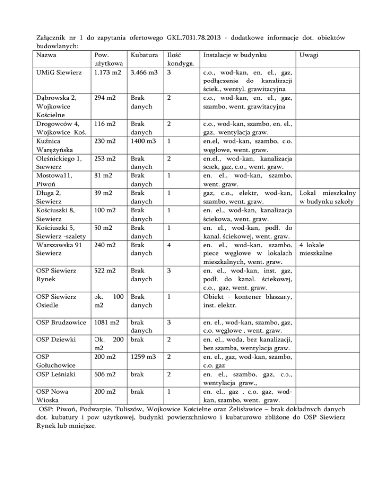 Załącznik nr 1 do zapytania ofertowego GKL.7031.78.2013 - dodatkowe informacje dot. obiektów budowlanych: Nazwa Pow. Kubatura Ilość Instalacje w budynku Uwagi użytkowa kondygn. UMiG Siewierz 1.173 m2 3.466 m3 3 c.o., wod-kan, en. el., gaz, podłączenie do kanalizacji ściek., wentyl. grawitacyjna Dąbrowska 2, 294 m2 Brak 2 c.o., wod-kan, en. el., gaz, Wojkowice danych szambo, went. grawitacyjna Kościelne Drogowców 4, 116 m2 Brak 2 c.o., wod-kan, szambo, en. el., Wojkowice Koś. danych gaz, wentylacja graw. Kuźnica 230 m2 1400 m3 1 en.el, wod-kan, szambo, c.o. Warężyńska węglowe, went. graw. Oleśnickiego 1, 253 m2 Brak 2 en.el., wod-kan, kanalizacja Siewierz danych ściek, gaz, c.o., went. graw. Mostowa11, 81 m2 Brak 1 en. el., wod-kan, szambo, Piwoń danych went. graw. Długa 2, 39 m2 Brak 1 gaz, c.o., elektr, wod-kan, Lokal mieszkalny Siewierz danych szambo, went. graw. w budynku szkoły Kościuszki 8, 100 m2 Brak 1 en. el., wod-kan, kanalizacja Siewierz danych ściekowa, went. graw. Kościuszki 5, 50 m2 Brak 1 en. el., wod-kan, podł. do Siewierz -szalety danych kanal. ściekowej, went. graw. Warszawska 91 240 m2 Brak 4 en. el., wod-kan, szambo, 4 lokale Siewierz danych piece węglowe w lokalach mieszkalne mieszkalnych, went. graw. OSP Siewierz 522 m2 Brak 3 en. el., wod-kan, inst. gaz, Rynek danych podł. do kanal. ściekowej, c.o., gaz, went. graw. OSP Siewierz ok. 100 Brak 1 Obiekt - kontener blaszany, Osiedle m2 danych inst. elektr. OSP Brudzowice 1081 m2 brak danych 200 brak 3 en. el., wod-kan, szambo, gaz, c.o. węglowe , went. graw. OSP Dziewki Ok. 2 en. el., woda, bez kanalizacji, m2 bez szamba, wentylacja graw. OSP 200 m2 1259 m3 2 en. el., gaz, wod-kan, szambo, Gołuchowice c.o. gaz OSP Leśniaki 606 m2 brak 2 en. el., szambo, gaz, c.o., wentylacja graw., OSP Nowa 200 m2 brak 1 en. el., gaz , c.o. gaz, wodWioska kan, szambo, went. graw. OSP: Piwoń, Podwarpie, Tuliszów, Wojkowice Kościelne oraz Żelisławice – brak dokładnych danych dot. kubatury i pow użytkowej, budynki powierzchniowo i kubaturowo zbliżone do OSP Siewierz Rynek lub mniejsze.