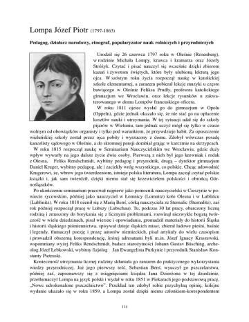 Lompa Józef Piotr (1797−1863) Pedagog, działacz narodowy, etnograf, popularyzator nauk rolniczych i przyrodniczych Urodził się 26 czerwca 1797 roku w Oleśnie (Rosenberg), w rodzinie Michała Lompy, krawca i kramarza oraz Józefy Stróżyk. Czytać i pisać nauczył się wcześnie dzięki zbiorom kazań i żywotom świętych, które były ulubioną lekturą jego ojca. W szóstym roku życia rozpoczął naukę w katolickiej szkole elementarnej, a zarazem pobierał lekcje muzyki u często bawiącego w Oleśnie Feliksa Prudły, profesora katolickiego gimnazjum we Wrocławiu, oraz lekcje rysunków u zakwa− terowanego w domu Lompów francuskiego oficera. W roku 1811 ojciec wysłał go do gimnazjum w Opolu (Oppeln), gdzie jednak okazało się, że nie stać go na opłacenie kosztów nauki i utrzymania. W tej sytuacji udał się do szkoły pijarów w Wieluniu, tam jednak uczyć mógł się tylko w czasie wolnym od obowiązków organisty i tylko pod warunkiem, że przywdzieje habit. Za opuszczenie wieluńskiej szkoły został przez ojca pobity i wyrzucony z domu. Zdobył wówczas posadę kancelisty sądowego w Oleśnie, a do skromnej pensji dorabiał grając w karczmie na skrzypcach. W roku 1815 rozpoczął naukę w Seminarium Nauczycielskim we Wrocławiu, gdzie duży wpływ wywarły na jego dalsze życie dwie osoby. Pierwszą z nich był jego krewniak i rodak z Olesna, Feliks Rendschmidt, wybitny pedagog i przyrodnik, drugą – dyrektor gimnazjum Daniel Kruger, wybitny pedagog, ale i zaciekły wróg wszystkiego, co polskie. Chcąc udowodnić Krugerowi, że, wbrew jego twierdzeniom, istnieje polska literatura, Lompa zaczął czytać polskie książki i, jak sam twierdził, dzięki niemu stał się krzewicielem polskości i obrońcą Gór− noślązaków. Po ukończeniu seminarium pracował najpierw jako pomocnik nauczycielski w Cieszynie w po− wiecie sycowskim, później jako nauczyciel w Łomnicy (Lomnitz) koło Olesna i w Lublińcu (Lublinitz). W roku 1818 ożenił się z Marią Benś, córką nauczyciela ze Sternalic (Sternalitz), zaś rok później rozpoczął pracę w Lubszy (Lubschau). Tu, podczas 30 lat pracy, obarczony liczną rodziną i zmuszony do borykania się z licznymi problemami, rozwinął niezwykle bogatą twór− czość w wielu dziedzinach, pisał wiersze i opowiadania, gromadził materiały do historii Śląska i historii śląskiego piśmiennictwa, spisywał dzieje śląskich miast, zbierał ludowe pieśni, baśnie i legendy, tłumaczył poezję i prozę autorów niemieckich, pisał artykuły do wielu czasopism i prowadził obszerną korespondencję, której adresatami byli m.in. Józef Ignacy Kraszewski, wspomniany wyżej Feliks Rendschmidt, badacz starożytności Johann Gustav Büsching, arche− olog Józef Łebkowski, wybitny fizjolog Jan Ewangelista Purkynie i przyrodnik Stanisław Kon− stanty Pietruski. Konieczność utrzymania licznej rodziny skłaniała go zarazem do praktycznego wykorzystania wiedzy przyrodniczej. Już jego pierwszy teść, Sebastian Benś, wyuczył go pszczelarstwa, później zaś, zapoznawszy się z osiągnięciami księdza Jana Dzierżona w tej dziedzinie, przetłumaczył Lompa na język polski i wydał w roku 1851 w Piekarach jego podstawową pracę, „Nowe udoskonalone pszczelnictwo”. Przekład ten zdobył sobie przychylną opinię, kolejne wydanie ukazało się w roku 1859, a Lompa został dzięki niemu członkiem−korespondentem 114 Towarzystwa Rolniczego w Krakowie. Zasłużoną sławą cieszył się ogród szkolny w Lubszy, który Lompa poszerzył i uporządkował, następnie zasadził w nim ponad 200 drzew owocowych, wybudował trzy altany, całość poprzecinał chodnikami, których obrzeża przyozdobił kwiatami. Z czasem zgromadził w swoim ogrodzie ponad 500 gatunków roślin, a ponieważ każda z nich opatrzona była tabliczką z nazwą rośliny w języku łacińskim, polskim i niemieckim, powstał mały ogród botaniczny, który odwiedzany był chętnie przez miłośników roślin z różnych, niejed− nokrotnie dalekich stron. Chcąc podzielić się swymi doświadczeniami i zachęcić Ślązaków do pójścia w swoje ślady, Lompa, poza wspomnianym wyżej przekładem książki Dzierżona, wydał też szereg innych przekładów i własnych książeczek popularyzujących nowoczesne metody gospodarki wiejskiej. Liczne artykuły z dziedziny rolnictwa, ogrodnictwa, hodowli zwierząt i ptactwa oraz artykuły o pożytecznych i szkodliwych roślinach i zwierzętach zamieszczał też na łamach pszczyńskiego „Tygodnika Polskiego”. Ponadto napisał pochwalony przez ministra oświaty, jednak nie dopuszczony do użytku szkolnego przez władze rejencji opolskiej podręcznik „Krótki rys historii naturalnej dla szkół elementarnych” obejmujący ciała kopalne, rośliny, zwierzęta i polsko− niemiecki słowniczek pojęć przyrodniczych. W roku 1838, po śmierci pierwszej żony, ożenił się z córką nauczyciela z Ligoty, Weroniką Grzegorz, a jego rodzina powiększała się coraz bardziej. Jego sytuacja z trudnej zmieniła się w katastrofalną, gdy w roku 1850, wskutek zaangażowania w działalność demokratyczną i na− rodową w okresie Wiosny Ludów, został zwolniony z posady nauczyciela bez prawa do emery− tury. Przez szereg lat mieszkał jeszcze w Lubszy, utrzymując się z różnych, dorywczych zajęć, doraźnych zapomóg Ligi Polskiej i pieniędzy ofiarowanych mu przez osoby wzruszone jego losem. W roku 1858 przeniósł się z rodziną do Woźnik (Woischnik), gdzie zmarł 23 marca 1863 roku. Ważniejsze prace przyrodnicze: 1848 – Krótki rys historii naturalnej dla szkół elementarnych. Olesno. 1852 – Nowe udoskonalone pszczelnictwo ks. plebana Dzierżona. Piekary (przekład). 1852 – Praktyczna nauka hodowania drzew owocowych z osobliwym względem na włościan i młodzież po wsiach i miasteczkach przez F. W. Ulrycha ułożona. Piekary (przekład). 1853 – Wskazówka do stosownej i korzystne