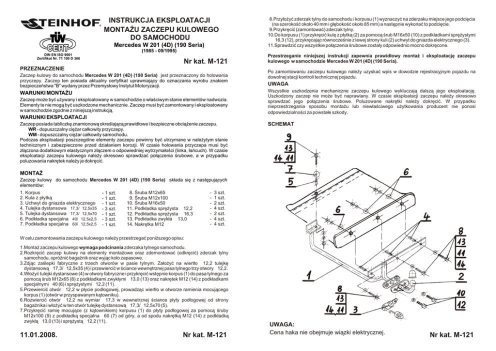 INSTRUKCJA EKSPLOATACJI I MONTA¯U ZACZEPU KULOWEGO DO SAMOCHODU Mercedes W 201 (4D) (190 Seria) 8.Przy³o¿yæ zderzak tylny do samochodu i korpusu (1) wyznaczyæ na zderzaku miejsce jego podciêcia (na szerokoœæ oko³o 40 mm i g³êbokoœæ oko³o 85 mm) a nastêpnie wykonaæ to podciêcie. 9.Przykrêciæ (zamontowaæ) zderzak tylny. 10.Do korpusu (1) przykrêciæ kulê z p³ytk¹ (2) za pomoc¹ œrub M16x50 (10) z podk³adkami sprê¿ystymi Ø16,3 (12), przykrêcaj¹c równoczeœnie z lewej strony kuli (2) uchwyt do gniazda elektrycznego (3). 11.Sprawdziæ czy wszystkie po³¹czenia œrubowe zosta³y odpowiednio mocno dokrêcone. (1985 - 09/1995) DIN EN ISO 9001 Zertifikat Nr. 71 100 D 366 Nr kat. M-121 PRZEZNACZENIE Zaczep kulowy do samochodu Mercedes W 201 (4D) (190 Seria) jest przeznaczony do holowania przyczepy. Zaczep ten posiada aktualny certyfikat uprawniaj¹cy do oznaczania wyrobu znakiem bezpieczeñstwa "B" wydany przez Przemys³owy Instytut Motoryzacji. WARUNKI MONTA¯U Zaczep mo¿e byæ u¿ywany i eksploatowany w samochodzie o w³aœciwym stanie elementów nadwozia. Elementy te nie mog¹ byæ uszkodzone mechanicznie. Zaczep musi byæ zamontowany i eksploatowany w samochodzie zgodnie z niniejsz¹ instrukcj¹. Przestrzeganie niniejszej instrukcji zapewnia prawid³owy monta¿ i eksploatacjê zaczepu kulowego w samochodzie Mercedes W 201 (4D) (190 Seria). Po zamontowaniu zaczepu kulowego nale¿y uzyskaæ wpis w dowodzie rejestracyjnym pojazdu na dowolnej stacji kontroli technicznej pojazdu. UWAGA Wszystkie uszkodzenia mechaniczne zaczepu kulowego wykluczaj¹ dalsz¹ jego eksploatacjê. Uszkodzony zaczep nie mo¿e byæ naprawiany. W czasie eksploatacji zaczepu nale¿y okresowo sprawdzaæ jego po³¹czenia œrubowe. Poluzowane nakrêtki nale¿y dokrêciæ. W przypadku nieprzestrzegania sposobu monta¿u lub niew³aœciwego u¿ytkowania producent nie ponosi odpowiedzialnoœci za powsta³e szkody. WARUNKI EKSPLOATACJI Zaczep posiada tabliczkê znamionow¹ okreœlaj¹c¹ prawid³owe i bezpieczne obci¹¿enie zaczepu. WR - dopuszczalny ciê¿ar ca³kowity przyczepy. WM - dopuszczalny ciê¿ar ca³kowity samochodu. Podczas eksploatacji poszczególne elementy zaczepu powinny byæ utrzymane w nale¿ytym stanie technicznym i zabezpieczone przed dzia³aniem korozji. W czasie holowania przyczepa musi byæ z³¹czona dodatkowym elastycznym z³¹czem o odpowiedniej wytrzyma³oœci (linka, ³añcuch). W czasie eksploatacji zaczepu kulowego nale¿y okresowo sprawdzaæ po³¹czenia œrubowe, a w przypadku poluzowania nakrêtek nale¿y je dokrêciæ. SCHEMAT MONTA¯ Zaczep kulowy do samochodu Mercedes W 201 (4D) (190 Seria) sk³ada siê z nastêpuj¹cych elementów: 1. Korpus 2. Kula z p³ytk¹ 3. Uchwyt do gniazda elektrycznego 4. Tulejka dystansowa Ø17,3/Ø12,5x35 5. Tulejka dystansowa Ø17,3/Ø12,5x70 6. Podk³adka specjalna Ø40/Ø12,5x2,5 7. Podk³adka specjalna Ø60/Ø12,5x2,5 - 1 szt. - 1 szt. - 1 szt. - 3 szt. - 1 szt. - 3 szt. - 1 szt. 8. Œruba M12x65 9. Œruba M12x100 10. Œruba M16x50 11. Podk³adka sprê¿ysta Ø12,2 12. Podk³adka sprê¿ysta Ø16,3 13. Podk³adka zwyk³a Ø13,0 14. Nakrêtka M12 - 3 szt. 1 szt. 2 szt. 4 szt. 2 szt. 4 szt. 4 szt. W celu zamontowania zaczepu kulowego nale¿y przestrzegaæ poni¿szego opisu: 1.Monta¿ zaczepu kulowego wymaga podcinania zderzaka tylnego samochodu. 2.Rozkrêciæ zaczep kulowy na elementy monta¿owe oraz zdemontowaæ (odkrêciæ) zderzak tylny samochodu, opró¿niæ baga¿nik oraz wyj¹c ko³o zapasowe. 3.Zdj¹c zaœlepki fabryczne z trzech otworów w pasie tylnym. Za³o¿yæ na wiert³o Ø12,2 tulejkê dystansow¹ Ø17,3/Ø12,5x35 (4) i przewierciæ w œciance wewnêtrznej pasa tylnego trzy otwory Ø12,2. 4.W³o¿yæ tulejki dystansowe (4) w otwory fabryczne i przykrêciæ wstêpnie korpus (1) do pasa tylnego za pomoc¹ œrub M12x65 (8) z podk³adkami zwyk³ymi Ø13,0 (13) oraz nakrêtek M12 (14) z podk³adkami specjalnymi Ø40 (6) i sprê¿ystymi Ø12,2 (11). 5.Przewierciæ otwór Ø12,2 w p³ycie pod³ogowej, prowadz¹c wiert³o w otworze ramienia mocuj¹cego korpus (1) (otwór w przyspawanym k¹towniku). 6.Rozwierciæ otwór Ø12,2 na wymiar Ø17,3 w wewnetrznej œciance p³yty pod³ogowej od strony baga¿nika i w³o¿yæ w ten otwór tulejkê dystansow¹ Ø17,3/Ø12,5x70 (5). 7.Przykrêciæ ramiê mocuj¹ce (z k¹townikiem) korpusu (1) do p³yty pod³ogowej za pomoc¹ œruby M12x100 (9) z podk³adk¹ specjalna Ø60 (7) od góry, a od spodu nakrêtk¹ M12 (14) z podk³adk¹ zwyk³¹ Ø13,0 (13) i sprê¿yst¹ Ø12,2 (11). 11.01.2008. Nr kat. M-121 UWAGA: Cena haka nie obejmuje wi¹zki elektrycznej. Nr kat. M-121