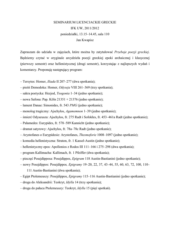SEMINARIUM LICENCJACKIE GRECKIE IFK UW, 2011/2012 poniedziałki, 13.15–14.45, sala 110 Jan Kwapisz Zapraszam do udziału w zajęciach, które można by zatytułować Przeboje poezji greckiej. Będziemy czytać w oryginale arcydzieła poezji greckiej epoki archaicznej i klasycznej (pierwszy semestr) oraz hellenistycznej (drugi semestr), korzystając z najlepszych wydań i komentarzy. Proponuję następujący program: – Tersytes: Homer, Iliada II 207–277 (dwa spotkania); – pieśń Demodoka: Homer, Odyseja VIII 261–369 (trzy spotkania); – sakra poetycka: Hezjod, Teogonia 1–34 (jedno spotkanie); – nowa Safona: Pap. Köln 21351 + 21376 (jedno spotkanie); – lament Danae: Simonides, fr. 543 PMG (jedno spotkanie); – monolog tragiczny: Ajschylos, Agamemnon 1–39 (jedno spotkanie); – śmierć Odyseusza: Ajschylos, fr. 275 Radt i Sofokles, fr. 453–461a Radt (jedno spotkanie); – Palamedes: Eurypides, fr. 578–589 Kannicht (jedno spotkanie); – dramat satyrowy: Ajschylos, fr. 78a–78c Radt (jedno spotkanie); – Arystofanes o Eurypidesie: Arystofanes, Thesmoforie 1008–1097 (jedno spotkanie); – komedia hellenistyczna: Straton, fr. 1 Kassel-Austin (jedno spotkanie); – hellenistyczny epos: Apollonios z Rodos III 111–166 i 275–298 (dwa spotkania); – program Kallimacha: Kallimach, fr. 1 Pfeiffer (dwa spotkania); – pieczęć Posejdipposa: Posejdippos, Epigram 118 Austin-Bastianini (jedno spotkanie); – nowy Posejdippos: Posejdippos, Epigramy 19–20, 22, 37, 43–44, 55, 60, 63, 72, 100, 110– 111 Austin-Bastianini (dwa spotkania); – Egipt Ptolemeuszy: Posejdippos, Epigramy 115–116 Austin-Bastianini (jedno spotkanie); – droga do Aleksandrii: Teokryt, Idylla 14 (trzy spotkania); – droga do pałacu Ptolemeuszy: Teokryt, Idylla 15 (pięć spotkań).