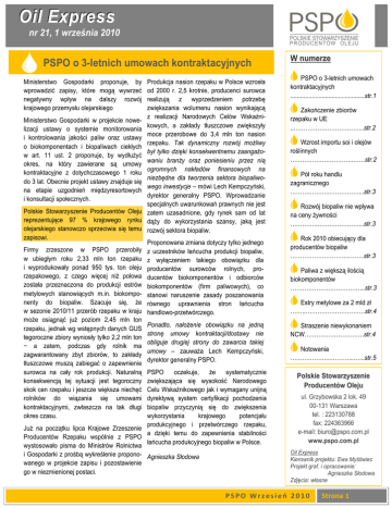 Oil Express nr 21, 1 września 2010 PSPO o 3-letnich umowach kontraktacyjnych Ministerstwo Gospodarki proponuje, by wprowadzić zapisy, które mogą wywrzeć negatywny wpływ na dalszy rozwój krajowego przemysłu olejarskiego Ministerstwo Gospodarki w projekcie nowelizacji ustawy o systemie monitorowania i kontrolowania jakości paliw oraz ustawy o biokomponentach i biopaliwach ciekłych w art. 11 ust. 2 proponuje, by wydłuŜyć okres, na który zawierane są umowy kontraktacyjne z dotychczasowego 1 roku do 3 lat. Obecnie projekt ustawy znajduje się na etapie uzgodnień międzyresortowych i konsultacji społecznych. Polskie Stowarzyszenie Producentów Oleju reprezentujące 97 % krajowego rynku olejarskiego stanowczo sprzeciwia się temu zapisowi. Firmy zrzeszone w PSPO przerobiły w ubiegłym roku 2,33 mln ton rzepaku i wyprodukowały ponad 950 tys. ton oleju rzepakowego, z czego więcej niŜ połowa została przeznaczona do produkcji estrów metylowych stanowiących m.in. biokomponenty do biopaliw. Szacuje się, Ŝe w sezonie 2010/11 przerób rzepaku w kraju moŜe osiągnąć juŜ poziom 2,45 mln ton rzepaku, jednak wg wstępnych danych GUS tegoroczne zbiory wyniosły tylko 2,2 mln ton − a zatem, podczas gdy rolnik ma zagwarantowany zbyt zbiorów, to zakłady tłuszczowe muszą zabiegać o zapewnienie surowca na cały rok produkcji. Naturalną konsekwencją tej sytuacji jest tegoroczny skok cen rzepaku i jeszcze większa niechęć rolników do wiązania się umowami kontraktacyjnymi, zwłaszcza na tak długi okres czasu. Produkcja nasion rzepaku w Polsce wzrosła od 2000 r. 2,5 krotnie, producenci surowca realizują z wyprzedzeniem potrzebę zwiększania wolumenu nasion wynikającą z realizacji Narodowych Celów Wskaźnikowych, a zakłady tłuszczowe zwiększyły moce przerobowe do 3,4 mln ton nasion rzepaku. Tak dynamiczny rozwój moŜliwy był tylko dzięki konsekwentnemu zaangaŜowaniu branŜy oraz poniesieniu przez nią ogromnych nakładów finansowych na niezbędne dla tworzenia sektora biopaliwowego inwestycje – mówi Lech Kempczyński, dyrektor generalny PSPO. Wprowadzanie specjalnych uwarunkowań prawnych nie jest zatem uzasadnione, gdy rynek sam od lat dąŜy do wykorzystania szansy, jaką jest rozwój sektora biopaliw. Proponowana zmiana dotyczy tylko jednego z uczestników łańcucha produkcji biopaliw, z wyłączeniem takiego obowiązku dla producentów surowców rolnych, producentów biokomponentów i odbiorców biokomponentów (firm paliwowych), co stanowi naruszenie zasady poszanowania równego uprawnienia stron łańcucha handlowo-przetwórczego. Ponadto, nałoŜenie obowiązku na jedną stronę umowy kontraktacji/dostawy nie obliguje drugiej strony do zawarcia takiej umowy – zauwaŜa Lech Kempczyński, dyrektor generalny PSPO. PSPO oczekuje, Ŝe systematycznie zwiększająca się wysokość Narodowego Celu Wskaźnikowego jak i wymagany unijną dyrektywą system certyfikacji pochodzenia biopaliw przyczynią się do zwiększenia wykorzystania krajowego potencjału produkcyjnego i przetwórczego rzepaku, JuŜ na początku lipca Krajowe Zrzeszenie a dzięki temu do zapewnienia stabilności Producentów Rzepaku wspólnie z PSPO łańcucha produkcyjnego biopaliw w Polsce. wystosowało pisma do Ministrów Rolnictwa i Gospodarki z prośbą wykreślenie propono- Agnieszka Słodowa wanego w projekcie zapisu i pozostawienie go w niezmienionej postaci. W numerze PSPO o 3-letnich umowach kontraktacyjnych .............................................str.1 Zakończenie zbiorów rzepaku w UE ..……………………………...str.2 Wzrost importu soi i olejów roślinnych …………………………..……str.2 Pół roku handlu zagranicznego ………………..……………...str.3 Rozwój biopaliw nie wpływa na ceny Ŝywności …………..…………………...str.3 Rok 2010 obiecujący dla producentów biopaliw ………………………...……..str.3 Paliwa z większą ilością biokomponentów ………………………………..str.3 Estry metylowe za 2 mld zł ……..…………………………str.4 Straszenie niewykonaniem NCW…………………………str.4 Notowania ………………...………...…...str.5 Polskie Stowarzyszenie Producentów Oleju ul. Grzybowska 2 lok. 49 00-131 Warszawa tel. : 223130788 fax: 224363966 e-mail: [email protected] www.pspo.com.pl Oil Express Kierownik projektu: Ewa Myśliwiec Projekt graf. i opracowanie: Agnieszka Słodowa Zdjęcia: własne PSPO Wrzesień 2010 Strona 1 Oil Express Zakończenie zbiorów rzepaku w UE ton z pozostałych państw WNP, Dodatkowo zostaną zredukowane natomiast po około 0,1 mln ton z Kanady zapasy, aby pod koniec sezonu prawdoi Australii. podobnie obniŜyć się do 0,9 mln ton z 1,4 mln ton na początku bieŜącego Skutkiem spadku podaŜy będzie około sezonu (-36%). 5% spadek przerobu o około 1,2 mln ton, który zaowocuje spadkiem produkcji PSPO na podst. FAMMU/FAPA za oleju rzepakowego oraz śruty. Reuters, Oil World W Europie rzepakowe zbiory zostały prawie zakończone, a plony okazują się być nieznacznie wyŜsze niŜ ostatnio zakładano. Spadek zbiorów oceniany jest na 1,7 mln ton (-7,8%) mniej niŜ rok wcześniej. BieŜące prognozy przewidują około 20 mln ton w bieŜącym roku wobec 21,7 mln ton w 2009 r. Oczekuje się zmniejszenia poziomu zbiorów u największych producentów poza Wielką Brytanią. Zbiory rzepaku w Polsce szacowane są na poziomie 2,02 mln ton. W bieŜącym sezonie 2010/11 trudno będzie zapobiec spadkowi przerobu ze względu na trudności w zapewnieniu odpowiedniego poziomu importu spoza Unii, bowiem spada światowa podaŜ eksportowa rzepaku. Pozostaje jednak margines niepewności poniewaŜ ostatnie szacunki zbiorów w Kanadzie są na poziomie tj. 10,9 mln ton, czyli 0,3-0,9 mln ton więcej niŜ wcześniej zakładano, ale istotnie mniejsze niŜ przed rokiem i dwoma laty. BieŜące prognozy importu zakładają 2,25 mln ton z czego 1,1 mln ton po