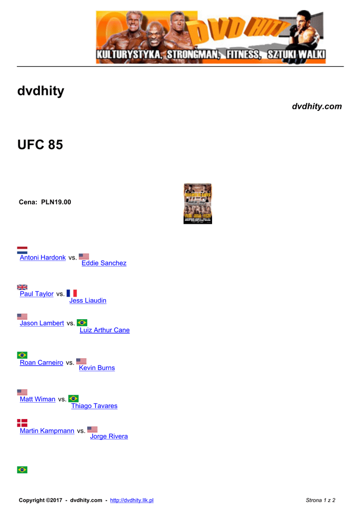 dvdhity dvdhity.com UFC 85 Cena: PLN19.00 Antoni Hardonk vs. Eddie Sanchez Paul Taylor vs. Jess Liaudin Jason Lambert vs. Luiz Arthur Cane Roan Carneiro vs. Kevin Burns Matt Wiman vs. Thiago Tavares Martin Kampmann vs. Jorge Rivera Copyright ©2017 - dvdhity.com - http://dvdhity.llk.pl Strona 1 z 2 Fabricio Werdum vs. Brandon Vera Nathan Marquardt vs. Thales Leites Mike Swick vs. Marcus Davis Michael Bisping vs. Jason Day Matt Hughes vs. Thiago Alves Informacja o dostawcy Copyright ©2017 - dvdhity.com - http://dvdhity.llk.pl Strona 2 z 2