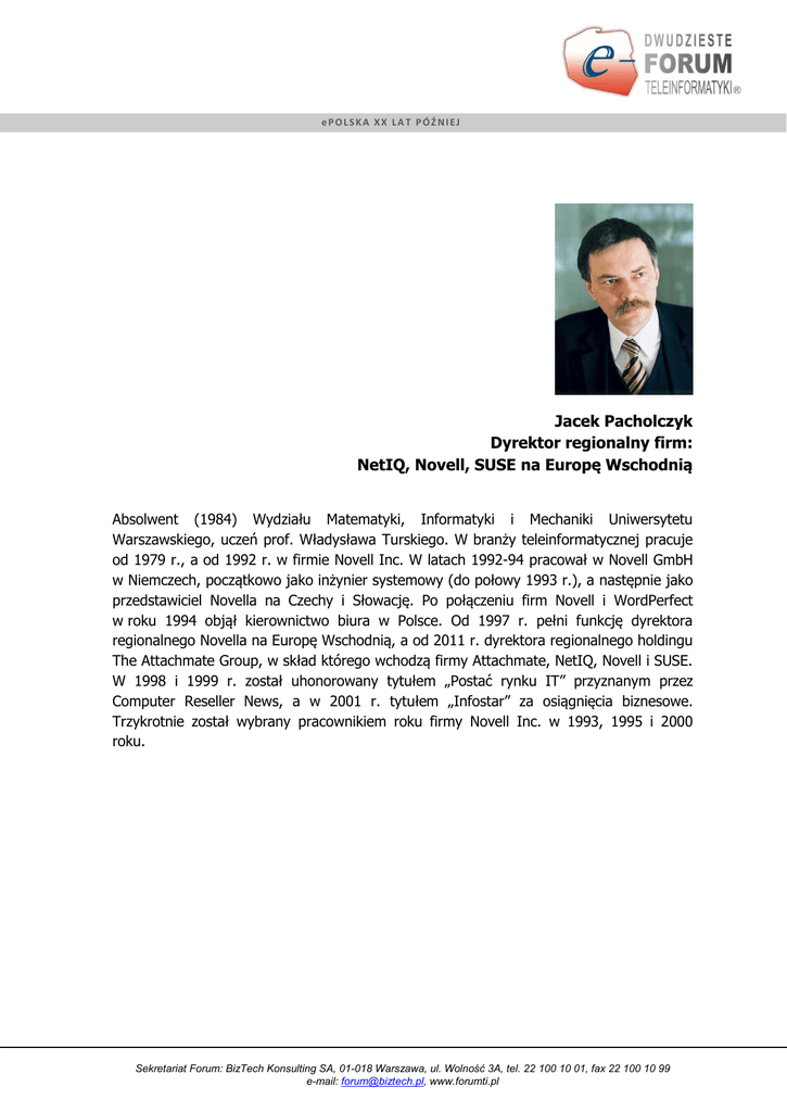 ePOLSKA XX LAT PÓŹNIEJ Jacek Pacholczyk Dyrektor regionalny firm: NetIQ, Novell, SUSE na Europę Wschodnią Absolwent (1984) Wydziału Matematyki, Informatyki i Mechaniki Uniwersytetu Warszawskiego, uczeń prof. Władysława Turskiego. W branży teleinformatycznej pracuje od 1979 r., a od 1992 r. w firmie Novell Inc. W latach 1992-94 pracował w Novell GmbH w Niemczech, początkowo jako inżynier systemowy (do połowy 1993 r.), a następnie jako przedstawiciel Novella na Czechy i Słowację. Po połączeniu firm Novell i WordPerfect w roku 1994 objął kierownictwo biura w Polsce. Od 1997 r. pełni funkcję dyrektora regionalnego Novella na Europę Wschodnią, a od 2011 r. dyrektora regionalnego holdingu The Attachmate Group, w skład którego wchodzą firmy Attachmate, NetIQ, Novell i SUSE. W 1998 i 1999 r. został uhonorowany tytułem „Postać rynku IT” przyznanym przez Computer Reseller News, a w 2001 r. tytułem „Infostar” za osiągnięcia biznesowe. Trzykrotnie został wybrany pracownikiem roku firmy Novell Inc. w 1993, 1995 i 2000 roku. Sekretariat Forum: BizTech Konsulting SA, 01-018 Warszawa, ul. Wolność 3A, tel. 22 100 10 01, fax 22 100 10 99 e-mail: [email protected], www.forumti.pl