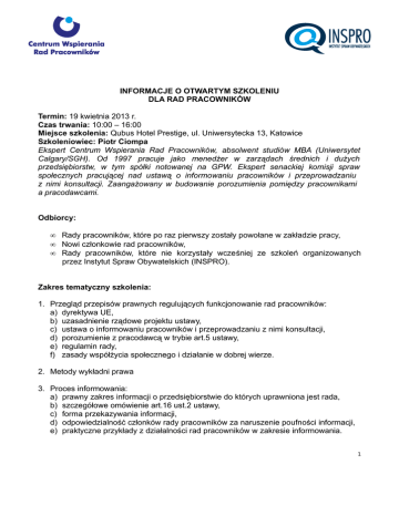 INFORMACJE O OTWARTYM SZKOLENIU DLA RAD PRACOWNIKÓW Termin: 19 kwietnia 2013 r. Czas trwania: 10:00 – 16:00 Miejsce szkolenia: Qubus Hotel Prestige, ul. Uniwersytecka 13, Katowice Szkoleniowiec: Piotr Ciompa Ekspert Centrum Wspierania Rad Pracowników, absolwent studiów MBA (Uniwersytet Calgary/SGH). Od 1997 pracuje jako menedżer w zarządach średnich i dużych przedsiębiorstw, w tym spółki notowanej na GPW. Ekspert senackiej komisji spraw społecznych pracującej nad ustawą o informowaniu pracowników i przeprowadzaniu z nimi konsultacji. Zaangażowany w budowanie porozumienia pomiędzy pracownikami a pracodawcami. Odbiorcy: • Rady pracowników, które po raz pierwszy zostały powołane w zakładzie pracy, • Nowi członkowie rad pracowników, • Rady pracowników, które nie korzystały wcześniej ze szkoleń organizowanych przez Instytut Spraw Obywatelskich (INSPRO). Zakres tematyczny szkolenia: 1. Przegląd przepisów prawnych regulujących funkcjonowanie rad pracowników: a) dyrektywa UE, b) uzasadnienie rządowe projektu ustawy, c) ustawa o informowaniu pracowników i przeprowadzaniu z nimi konsultacji, d) porozumienie z pracodawcą w trybie art.5 ustawy, e) regulamin rady, f) zasady współżycia społecznego i działanie w dobrej wierze. 2. Metody wykładni prawa 3. Proces informowania: a) prawny zakres informacji o przedsiębiorstwie do których uprawniona jest rada, b) szczegółowe omówienie art.16 ust.2 ustawy, c) forma przekazywania informacji, d) odpowiedzialność członków rady pracowników za naruszenie poufności informacji, e) praktyczne przykłady z działalności rad pracowników w zakresie informowania. 1 4. Proces konsultowania: a) zakres konsultacji, b) forma przeprowadzania konsultacji, c) praktyczne przykłady z działalności rad pracowników w zakresie konsultacji, 5. Spory z pracodawcą: a) rada pracowników a Państwowa Inspekcja Pracy, b) rada pracowników w postępowaniu sądowym. 6. Zakres merytoryczny informacji do których uprawniona jest rada pracowników 7. Eksperci jako wsparcie dla rad pracowników 8. Budżet rady pracowników 9. Rada pracowników a związki zawodowe Tematyka i zakres szkolenia przewidziane są dla członków rad, którzy nie brali wcześniej udziału w naszych szkoleniach: „Doświadczenia z pięciu lat działalności rad pracowników. Wnioski na nową kadencję”. Dla Państwa, którzy gościli na naszych szkoleniach, przygotowujemy szkolenie na poziomie zaawansowanym z odczytywania sprawozdań finansowych. Metody wykorzystywane podczas szkolenia: • Wykład i studia przypadków; • Dyskusja i wymiana doświadczeń. Sposób nadsyłania zgłoszeń: Osoby zainteresowane udziałem w szkoleniu proszone są o wypełnienie formularza zgłoszenia, znajdującego się na stronie www.radypracownikow.info, a następnie przesłanie mailowo na adres: [email protected] lub faksem na numer: 42-630-17-49 do dnia 10 kwietnia 2013 r. Dodatkowo prosimy o wydrukowanie, podpisanie formularza oraz wysłanie go pocztą na adres: Grupa INSPRO Sp. z o.o. ul. Więckowskiego 33/107, 90-734 Łódź z dopiskiem: szkolenie otwarte dla rad pracowników. 2 Koszty: Szkolenia jest płatne. Koszt udziału w szkoleniu: 590 zł brutto; Podana cena obejmuje koszt materiałów szkoleniowych wraz z certyfikatem uczestnictwa, doradztwo oraz wyżywienie (obiad i przerwy kawowe). Wpłaty: Prosimy o dokonywanie wpłat po otrzymaniu mailowego potwierdzenia udziału w szkoleniu: Konto nr: 15203000451110000002559180 Odbiorca: Grupa INSPRO Sp. z o.o. ul. Więckowskiego 33/107, 90-734 Łódź tel./fax: (42) 630 17 49 NIP: 7272788069 REGON: 101524392 KRS: 0000445263 Tytułem: Opłata za udział w szkoleniu dla rad pracowników Dokonanie płatności w terminie lub przesłanie skanu przelewu, gwarantuje udział w szkoleniu. Potwierdzenie udziału w szkoleniu otrzymają Państwo mailowo; UWAGA! Organizator zastrzega sobie prawo do odwołania szkolenia na 6 dni roboczych przed jego terminem, jeżeli nie zbierze się grupa 5 osób. Koszt za szkolenie zostanie wówczas w pełni zwrócony; UWAGA! Nieobecność na szkoleniu należy zgłaszać do 6 dni roboczych przed terminem szkolenia. W innym wypadku koszty szkolenia nie zostaną zwrócone. Pozdrawiamy serdecznie, Zespół Centrum Wspierania Rad Pracowników 3