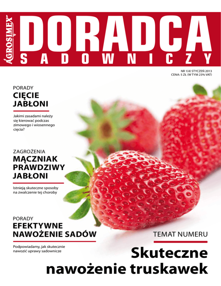doradca s a d o w n i c z y Nr 1(4) STYCZEŃ 2013 cena: 5 zł (w tym 23% Vat) porady CIĘCIE JABŁONI Jakimi zasadami należy się kierować podczas zimowego i wiosennego cięcia? zagrożenia MĄCZNIAK PRAWDZIWY JABŁONI Istnieją skuteczne sposoby na zwalczenie tej choroby porady EFEKTYWNE NAWOŻENIE SADÓW temat numeru Skuteczne nawożenie truskawek Podpowiadamy, jak skutecznie nawozić uprawy sadownicze 3 spis treści 16 NAWOŻENIE 10 temat numeru TRUSKAWEK doradca edytorial Drodzy Czytelnicy Oddajemy do Waszych rąk kolejny numer magazynu Doradca Sadowniczy. W tym wydaniu wiele miejsca poświęcamy nawożeniu: przypominamy zasady, jakimi należy się kierować nawożąc truskawki oraz omawiamy program nawożenia jabłoni. Zastanawiamy się także nad tym jak nawozić efektywnie i oszczędnie. W Doradcy nie zabraknie także informacji o ochronie roślin. Mączniak często bywa lekceważony, lecz w 2012 roku stanowił on w wielu sadach duży problem. 24 Foto na okładce: Shutterstock.com; Foto: Archiwum Agrosimex, Shutterstock.com 4 6 9 10 12 14 aktualności Nadchodzące wydarzenia na półce Nowości na rynku pod lupą Żyzność gleby porady Zakładanie sadu Ponadto zajmiemy się prześwietlaniem jabłoni w praktyce. Zachęcamy do lektury, Piotr Barański redaktor naczelny 16 24 30 32 wywiad W ślad za innowacją technologie 36 temat numeru Nawożenie truskawek zagrożenia Mączniak prawdziwy jabłoni zagrożenia 38 42 44 Flint Plus 64 WG porady 46 Podstawowe zasady efektywnego nawożenia sadów nawożenie 48 nawożenie Program nawożenia jabłoni Wywiad z ekspertem Fertygacja i jej nowe perspektywy Od kuchni W fabryce nawozów Agronutrition Leksykon sadowniczy Niedobory pierwiastków Rozrywka Krzyżówka Delsol Rusztowania sadownicze na palach drewnianych Wydawca: Agrosimex sp. z o.o., Goliany 43, 05-620 Błędów, kontakt: tel. +48 48 66 80 471/481, faks +48 48 66 80 835, [email protected]; Zarząd: Leszek Barański, Wiesława Barańska; Redaktor naczelny: Piotr Barański. Projekt, redakcja, opracowanie graficzne: Concept Publishing Polska sp. z o.o., al. J. Ch. Szucha 8, 00-580 Warszawa, tel. +48 22 627 26 60, faks +48 22 627 26 71, [email protected], www.cppolska.com.pl; Zarząd: Rafał Plewiński, Erika Oley, Łukasz Skalski; Obsługa klienta: Mariusz Duliński; Redakcja: Redaktor prowadząca: Julia Sawicka; Dyrektor wydawnicza: Anna Kowalczyk; Korekta: Ewa Nowacka, Kinga Gruca; Opracowanie graficzne: Marta Marciniak, Marzena Lipińska; Fotoedycja: Bartłomiej Molga; DTP: Concept Publishing Polska. Za treść reklam i ogłoszeń redakcja nie odpowiada. Redakcja nie zwraca materiałów niezamówionych. doradca 4aktualności Original Löwe na spotkaniach sadowniczych – będą rabaty i gadżety Niemiecki producent profesjonalnych sekatorów sadowniczych Original Löwe będzie jednym z partnerów Regionalnych Konferencji Sadowniczych organizowanych przez Agrosimex. Uczestnicy spotkań będą mogli skorzystać z atrakcyjnych ofert specjalnych oraz otrzymać ciekawe nagrody w organizowanych konkursach. Oprócz konferencji Agrosimeksu Original Löwe pojawi się także na MTAS i TSW w Warszawie oraz na Spotkaniu Sadowniczym w Sandomierzu. Kalendarium wydarzeń IX Międzynarodowe Targi Agrotechniki Sadowniczej 11–12 stycznia 2013 r., Warszawa Konferencja Truskawkowa Agrosimex 19 stycznia 2013 r., Jasieniec Regionalna Konferencja Sadownicza Agrosimex 23 stycznia 2013 r., Biała Rawska Regionalna Konferencja Sadownicza Agrosimex 24 stycznia 2013 r., Warka Regionalna Konferencja Sadownicza Agrosimex 25 stycznia 2013 r., Brześć Kujawski 19-20 lutego 2013 r. TARGI SADOWNICTWA I WARZYWNICTWA z częścią konferencyjną Regionalna Konferencja Sadownicza Agrosimex 26 stycznia 2013 r., Goszczyn XXII Spotkanie Sadownicze Sandomierz 2013, 30–31 stycznia 2013 r., Sandomierz tsw w lutym Regionalna Konferencja Sadownicza Agrosimex 7 lutego 2013 r., Pobórka Wielka Targi Sadownictwa i Warzywnictwa odbędą się w 2013 roku już po raz trzeci. Tym razem wydarzenie odbędzie się 19 i 20 lutego. Organizatorem jest wydawnictwo Oikos z Warszawy. Planowane jest dalsze poszerzanie tematyki targów – w szczególności o uprawy warzywnicze. Impreza odbędzie się na terenie Expo XXI, ul. Prądzyńskiego 12/14 w Warszawie. 56. Ogólnopolska Konferencja Ochrony Roślin Sadowniczych 14–15 lutego 2013 r., Rawa Mazowiecka Targi Sadownictwa i Warzywnictwa TSW 19–20 lutego 2013 r., Warszawa Regionalna Konferencja Sadownicza Agrosimex 26 lutego 2013 r., Grabanów Regionalna Konferencja Sadownicza Agrosimex 28 lutego 2013 r., Trzebnica Szczegółowe informacje na temat poszczególnych wydarzeń znajdą Państwo na stronie: www.doradztwosadownicze.pl O Rosahumusie w Internecie Pod internetowym adresem www.rosahumus.pl powstała nowa strona, na której zgromadzono wiele cennych informacji o Rosahumusie. Nawóz ten służy do poprawy właściwości gleby i cieszy się dziś uznaniem wielu rolników. – Kiedy po raz pierwszy sprowadziliśmy Rosahumus do Polski, stosowanie kwasów humusowych było zupełną nowością. Postanowiliśmy dokładnie zbadać ten nawóz, aby poznać, w jaki sposób można optymalnie go stosować oraz jak dobrych rezultatów można się spodziewać – informuje Piotr Murat z działu nawozów w firmie Agrosimex. – Pierwsze doświadczenia przeprowadziliśmy w 2005 roku w uprawach sadowniczych. Później Rosahumus był badany w uprawie warzyw, zbóż, rzepaku, roślin ozdobnych, a nawet ziół! Do dziś przeprowadzono kilkadziesiąt doświadczeń, których wyniki prezentujemy na nowej stronie internetowej – dodaje Piotr Murat. Na stronie Rosahumusu można znaleźć także szczegółowe informacje o produkcie i sposobach jego działania, zalecenia dotyczące stosowania, a także opinie rolników, którzy już zastosowali ten nawóz w celu poprawy żyzności gleby. 56. Konferencja Ochrony Roślin Sadowniczych w Ossie 14–15 lutego 2013 r. w Centrum Konferencyjnym w Ossie koło Rawy