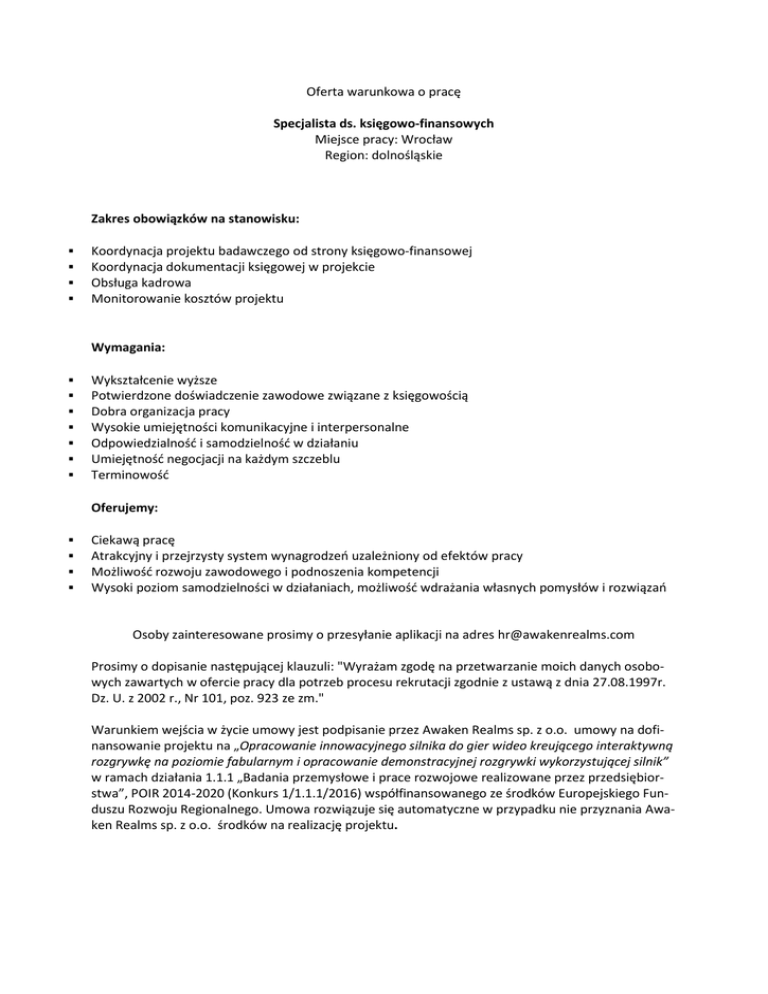 Oferta warunkowa o pracę Specjalista ds. księgowo-finansowych Miejsce pracy: Wrocław Region: dolnośląskie Zakres obowiązków na stanowisku: Koordynacja projektu badawczego od strony księgowo-finansowej Koordynacja dokumentacji księgowej w projekcie Obsługa kadrowa Monitorowanie kosztów projektu Wymagania: Wykształcenie wyższe Potwierdzone doświadczenie zawodowe związane z księgowością Dobra organizacja pracy Wysokie umiejętności komunikacyjne i interpersonalne Odpowiedzialność i samodzielność w działaniu Umiejętność negocjacji na każdym szczeblu Terminowość Oferujemy: Ciekawą pracę Atrakcyjny i przejrzysty system wynagrodzeń uzależniony od efektów pracy Możliwość rozwoju zawodowego i podnoszenia kompetencji Wysoki poziom samodzielności w działaniach, możliwość wdrażania własnych pomysłów i rozwiązań Osoby zainteresowane prosimy o przesyłanie aplikacji na adres [email protected] Prosimy o dopisanie następującej klauzuli: "Wyrażam zgodę na przetwarzanie moich danych osobowych zawartych w ofercie pracy dla potrzeb procesu rekrutacji zgodnie z ustawą z dnia 27.08.1997r. Dz. U. z 2002 r., Nr 101, poz. 923 ze zm." Warunkiem wejścia w życie umowy jest podpisanie przez Awaken Realms sp. z o.o. umowy na dofinansowanie projektu na „Opracowanie innowacyjnego silnika do gier wideo kreującego interaktywną rozgrywkę na poziomie fabularnym i opracowanie demonstracyjnej rozgrywki wykorzystującej silnik” w ramach działania 1.1.1 „Badania przemysłowe i prace rozwojowe realizowane przez przedsiębiorstwa”, POIR 2014-2020 (Konkurs 1/1.1.1/2016) współfinansowanego ze środków Europejskiego Funduszu Rozwoju Regionalnego. Umowa rozwiązuje się automatyczne w przypadku nie przyznania Awaken Realms sp. z o.o. środków na realizację projektu.