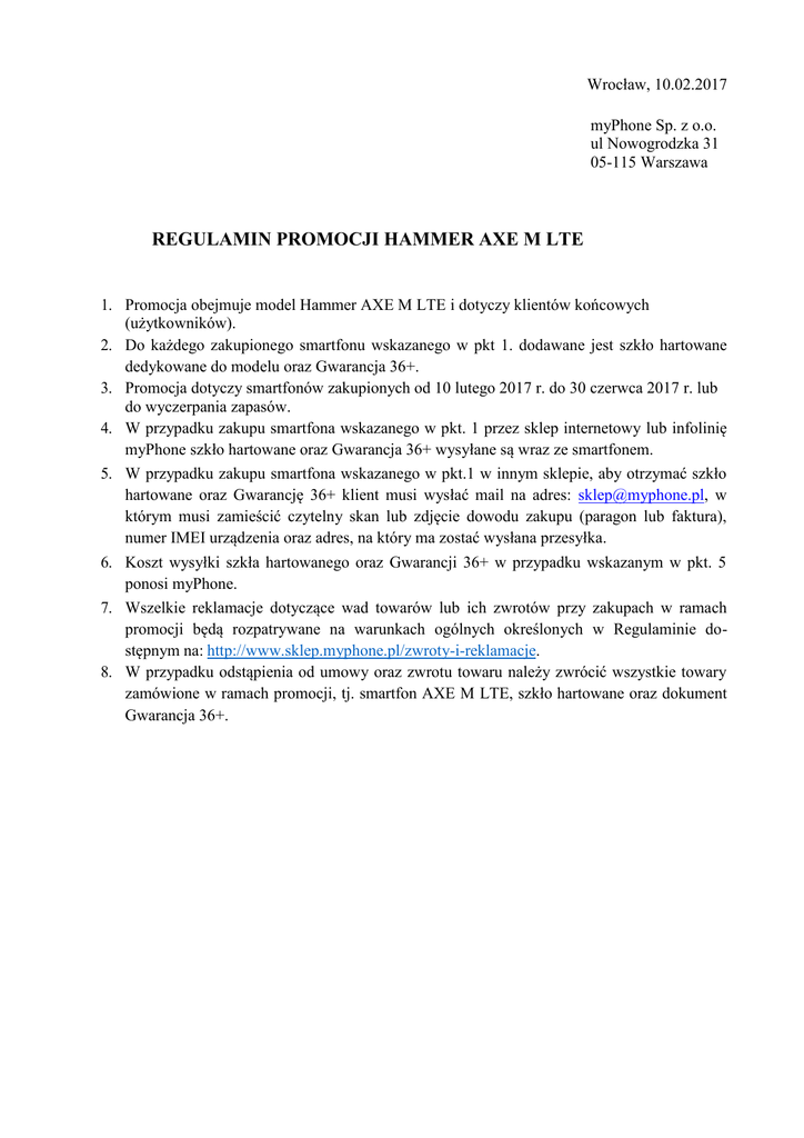 Wrocław, 10.02.2017 myPhone Sp. z o.o. ul Nowogrodzka 31 05-115 Warszawa REGULAMIN PROMOCJI HAMMER AXE M LTE 1. Promocja obejmuje model Hammer AXE M LTE i dotyczy klientów końcowych (użytkowników). 2. Do każdego zakupionego smartfonu wskazanego w pkt 1. dodawane jest szkło hartowane dedykowane do modelu oraz Gwarancja 36+. 3. Promocja dotyczy smartfonów zakupionych od 10 lutego 2017 r. do 30 czerwca 2017 r. lub do wyczerpania zapasów. 4. W przypadku zakupu smartfona wskazanego w pkt. 1 przez sklep internetowy lub infolinię myPhone szkło hartowane oraz Gwarancja 36+ wysyłane są wraz ze smartfonem. 5. W przypadku zakupu smartfona wskazanego w pkt.1 w innym sklepie, aby otrzymać szkło hartowane oraz Gwarancję 36+ klient musi wysłać mail na adres: [email protected], w którym musi zamieścić czytelny skan lub zdjęcie dowodu zakupu (paragon lub faktura), numer IMEI urządzenia oraz adres, na który ma zostać wysłana przesyłka. 6. Koszt wysyłki szkła hartowanego oraz Gwarancji 36+ w przypadku wskazanym w pkt. 5 ponosi myPhone. 7. Wszelkie reklamacje dotyczące wad towarów lub ich zwrotów przy zakupach w ramach promocji będą rozpatrywane na warunkach ogólnych określonych w Regulaminie dostępnym na: http://www.sklep.myphone.pl/zwroty-i-reklamacje. 8. W przypadku odstąpienia od umowy oraz zwrotu towaru należy zwrócić wszystkie towary zamówione w ramach promocji, tj. smartfon AXE M LTE, szkło hartowane oraz dokument Gwarancja 36+.
