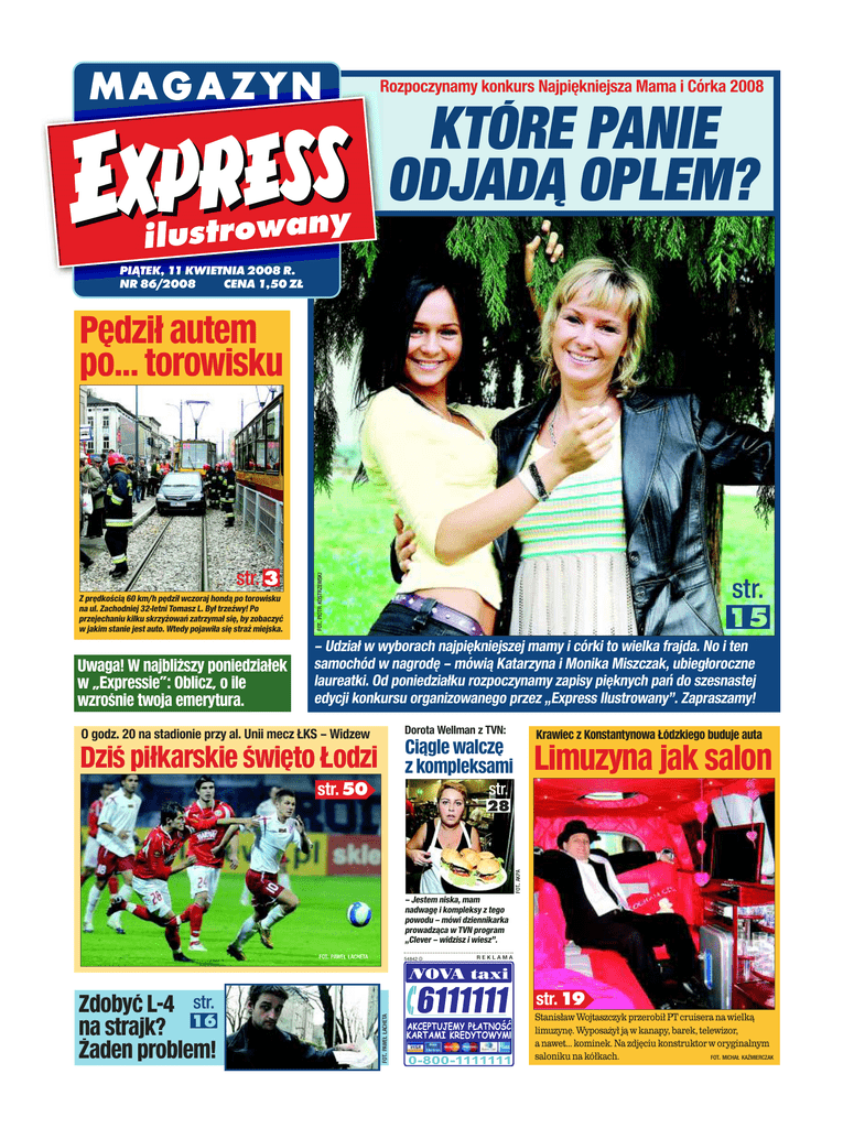Rozpoczynamy konkurs Najpiękniejsza Mama i Córka 2008 KTÓRE PANIE ODJADĄ OPLEM? PIĄTEK, 11 KWIETNIA 2008 R. NR 86/2008 CENA 1,50 ZŁ Pędził autem po... torowisku Z prędkością 60 km/h pędził wczoraj hondą po torowisku na ul. Zachodniej 32-letni Tomasz L. Był trzeźwy! Po przejechaniu kilku skrzyżowań zatrzymał się, by zobaczyć w jakim stanie jest auto. Wtedy pojawiła się straż miejska. FOT. PIOTR KOSTRZEWSKI str. 3 Uwaga! W najbliższy poniedziałek w „Expressie”: Oblicz, o ile wzrośnie twoja emerytura. – Udział w wyborach najpiękniejszej mamy i córki to wielka frajda. No i ten samochód w nagrodę – mówią Katarzyna i Monika Miszczak, ubiegłoroczne laureatki. Od poniedziałku rozpoczynamy zapisy pięknych pań do szesnastej edycji konkursu organizowanego przez „Express Ilustrowany”. Zapraszamy! str. 15 Dorota Wellman z TVN: O godz. 20 na stadionie przy al. Unii mecz ŁKS – Widzew Ciągle walczę z kompleksami Dziś piłkarskie święto Łodzi Krawiec z Konstantynowa Łódzkiego buduje auta Limuzyna jak salon str. str. 50 FOT. AKPA 28 – Jestem niska, mam nadwagę i kompleksy z tego powodu – mówi dziennikarka prowadząca w TVN program „Clever – widzisz i wiesz”. FOT. PAWEŁ ŁACHETA REKLAMA str. 19 FOT. PAWEŁ ŁACHETA Zdobyć L-4 str. na strajk? 16 Żaden problem! 54842-D Stanisław Wojtaszczyk przerobił PT cruisera na wielką limuzynę. Wyposażył ją w kanapy, barek, telewizor, a nawet... kominek. Na zdjęciu konstruktor w oryginalnym saloniku na kółkach. FOT. MICHAŁ KAŹMIERCZAK