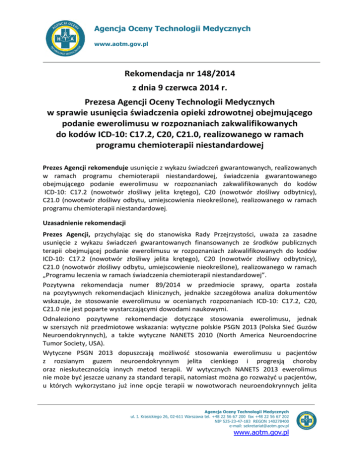 Agencja Oceny Technologii Medycznych www.aotm.gov.pl Rekomendacja nr 148/2014 z dnia 9 czerwca 2014 r. Prezesa Agencji Oceny Technologii Medycznych w sprawie usunięcia świadczenia opieki zdrowotnej obejmującego podanie ewerolimusu w rozpoznaniach zakwalifikowanych do kodów ICD-10: C17.2, C20, C21.0, realizowanego w ramach programu chemioterapii niestandardowej Prezes Agencji rekomenduje usunięcie z wykazu świadczeń gwarantowanych, realizowanych w ramach programu chemioterapii niestandardowej, świadczenia gwarantowanego obejmującego podanie ewerolimusu w rozpoznaniach zakwalifikowanych do kodów ICD-10: C17.2 (nowotwór złośliwy jelita krętego), C20 (nowotwór złośliwy odbytnicy), C21.0 (nowotwór złośliwy odbytu, umiejscowienia nieokreślone), realizowanego w ramach programu chemioterapii niestandardowej. Uzasadnienie rekomendacji Prezes Agencji, przychylając się do stanowiska Rady Przejrzystości, uważa za zasadne usunięcie z wykazu świadczeń gwarantowanych finansowanych ze środków publicznych terapii obejmującej podanie ewerolimusu w rozpoznaniach zakwalifikowanych do kodów ICD-10: C17.2 (nowotwór złośliwy jelita krętego), C20 (nowotwór złośliwy odbytnicy), C21.0 (nowotwór złośliwy odbytu, umiejscowienie nieokreślone), realizowanego w ramach „Programu leczenia w ramach świadczenia chemioterapii niestandardowej”. Pozytywna rekomendacja numer 89/2014 w przedmiocie sprawy, oparta została na pozytywnych rekomendacjach klinicznych, jednakże szczegółowa analiza dokumentów wskazuje, że stosowanie ewerolimusu w ocenianych rozpoznaniach ICD-10: C17.2, C20, C21.0 nie jest poparte wystarczającymi dowodami naukowymi. Odnaleziono pozytywne rekomendacje dotyczące stosowania ewerolimusu, jednak w szerszych niż przedmiotowe wskazania: wytyczne polskie PSGN 2013 (Polska Sieć Guzów Neuroendokrynnych), a także wytyczne NANETS 2010 (North America Neuroendocrine Tumor Society, USA). Wytyczne PSGN 2013 dopuszczają możliwość stosowania ewerolimusu u pacjentów z rozsianym guzem neuroendokrynnym jelita cienkiego i progresją choroby oraz nieskutecznością innych metod terapii. W wytycznych NANETS 2013 ewerolimus nie może być jeszcze uznany za standard terapii, natomiast można go rozważyć u pacjentów, u których wykorzystano już inne opcje terapii w nowotworach neuroendokrynnych jelita Agencja Oceny Technologii Medycznych ul. I. Krasickiego 26, 02-611 Warszawa tel. +48 22 56 67 200 fax +48 22 56 67 202 NIP 525-23-47-183 REGON 140278400 e-mail: [email protected] www.aotm.gov.pl Rekomendacja nr 148/2014 Prezesa AOTM z dnia 9 czerwca 2014 r. cienkiego. Wytyczne NANETS są oparte na konsensusie ekspertów, nie na przeglądzie systematycznym, co obniża ich jakość. Badaniem, na którym oparto tę rekomendację dla jelita cienkiego jest badanie Yao z 2008 roku. Jest to badanie II fazy w którym leczono pacjentów z nieresekcyjnymi lub przerzutowymi lokoregionalnymi nowotworami neuroendokrynnymi w różnym stopniu zaawansowania, o różnym umiejscowieniu (okolice żołądka, płuca, grasica, trzustka, jelito cienkie, odbytnica oraz okolice nerek). Uzyskane wyniki podano zbiorczo bez rozróżnienia pod względem umiejscowienia nowotworu. Nie jest zatem możliwe wnioskowanie na temat skuteczności ewerolimusu w grupie pacjentów w przedmiotowym wskazaniu na podstawie badania Yao 2008. Wytyczne PSGN 2013 także oparte są na konsensusie ekspertów oraz na danych statystycznych, zgodnie z którymi „jelito cienkie, a przede wszystkim jelito kręte jest miejscem najczęstszego występowania tych nowotworów”. W wytycznych tych podkreślono, że część odnosząca się do możliwości zastosowania ewerolimusu oparta jest na danych niskiej jakości (poziom 4 dowodów wg Centre for Evidence Based Medicine). Odnalezione rekomendacje kliniczne są niskiej jakości i charakteryzują się znaczącymi ograniczeniami. Nie odnaleziono żadnych rekomendacji finansowych dotyczących finansowania ewerolimusu w przedmiotowych wskazaniach. Przedmiotowe zlecenie, obejmujące klasyfikacje nowotworu ze względu na lokalizację, a nie typ nowotworu, utrudnia przeprowadzenie rzetelnej analizy. Przedmiot wniosku Wniosek dotyczy usunięcia świadczenia opieki zdrowotnej z wykazu świadczeń gwarantowanych, obejmującego podanie ewerolimusu w rozpoznaniach zakwalifikowanych do kodów ICD-10: C17.2, C20, C21.0 , realizowanego w ramach programu chemioterapii niestandardowej. Problem zdrowotny Nowotwory złośliwe jelita krętego (ICD-10: C17.2) W 2011 roku wg Krajowego Rejestru Nowotworów w Polsce to rozpoznanie dotyczyło 128 mężczyzn i 124 kobiet (standaryzowany współczynnik zachorowalności wynosi, odpowiednio, 0,5 i 0,3/100 tys./rok). Wyższe ryzyko wystąpienia raka jelita cienkiego towarzyszy chorobie Leśniowskiego-Crohna, u chorych z polipami sporadycznymi, zespołem polipowatości rodzinnej, zespołem Lyncha, zespołem Peutz-Jeghersa oraz chorobą trzewną i AIDS. Do czynników zwiększających prawdopodobieństwo zachorowania należą przebyta cholecystektomia, palenie tytoniu i spożywanie alkoholu. Objawy przez długi czas są niespecyficzne, co powoduje opóźnienie postawienia prawidłowej diagnozy o 6–8 miesięcy. Nowotwory jelita cienkiego często powodują zwężenie światła jelita, a także wgłobienie i niedrożność, rzadziej — napadowe (poposiłkowe) bóle brzucha oraz jawne lub utajone krwawienia do przewodu pokarmowego. U części chorych występuje utrata masy ciała, a w badaniu przedmiotowym wyczuwa się ruchomy guz w jamie brzusznej. Nowotwory złośliwe odbytnicy (ICD-10: C20) To rak jelita grubego będący w większości przypadków gruczolakorakiem zbudowanym ze struktur cewkowych. Nowotwory odbytnicy stanowią 30-50% raków jelita grubego. Raka odbytnicy rozpoznano w 2011 roku wg Krajowego Rejestru Nowotworów w Polsce u 5708 osób (3461 mężczyzn i 2247 kobiet), odnotowując z tego powodu 3117 zgonów (1842 mężczyzn i 1275 kobiet