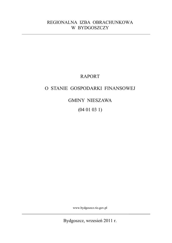 REGIONALNA IZBA OBRACHUNKOWA W BYDGOSZCZY RAPORT O STANIE GOSPODARKI FINANSOWEJ GMINY NIESZAWA (04 01 03 1) www.bydgoszcz.rio.gov.pl Bydgoszcz, wrzesień 2011 r. Regionalna Izba Obrachunkowa w Bydgoszczy, działając na podstawie przepisu art. 10a ustawy z dnia 7 października 1992 r. o regionalnych izbach obrachunkowych (Dz. U. z 2001 r. Nr 55, poz. 577 z późn. zm. – dalej ustawa), przedkłada Raport o stanie gospodarki finansowej Gminy Nieszawa na dzień 30 czerwca 2011 r., przyjęty przez Kolegium Izby uchwałą Nr XX/50/2011 z dnia 26 września 2011 r. Niniejszy Raport opracowany został na podstawie wyników działalności nadzorczej, kontrolnej i opiniodawczej z wykorzystaniem danych sprawozdawczych oraz informacji zamieszczonych w Biuletynie Informacji Publicznej Gminy Nieszawa. W Raporcie scharakteryzowano sytuację finansową Gminy w latach 2008 - 2010 i I półroczu 2011 r. oraz dokonano oceny prawidłowości działań w zakresie planowania i wykonania budżetu. Ponadto, omówiono działalność nadzorczą, opiniodawczą oraz wyniki kompleksowej kontroli gospodarki finansowej. Raport został opracowany w związku z pogarszającą się sytuacją finansową Gminy Nieszawa i zaistnieniem realnej groźby utraty płynności finansowej, która zagrażać może realizacji obligatoryjnych zadań Gminy. W latach 2008 - 2010 i I półroczu 2011 r. w strukturze wykonanych wydatków ogółem najwięcej środków budżetowych zaangażowano na realizację zadań z zakresu oświaty. Z analizy wydatków na oświatę wynika, że otrzymywana przez Gminę część oświatowa subwencji ogólnej nie wystarczała na pokrycie kosztów prowadzenia placówek oświatowych, w związku z czym Gmina zmuszona była przeznaczać na wydatki bieżące w oświacie środki własne, które z roku na rok sukcesywnie wzrastały. W Gminie Nieszawa oprócz szkoły podstawowej i gimnazjum, których prowadzenie należy do zadań obligatoryjnych Gminy, funkcjonuje, przejęte od powiatu, Liceum Ogólnokształcące, na utrzymanie którego Gmina w latach 2008 - I półrocze 2011 r. z własnych środków wyasygnowała kwotę około 830 tys. zł. Poprawa stanu gospodarki finansowej Gminy wymaga opracowania, a następnie wdrożenia programu naprawczego określającego konkretne działania, sposób i harmonogram ich realizacji oraz efekty finansowe. Raport ten spełni swój cel, jeżeli zawarty w nim opis stanu gospodarki finansowej Gminy Nieszawa, z przedstawionymi nieprawidłowościami i zagrożeniami dla realizacji zadań Gminy, przyczyni się do większej determinacji władz samorządowych w realizacji naprawy jej finansów. 4 Spis treści Spis treści 1. Ogólna charakterystyka Gminy Nieszawa ............................................................5 1.1. Organizacja i zasady działania...................................................................................... 6 1.2. Zakres realizowanych zadań ......................................................................................... 7 1.3. Mienie komunalne......................................................................................................... 7 2. Działalność nadzorcza i opiniodawcza Regionalnej Izby Obrachunkowej w Bydgoszczy............................................................................................................8 3. Wyniki przeprowadzonych przez Regionalną Izbę Obrachunkową w Bydgoszczy kontroli gospodarki finansowej Gminy ......................................10 3.1. Kontrole zrealizowane ................................................................................................ 10 3.2. Wyniki kontroli ........................................................................................................... 10 3.3. Działania pokontrolne ................................................................................................. 13 4. Realizacja dochodów budżetowych......................................................................13 5. Realizacja wydatków budżetowych .....................................................................17 5.1. Wydatki w oświacie .................................................................................................... 20 6. Wynik budżetu i źródła jego finansowania .........................................................24 7. Zadłużenie Gminy Nieszawa w latach 2008 - 2010 i w I półroczu 2011 r. ......25 8. Wynik operacyjny..................................................................................................26 9. Podsumowanie i wnioski .......................................................................................27 Raport o stanie gospodarki finansowej Gminy Nieszawa 5 1. Ogólna charakterystyka Gminy Nieszawa Nieszawa to gmina miejska w województwie kujawsko-pomorskim, w powiecie aleksandrowskim, położona na lewym brzegu Wisły w jej pradolinie, na krańcach Kujaw w połowie drogi między Włocławkiem i Toruniem. Gmina Nieszawa jest najmniejszą pod względem ludności gminą województwa kujawsko-pomorskiego i jedną z najmniejszych gmin miejskich w Polsce. Zajmuje powierzchnię 986 ha i graniczy z gminami: Waganiec, Raciążek (powiat aleksandrowski). Wschodnią granicę Nieszawy stanowi rzeka Wisła. Pod względem zagospodarowania terenów w Gminie przeważają użytki rolne, które zajmują 73,3% powierzchni, lasy stanowią 5,1% i pozostałe użytki 21,6%. Pomimo to, Gmina ma charakter miejski, a rolnictwo nie odgrywa w jej gospodarce większej roli. Na terenie Gminy zarejestrowanych jest: − 115 osób fizycznych prowadzących działalność gospodarczą, − 12 spółek handlowych (w tym jedna z udziałem kapitału zagranicznego), − 1 spółdzielnia, − 1 fundacja, − 5 stowarzyszeń. Według danych sprawozdawczych, w 2010 r. dochody ogółem Gminy przypadające na jednego mieszkańca wyniosły 3 344 zł i wzrosły w stosunku do roku poprzedniego o 356 zł. Dochody własne na jednego mieszkańca wyniosły 
