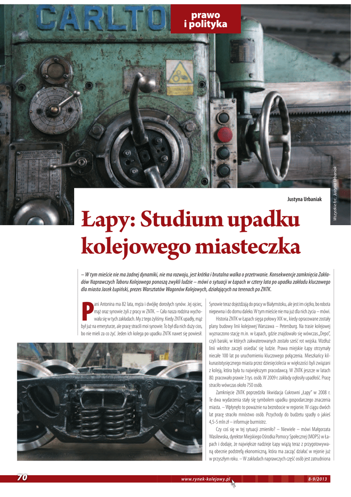 Justyna Urbaniak Łapy: Studium upadku kolejowego miasteczka – W tym mieście nie ma żadnej dynamiki, nie ma rozwoju, jest krótka i brutalna walka o przetrwanie. Konsekwencje zamknięcia Zakładów Naprawczych Taboru Kolejowego ponoszą zwykli ludzie – mówi o sytuacji w Łapach w cztery lata po upadku zakładu kluczowego dla miasta Jacek Łupiński, prezes Warsztatów Wagonów Kolejowych, działających na terenach po ZNTK. P ani Antonina ma 82 lata, męża i dwójkę dorosłych synów. Jej ojciec, mąż oraz synowie żyli z pracy w ZNTK. – Cała nasza rodzina wychowała się w tych zakładach. My z tego żyliśmy. Kiedy ZNTK upadły, mąż był już na emeryturze, ale pracę stracili moi synowie. To był dla nich duży cios, bo nie mieli za co żyć. Jeden ich kolega po upadku ZNTK nawet się powiesił. 70 Synowie teraz dojeżdżają do pracy w Białymstoku, ale jest im ciężko, bo robota niepewna i do domu daleko. W tym mieście nie ma już dla nich życia – mówi. Historia ZNTK w Łapach sięga połowy XIX w., kiedy opracowane zostały plany budowy linii kolejowej Warszawa – Petersburg. Na trasie kolejowej wyznaczono stację m.in. w Łapach, gdzie znajdowało się wówczas „Depo”, czyli baraki, w których zakwaterowanych zostało sześć rot wojska. Wzdłuż linii wkrótce zaczęli osiedlać się ludzie. Prawa miejskie Łapy otrzymały niecałe 100 lat po uruchomieniu kluczowego połączenia. Mieszkańcy kilkunastotysięcznego miasta przez dziesięciolecia w większości byli związani z koleją, która była tu największym pracodawcą. W ZNTK jeszcze w latach 80. pracowało prawie 3 tys. osób. W 2009 r. zakłady ogłosiły upadłość. Pracę straciło wówczas około 750 osób. Zamknięcie ZNTK poprzedziła likwidacja Cukrowni „Łapy” w 2008 r. Te dwa wydarzenia stały się symbolem upadku gospodarczego znaczenia miasta. – Wpłynęło to poważnie na bezrobocie w regionie. W ciągu dwóch lat pracę straciło mnóstwo osób. Przychody do budżetu spadły o jakieś 4,5-5 mln zł – informuje burmistrz. Czy coś się w tej sytuacji zmieniło? – Niewiele – mówi Małgorzata Wasilewska, dyrektor Miejskiego Ośrodka Pomocy Społecznej (MOPS) w Łapach i dodaje, że największe nadzieje Łapy wiążą teraz z przygotowywaną obecnie podstrefą ekonomiczną, która ma zacząć działać w rejonie już w przyszłym roku. – W zakładach naprawczych część osób jest zatrudniona www.rynek-kolejowy.pl 8-9/2013 Wszystkie fot.: Justyna Urbaniak prawo i polityka prawo i polityka i pracuje, ale to już zakład prywatny. Część osób przeszła na świadczenia przedemerytalne, emerytury, część wyjechała. Jednak odsetek osób – 1500 rodzin, które pobierały pomoc społeczną po upadku ZNTK, utrzymuje się do tej pory. Część z tych osób znalazło zatrudnienie w Centrum Integracji Społecznej. Część pracuje w Zakładzie Usług Komunalnych, ale nadal mamy duże problemy z bezrobociem. Ponadto spora część mieszkańców szuka pracy poza Łapami, wyjeżdżając do dużych aglomeracji jak Warszawa, Poznań, Gdańsk czy Kraków. Wychodzenie z bezrobocia to proces długotrwały i wymaga lat – dodaje Wasilewska. Poważną konkurencją dla zakładów jest oferta małych firm, które zapewniają np. serwisy mobilne. Dodatkowo cześć przewoźników kolejowych wykonuje prace naprawcze i modernizacyjne we własnym zakresie. – Tak naprawdę zlikwidowano zaplecze techniczne kolei wagonów towarowych. Osobówka dzięki Pesie i Newagowi dobrze się rozwija, ale w transporcie towarowym zostają już tylko małe firmy. Nie ma już w Polsce takiego zakładu, który byłby w stanie kompleksowo naprawić kilkaset tysięcy wagonów. To zostało zniszczone. Konsekwencje tego ponoszą zwykli ludzie – wyjaśnia Łupiński. Łapy na skraju ubóstwa Z dotacji Miejskiego Ośrodka Pomocy Społecznej korzysta blisko 3,5 tys. osób. To prawie 15% wszystkich mieszkańców miasta i gminy. W największym ubóstwie żyją jednak byli pracownicy ZNTK, którzy, mając jeszcze pracę, przynosili do domu często mniej pieniędzy niż osoby, które od lat były na zasiłkach. Po upadku zakładu miasto, którego cała tradycja opierała się na kolei, zapadło w letarg i nie może się z niego wybudzić do dziś. Podejście obecnej władzy do sytuacji w Łapach krytycznie ocenia były burmistrz miasta – Roman Czepe. – Obecna władza ideę specjalnej strefy ekonomicznej w Łapach dopiero zaczyna realizować, gdy już na koniec kadencji w 2010 r. uzyskaliśmy na to 5 mln zł z urzędu marszałkowskiego. Dodatkowo likwidacja ZNTK trwa już cztery lata – od sierpnia 2009 r. To opóźnienie wejścia inwestorów, ale również kosztuje – komentuje Czepe. Przedstawiciele urzędu miasta mają jednak na ten temat zupełnie inne zdanie. Obecny burmistrz Łap, Wiktor Brzosko, wskazuje nawet, że bezrobocie w 2011 r. zmalało. Dodatkowym motorem dla mieszkańców miasta są utworzone przez byłego prezesa ZNTK Łapy Warsztaty Wagonów Kolejowych, które zatrudniają obecnie około 100 osób. Większość z nich to byli pracownicy upadłych zakładów. Firma buduje też terminal przeładunkowy, gdzie przeładowywane mają być kontenery na tiry i odwrotnie. Właścicielem warsztatów jest Jacek Łupiński, który wcześniej był prezesem ZNTK. – Moim marzeniem jest otwarcie zakładu, który dałby pracę dla 100, 150 osób. Chcę odtworzyć taki zakład jak ZNTK, tylko w mniejszej skali. Pozyskanie wagonów wiąże się jednak z dostępem do infrastruktury. My leżymy na północnym wschodzie kraju, a przesłanie wagonów do nas kosztuje. Wagony są bowiem na południu Polski – mówi o trudnościach w prowadzeniu interesu Łupiński i dodaje: – Obecnie mamy kilka firm, z którymi podpisaliśmy kontrakty. Nie są to jednak kontrakty, które pozwoliłyby na ustawienie firmy do końca roku. Pozyskujemy klientów na miesiąc, czasem dwa. Udaje nam się wygrać większość przetargów, 