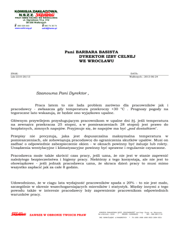 ul. Ogrodowa 15 p. 312 58-306 Wałbrzych 885 526 000 www.solid.org.pl 880 74 36 74 [email protected] Pani BARBARA BASISTA DYREKTOR IZBY CELNEJ WE WROCŁAWU ZNAK: Ldz-2210-20/13 DATA: Wałbrzych ; 2013-06-24 Szanowna Pani Dyrektor , Praca latem to nie lada problem zarówno dla pracowników jak i pracodawcy - zwłaszcza gdy temperatura przekroczy +30 °C . Prognozy pogody na tegoroczne lato wskazują, że będzie ono wyjątkowo upalne. Głównym przywilejem przysługującym pracownikom w upalne dni (tj. jeśli temperatura na zewnątrz przekracza 25 stopni, a w pomieszczeniach 28 stopni) jest prawo do bezpłatnych, zimnych napojów. Przyjmuje się, że napojów ma być „pod dostatkiem". Przepisy nie precyzują, jaka jest dopuszczalna maksymalna temperatura w pomieszczeniach, ale zobowiązują pracodawcę do ograniczenia skutków upałów. Musi on zadbać o odpowiednie zabezpieczenie okien - w oknach powinny być żaluzje lub rolety. Urządzenia wentylacyjne i klimatyzacyjne powinny być sprawne i regularnie czyszczone. Pracodawca może także skrócić czas pracy, jeśli uzna, że nie jest w stanie zapewnić należytego bezpieczeństwa i higieny pracy. Niektórzy z tego korzystają, ale nie jest to obowiązkowe - jeśli jednak pracodawca uzna, że skraca dzień pracy to musi mimo wszystko zapłacić jak za całe 8 godzin. Udowodniono, że w ciągu lata wydajność pracowników spada o 20% - to nie jest mało, szczególnie w okresie wszechogarniających mierników i statystyk. Między innymi z tego powodu także w interesie pracodawcy leży zapewnienie pracownikom odpowiednich warunków pracy. ZAWSZE W OBRONIE TWOICH PRAW KOMISJA ZAKŁADOWA NSZZ „SOLIDARNOŚĆ” PRZY IZBIE CELNEJ WE WROCŁAWIU NR W REGIONIE – 2210 * REGON – 020696055 * NIP – 886 289 17 16 ING BANK ŚLĄSKI O/ WAŁBRZYCH * 70 1050 1908 1000 0023 2694 0521 Już pierwsze upalne dni pokazały, że w niektórych pomieszczeniach praca jest szczególnie uciążliwa. Funkcjonariusze skarżą się na uciążliwości z tym związane. Przykład – pomieszczenie UC w Wałbrzychu: - przed rozpoczęciem pracy + 30°C - godziny południowe + 35 °C Na marginesie warto także przedstawić krytyczne uwagi funkcjonariuszy celnych na temat umundurowania służbowego. Użyte tkaniny (duża zawartość tworzyw sztucznych) skutecznie uniemożliwiają właściwa regulację „oddychania” receptorów ciepła i zimna umiejscowionych w skórze oraz właściwą regulację temperatury organizmu poprzez wymianę ciepła w jednym lub w drugim kierunku. Biorąc powyższe pod uwagę, Komisja Zakładowa NSZZ „Solidarność” na podstawie art. 23 i art. 26 pkt.3) ustawy z 23 maja 1991 roku o związkach zawodowych, zwraca się z wnioskiem i prośbą o przeprowadzenie przez Służbę BHP Izby Celnej we Wrocławiu analizy warunków służby i pracy w zakresie ograniczenia skutków upałów. W szczególności wnosimy o analizę: czy wszyscy funkcjonariusze i pracownicy naszej Izby otrzymują zimne napoje i czy jest ich wystarczająca ilość; czy zabezpieczenie okien jest wystarczające, czy żaluzję są kompletne i sprawne, czy spełniają swoją rolę; czy urządzenia wentylacyjne i klimatyzacyjne są sprawne technicznie i regularnie czyszczone: czy klimatyzatory instaluje się w pomieszczeniach najbardziej narażonych na skutki upałów; uwag funkcjonariuszy na temat umundurowania służbowego. Uprzejmie prosimy o przedstawienia nam wniosków i zaleceń wynikających z przeprowadzania tych analiz oraz działań naprawczych w zakresie ograniczania skutków upałów. za KZ NSZZ „Solidarność ” : ZAWSZE W OBRONIE TWOICH PRAW KOMISJA ZAKŁADOWA NSZZ „SOLIDARNOŚĆ” PRZY IZBIE CELNEJ WE WROCŁAWIU NR W REGIONIE – 2210 * REGON – 020696055 * NIP – 886 289 17 16 ING BANK ŚLĄSKI O/ WAŁBRZYCH * 70 1050 1908 1000 0023 2694 0521