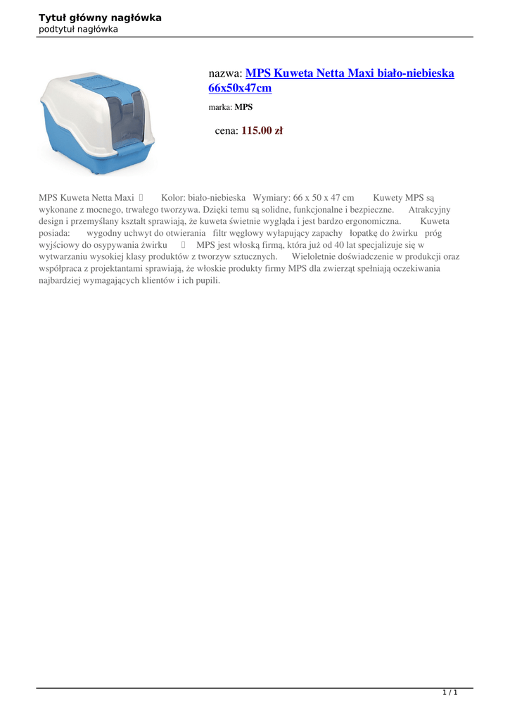 Tytuł główny nagłówka podtytuł nagłówka nazwa: MPS Kuweta Netta Maxi biało-niebieska 66x50x47cm marka: MPS cena: 115.00 zł MPS Kuweta Netta Maxi Kolor: biało-niebieska Wymiary: 66 x 50 x 47 cm Kuwety MPS są wykonane z mocnego, trwałego tworzywa. Dzięki temu są solidne, funkcjonalne i bezpieczne. Atrakcyjny design i przemyślany kształt sprawiają, że kuweta świetnie wygląda i jest bardzo ergonomiczna. Kuweta posiada: wygodny uchwyt do otwierania filtr węglowy wyłapujący zapachy łopatkę do żwirku próg wyjściowy do osypywania żwirku MPS jest włoską firmą, która już od 40 lat specjalizuje się w wytwarzaniu wysokiej klasy produktów z tworzyw sztucznych. Wieloletnie doświadczenie w produkcji oraz współpraca z projektantami sprawiają, że włoskie produkty firmy MPS dla zwierząt spełniają oczekiwania najbardziej wymagających klientów i ich pupili. 1/1