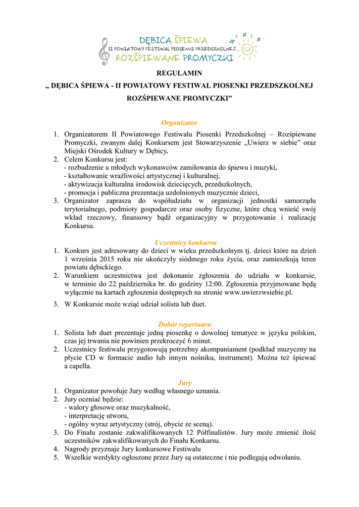 REGULAMIN „ DĘBICA ŚPIEWA - II POWIATOWY FESTIWAL PIOSENKI PRZEDSZKOLNEJ ROZŚPIEWANE PROMYCZKI” Organizator 1. Organizatorem II Powiatowego Festiwalu Piosenki Przedszkolnej – Rozśpiewane Promyczki, zwanym dalej Konkursem jest Stowarzyszenie „Uwierz w siebie” oraz Miejski Ośrodek Kultury w Dębicy. 2. Celem Konkursu jest: - rozbudzenie u młodych wykonawców zamiłowania do śpiewu i muzyki, - kształtowanie wrażliwości artystycznej i kulturalnej, - aktywizacja kulturalna środowisk dziecięcych, przedszkolnych, - promocja i publiczna prezentacja uzdolnionych muzycznie dzieci, 3. Organizator zaprasza do współudziału w organizacji jednostki samorządu terytorialnego, podmioty gospodarcze oraz osoby fizyczne, które chcą wnieść swój wkład rzeczowy, finansowy bądź organizacyjny w przygotowanie i realizację Konkursu. Uczestnicy konkursu 1. Konkurs jest adresowany do dzieci w wieku przedszkolnym tj. dzieci które na dzień 1 września 2015 roku nie ukończyły siódmego roku życia, oraz zamieszkują teren powiatu dębickiego. 2. Warunkiem uczestnictwa jest dokonanie zgłoszenia do udziału w konkursie, w terminie do 22 października br. do godziny 12:00. Zgłoszenia przyjmowane będą wyłącznie na kartach zgłoszenia dostępnych na stronie www.uwierzwsiebie.pl. 3. W Konkursie może wziąć udział solista lub duet. Dobór repertuaru 1. Solista lub duet prezentuje jedną piosenkę o dowolnej tematyce w języku polskim, czas jej trwania nie powinien przekroczyć 6 minut. 2. Uczestnicy festiwalu przygotowują potrzebny akompaniament (podkład muzyczny na płycie CD w formacie audio lub innym nośniku, instrument). Można też śpiewać a capella. 1. 2. 3. 4. 5. Jury Organizator powołuje Jury według własnego uznania. Jury oceniać będzie: - walory głosowe oraz muzykalność, - interpretację utworu, - ogólny wyraz artystyczny (strój, obycie ze sceną). Do Finału zostanie zakwalifikowanych 12 Półfinalistów. Jury może zmienić ilość uczestników zakwalifikowanych do Finału Konkursu. Nagrody przyznaje Jury konkursowe Festiwalu Wszelkie werdykty ogłoszone przez Jury są ostateczne i nie podlegają odwołaniu. Przebieg konkursu 1. Konkurs przebiega bez podziału na kategorie wiekowe i artystyczne (solista, duet). 2. Etap I - nadsyłanie zgłoszeń do 22 października 2015r. do godziny 12:00. Organizator do 26 października br. zamieści na stronie www.uwierzwsiebie.pl listę zakwalifikowanych uczestników Konkursu, wraz z terminem przesłuchań. 3. Etap II przesłuchania - półfinał konkursu odbędzie się 29 oraz 30 października br. w Domu Kultury „Śnieżka” w Dębicy. 4. Lista zakwalifikowanych Finalistów zostanie zamieszczona na stronie www.uwierzwsiebie.pl najpóźniej do 4 dni po ostatnich przesłuchaniach. 5. Wszyscy Finaliści nagrają wspólną płytę w studio nagrań, zostaną również przyznane nagrody rzeczowe oraz dyplomy. 6. Finał Konkursu odbędzie się 8 listopada br. w sali widowiskowej Miejskiego Ośrodka Kultury w Dębicy przy ul. Sportowej 28. 7. Organizator zastrzega sobie prawo do zamiany daty oraz miejsca finału Konkursu z przyczyn losowych. Postanowienia organizacyjne 1. Organizator zapewnia sprzęt nagłaśniający, pomoc techniczną i akustyczną. 2. Finalista ma obowiązek stawić się na konsultacje przed finałem Konkursu oraz uczestniczyć w próbie, która odbywać się będzie w miejscu i czasie wyznaczonym przez Organizatora. 3. Organizator zastrzega sobie prawo wyboru piosenek, jakie zaprezentują uczestnicy Finału. 4. Festiwal z przyczyn niezależnych od Organizatora może być w dowolnym momencie odwołany. 5. Organizator nie pokrywa kosztów dojazdu, ubezpieczenia, zakwaterowania ani wyżywienia uczestników. 6. Każdemu uczestnikowi na przesłuchaniach oraz Finale towarzyszy opiekun podany w karcie zgłoszenia (rodzic, nauczyciel). Postanowienia końcowe 1. Wszelkie kwestie nie ujęte w Regulaminie rozstrzyga Organizator. 2. Organizator zastrzega sobie prawo rejestracji audiowizualnej z przebiegu Konkursu dla celów archiwalnych oraz prezentacji w mediach. 3. Zgłoszenie do udziału w Festiwalu jest równoznaczne z akceptacją niniejszego Regulaminu. 4. Organizator zastrzega sobie prawo do dokonania zmian w niniejszym Regulaminie. 5. Regulamin wchodzi w życie z dniem ogłoszenia Konkursu przez Organizatora. 6. Przystąpienie do konkursu oznacza akceptację Regulaminu oraz wyrażenie zgody Uczestnika (prawnego opiekuna) na przechowywanie i przetwarzanie jego danych osobowych przez Organizatora (zgodnie z ustawą z dnia 29 sierpnia 1997r. o ochronie danych osobowych, Dz.U. z 2012 r., Nr 101 poz 962 z późn. zm.) w zakresie niezbędnym do przeprowadzenia niniejszego Konkursu. 7. Uczestnik (prawny opiekun) z chwilą nadesłania karty zgłoszenia wyraża zgodę na udostępnienie swojego wizerunku w mediach elektronicznych oraz prasie.