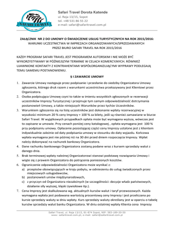 Safari Travel Dorota Katende ul. Reja 13/15, Sopot tel. +48 531 86 55 22 e-mail: [email protected] ZAŁĄCZNIK NR 2 DO UMOWY O ŚWIADCZENIE USŁUG TURYSTYCZNYCH NA ROK 2015/2016: WARUNKI UCZESTNICTWA W IMPREZACH ORGANIZOWANYCH/SPRZEDAWANYCH PRZEZ BIURO SAFARI TRAVEL NA ROK 2015/2016 KAŻDY PROGRAM SAFARI TRAVEL JEST PROGRAMEM AUTORSKIM I NIE MOŻE BYĆ WYKORZYSTYWANY W PÓŹNIEJSZYM TERMINIE W CELACH KOMERCYJNYCH. RÓWNIEŻ UJAWNIONE KONTAKTY Z KONTRAHENTAMI WSPÓŁORGANIZUJĄCYMI WYPRAWY PODLEGAJĄ TEMU SAMEMU POSTANOWIENIU. § I ZAWARCIE UMOWY 1. Zawarcie Umowy następuje przez podpisanie i przesłanie do siedziby Organizatora Umowy zgłoszenia, którego druk razem z warunkami uczestnictwa przekazywany jest Klientowi przez Organizatora. 2. Osoba podpisująca Umowę czyni to także w imieniu wszystkich zgłoszonych w rezerwacji uczestników Imprezy Turystycznej i przejmuje tym samym odpowiedzialność dotrzymania postanowień Umowy, a także niniejszych Warunków przez tychże Uczestników. 3. Warunkiem zgłoszenia się na listę uczestników jest dokonanie wpłaty rezerwacyjnej w wysokości minimum 20 % ceny Imprezy + 100 % za bilety, jeśli są również zamawiane w biurze Safari Travel. W wyjątkowych przypadkach opłata może być wymagana wyższa, wówczas jest to zapisane w umowie. Przy cenach poniżej ceny katalogowej , opłata wymagana jest 100 % przy podpisaniu umowy. Opłacenie pozostającej części ceny Imprezy ustalone jest z klientem indywidualnie zależnie od daty podpisania umowy w stosunku do daty wyjazdu. Końcowa wpłata wymagana jest nie później niż na 30 dni przed dniem rozpoczęcia Imprezy. Wpłat należy dokonywać na rachunek bankowy Organizatora. 4. Dane rachunku bankowego Organizatora zostaną podane wraz z kursem sprzedaży walut z danego dnia. 5. Brak terminowej wpłaty należnej Organizatorowi stanowi podstawę rozwiązania Umowy i wiąże się z prawem Organizatora do potrącenia poniesionych kosztów. 6. Ograniczenie odpowiedzialności Organizatora może wynikać z: a) przepisów obowiązujących w kraju pobytu, w odniesieniu do usług świadczonych przez miejscowych usługodawców, b) postanowień umów międzynarodowych, c) z przyczyn od Organizatora niezależnych (w szczególności: decyzje władz państwowych, działanie siły wyższej, klęski żywiołowe itp.). 7. Cena Imprezy jest skalkulowana wg. aktualnych kursów walut i taryf przewozowych. Każda wymagana wpłata jest podawana wartością procentową ceny Imprezy i jest przeliczana po kursie sprzedaży waluty w dniu wpłaty. Kurs sprzedaży waluty określany jest w oparciu o tabelę kursów sprzedaży walut banku Organizatora. W dniu ostatniej wpłaty Klienta cena Imprezy Safari Travel, ul. Reja 13/15, 81-874 Sopot, NIP: 583-189-20-50 www: safaritravel.com.pl; e-mail: [email protected] Safari Travel Dorota Katende ul. Reja 13/15, Sopot tel. +48 531 86 55 22 e-mail: [email protected] pozostała do zapłaty podana w procentach , zostaje przeliczona po kursie dnia wpłaty bieżącej sprzedaży walut. Klient wpłaca pozostała część w PLN 8. Cena Imprezy nie może ulec zmianie później niż na 20 dni przed data rozpoczęcia Imprezy. Przed tym okresem cena Imprezy może ulec zmianie z powodu następujących okoliczności: a) wzrostu kosztów transportu, b) wzrostu ceł, podatków lub opłat należnych za takie usługi jak lotniskowe, załadunkowe lub przeładunkowe w portach morskich i lotniczych itp., 9. Organizator ma prawo odwołania Imprezy bez ponoszenia odpowiedzialności w okolicznościach: a) zgłoszenia się mniejszej ilości liczby uczestników niż liczba minimalna określona każdorazowo przez Organizatora, a Organizator powiadomił o tym Klienta w terminie nie krótszym niż na 7 dni przed datą rozpoczęcia Imprezy, b) siły wyższej. 10. Uczestnik ma obowiązek informowania biura o zmianie nazwiska, adresu, czy wymianie paszportu, jeżeli zmiany takie będą wymagały poniesienia przez Organizatora kosztów uczestnik zobowiązuje się do poniesienia tych kosztów. § II REZYGNACJA Z IMPREZY 1. Klient ma prawo do rezygnacji lub zmiany terminu udziału w Imprezie składając pisemne oświadczenie w siedzibie Organizatora w dzień roboczy. Za datę rezygnacji przyjmuje się dzień wpływu oświadczenia do siedziby Organizatora. 2. Uczestnikowi przysługuje zwrot wpłaconej kwoty za świadczenia za granica po dokonaniu przez Organizatora potrąceń z tytułu poniesionych przez Organizatora kosztów i nakładów związanych z organizacją Imprezy. Kwota potrąceń zawsze, powyżej 45 dni od wyjazdu zgłoszenia rezygnacji, wynosi 500 zł od 1 osoby rezygnującej – są to koszty przygotowania i organizacji wyjazdu. Przy rezygnacji mniej niż 45 dni przed wyjazdem kwota potrąceń to min 20% ceny imprezy. Rezygnacja na mniej niż 30 dni przed wyjazdem jednoznaczna jest z potrąceniem 100% wartości imprezy, chyba że Klient wskaże inną osobę spełniającą wymagania do wyjazdu, która zgadza się podpisać umowę na tych samych warunkach i wyjechać w tym samym terminie. 3. W przypadku rezygnacji z udziału w Imprezie z przyczyn nie leżących po stronie Organizatora, Organizator dokonuje potrąceń zgodnie z pkt. 2. 4. Do przyczyn nie leżących po stronie Organizatora należą w szczególności: • Odmowa wydania wizy Klientowi, • Brak dokumentów uprawniających do przekraczania granicy przez Klienta, • Niedotrzymanie przez Klienta określonych w Umowie i Warunkach uczestnictwa terminów, • Nieprzybycie na zbiórkę Klienta, choroba Klienta lub inne przypadki losowe, • Uniemożliwienie Klientowi przekroczenia granicy przez służby graniczne, • Inne przyczyny nie przewidywalne. Safari Travel, ul. Reja 13/15, 81-874 Sopot, NIP: 583-189-20-50 www: safaritravel.com.pl; e-mail: [email protected] Safari Travel Dorota Katende ul. Reja 13/15, Sopot tel. +48 531 86 55 22 e-mail: [email protected] 5. W przypadku, gdy Klient rezygnujący z udziału w Imprezie wskaże osobę spe