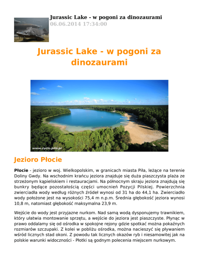 Jurassic Lake - w pogoni za dinozaurami 06.06.2014 17:34:00 Jurassic Lake - w pogoni za dinozaurami Jezioro Płocie Płocie - jezioro w woj. Wielkopolskim, w granicach miasta Piła, leżące na terenie Doliny Gwdy. Na wschodnim krańcu jeziora znajduje się duża piaszczysta plaża ze strzeżonym kąpieliskiem i restauracjami. Na północnym skraju jeziora znajdują się bunkry będące pozostałością części umocnień Pozycji Pilskiej. Powierzchnia zwierciadła wody według różnych źródeł wynosi od 31 ha do 44,1 ha. Zwierciadło wody położone jest na wysokości 75,4 m n.p.m. Średnia głębokość jeziora wynosi 10,8 m, natomiast głębokość maksymalna 23,9 m. Wejście do wody jest przyjazne nurkom. Nad samą wodą dysponujemy trawnikiem, który ułatwia montowanie sprzętu, a wejście do jeziora jest piaszczyste. Płynąc w prawo oddalamy się od ośrodka w spokojne rejony gdzie spotkać można pokaźnych rozmiarów szczupaki. Z kolei w pobliżu ośrodka, można nacieszyć się pływaniem wśród licznych stad okoni. Z powodu tak licznych okazów ryb i niesamowitej jak na polskie warunki widoczności - Płotki są godnym polecenia miejscem nurkowym. NOCLEGI Ośrodek zajmuje rozległy ogrodzony teren, otoczony sosnowo-świerkowym lasem. W ramach zabaw integracyjnych emocji dostarczą nocne podchody, paintball, jazda na quadach czy zjazdy na linie. Do dyspozycji Gości jest także wielofunkcyjne boisko oraz park linowy znajdujący się w naszym obiekcie. Do dyspozycji Gości: ● ● ● ● ● ● ● ● ● ● ● ● pokoje 1-, 2-, 3-osobowe oraz 3 apartamenty, wszystkie pokoje z łazienką, TV, radiem, telefonem, klimatyzowana sala restauracyjna, chata grillowa, 5 sal konferencyjnych, sauna, jacuzzi, fotel masujący, wypożyczalnia rowerów, kijki do Nordic Walking boisko wielofunkcyjne, bilard, tenis stołowy, parking strzeżony. GeoPark linowy na terenie naszego ośrodka! KOSZTY 260zł W cenie: ● ● ● ● Nocleg Śniadania Nurkowania Rewelacyjna ZABAWA Dodatkowo: ● ● Ładowanie butli - 1 zł/litr Doazd - mamy 6 miejsc w KROKOBUSIE :-) - 120 zł Więcej informacji Marta tel. 608 450 707