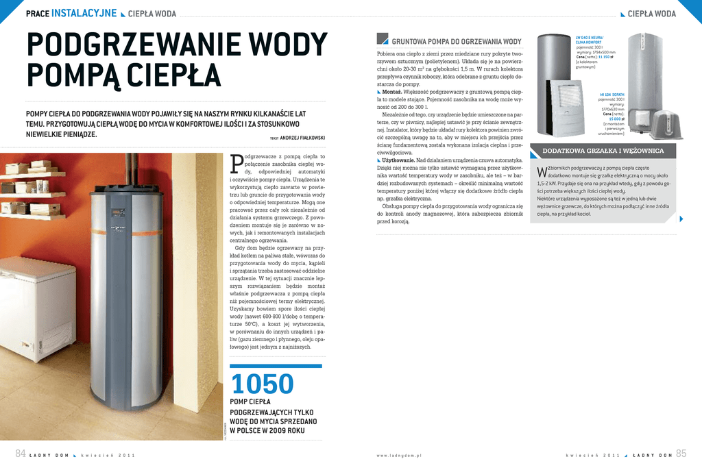 PRACE INSTALACYJNE CIEPŁA WODA CIEPŁA WODA PODGRZEWANIE WODY POMPĄ CIEPŁA LW G40 E NEURA/ CLIMA KOMFORT pojemność 300 l wymiary: 1794x500 mm Cena (netto): 11 150 zł (z kolektorem gruntowym) GRUNTOWA POMPA DO OGRZEWANIA WODY Pobiera ona ciepło z ziemi przez miedziane rury pokryte tworzywem sztucznym (polietylenem). Układa się je na powierzchni około 20-30 m2 na głębokości 1,5 m. W rurach kolektora przepływa czynnik roboczy, która odebrane z gruntu ciepło dostarcza do pompy. Montaż. Większość podgrzewaczy z gruntową pompą ciep- MI 134 SOFATH pojemność 300 l wymiary: 1770x630 mm Cena (netto): 15 000 zł (z montażem i pierwszym uruchomieniem) ła to modele stojące. Pojemność zasobnika na wodę może wynosić od 200 do 300 l. POMPY CIEPŁA DO PODGRZEWANIA WODY POJAWIŁY SIĘ NA NASZYM RYNKU KILKANAŚCIE LAT TEMU. PRZYGOTOWUJĄ CIEPŁĄ WODĘ DO MYCIA W KOMFORTOWEJ ILOŚCI I ZA STOSUNKOWO NIEWIELKIE PIENIĄDZE. TEKST ANDRZEJ FIAŁKOWSKI Niezależnie od tego, czy urządzenie będzie umieszczone na parterze, czy w piwnicy, najlepiej ustawić je przy ścianie zewnętrznej. Instalator, który będzie układał rury kolektora powinien zwrócić szczególną uwagę na to, aby w miejscu ich przejścia przez ścianę fundamentową została wykonana izolacja cieplna i prze- P odgrzewacze z pompą ciepła to połączenie zasobnika ciepłej wody, odpowiedniej automatyki i oczywiście pompy ciepła. Urządzenia te wykorzystują ciepło zawarte w powietrzu lub gruncie do przygotowania wody o odpowiedniej temperaturze. Mogą one pracować przez cały rok niezależnie od działania systemu grzewczego. Z powodzeniem montuje się je zarówno w no- ciwwilgociowa. Użytkowanie. Nad działaniem urządzenia czuwa automatyka. Dzięki niej można nie tylko ustawić wymaganą przez użytkownika wartość temperatury wody w zasobniku, ale też – w bardziej rozbudowanych systemach – określić minimalną wartość temperatury poniżej której włączy się dodatkowe źródło ciepła np. grzałka elektryczna. Obsługa pompy ciepła do przygotowania wody ogranicza się do kontroli anody magnezowej, która zabezpiecza zbiornik DODATKOWA GRZAŁKA I WĘŻOWNICA Wz biornikch podgrzewaczy z pompą ciepła często dodatkowo montuje się grzałkę elektryczną o mocy około 1,5-2 kW. Przydaje się ona na przykład wtedy, gdy z powodu gości potrzeba większych ilości ciepłej wody. Niektóre urządzenia wyposażone są też w jedną lub dwie wężownice grzewcze, do których można podłączyć inne źródła ciepła, na przykład kocioł. przed korozją. wych, jak i remontowanych instalacjach centralnego ogrzewania. Gdy dom będzie ogrzewany na przykład kotłem na paliwa stałe, wówczas do przygotowania wody do mycia, kąpieli i sprzątania trzeba zastosować oddzielne urządzenie. W tej sytuacji znacznie lepszym rozwiązaniem będzie montaż właśnie podgrzewacza z pompą ciepła niż pojemnościowej termy elektrycznej. Uzyskamy bowiem spore ilości ciepłej wody (nawet 600-800 l/dobę o temperaturze 50oC), a koszt jej wytworzenia, w porównaniu do innych urządzeń i paliw (gazu ziemnego i płynnego, oleju opałowego) jest jednym z najniższych. FOT.: VIESSMANN 1050 84 Ł A D N Y D O M k w i e c i e ń 2 0 1 1 POMP CIEPŁA PODGRZEWAJĄCYCH TYLKO WODĘ DO MYCIA SPRZEDANO W POLSCE W 2009 ROKU www.ladnydom.pl k w i e c i e ń 2 0 1 1 Ł A D N Y D O M 85 PRACE INSTALACYJNE CIEPŁA WODA CIEPŁA WODA POWIETRZNA POMPA DO OGRZEWANIA WODY SZACUNKOWE KOSZTY EKSPLOATACJI Urządzenie to może pobierać ciepło z powietrza zewnętrznego, Wszystkie urządzenia podłącza się do gniazda elektryczne- Wielu fachowców doradza inwestorom ogrzewanie wody pom- wewnętrznego (z pomieszczenia, w którym jest zamontowane go o napięciu 230 V. Pobór prądu przez sprężarkę pompy prze- pą ciepła przeznaczoną wyłącznie do tego celu. Argumentem za lub z pomieszczeń sąsiednich) albo usuwanego z budynku przez ważnie nie przekracza 600 W. mają być bardzo małe rachunki za ciepłą wodę – niższe niż system wentylacji mechanicznej z odzyskiem ciepła. Ponieważ podczas pracy powietrznej pompy ciepła do pod- gdybyśmy zastosowali do tegokolektry słoneczne. Schłodzone przez pompę ciepła o 2-5°C powietrze może być wy- grzewania wody do mycia powstaje kondensat (wykrapla się dmuchiwane na zewnątrz lub do pomieszczeń wewnątrz domu, para wodna wskutek schładzania powietrza), trzeba więc pa- na przykład pralni, spiżarni. Montaż. Podgrzewacze z powietrzną pompą ciepła w wersji miętać o jej odprowadzeniu do kanalizacji. wiszącej wyglądają podobnie jak gazowe bojlery lub elektrycz- wietrzną pompą stosuje się automatykę analogiczną jak w mo- sprawność podgrzewacza z pompą ciepła – 330%; gazowego ne termy. Ich pojemność waha się od 80 do 120 l. Natomiast sto- delach gruntowych. Wiele urządzeń ma wbudowaną funkcję kotła kondensacyjnego –101%; kotła olejowego – 90%; jące modele najczęściej przypominają domowe lodówki. Wypo- dezynfekcji termicznej zasobnika, która likwiduje bakterie kolektory słoneczne pokrywają około 60% zapotrzebowania sażone są w zasobniki, których wielkość z reguły nie przekracza Legionella – wywołują kilkudniową wysoką gorączkę, a nawet na energię cieplną do przygotowania ciepłej wody – założyliś- 300 l. zapalenie płuc. my przy tym, dwa płaskie kolektory o powierzchni 4,6 m2, Użytkowanie. Do sterowania pracą podgrzewaczy z po- 1 ROCZNE KOSZTY PRZYGOTOWANIA CIEPŁEJ WODY Aby to sprawdzić porównaliśmy różne paliwa i różne urzą- dzenia (1 ). Przyjęliśmy w obliczeniach, że: zużycie ciepłej wody (o temperaturze 45 oC) przez 4-osobową rodzinę wynosi 300 l na dobę; o kącie nachylenia 40° w kierunku południowym; 2504 zł 2226 zł 1618 zł kocioł gazowy (gaz płynny) kocioł elektryczny kocioł olejowy 897 zł 835 zł 675 zł 463 zł kocioł kolektory podgrzewacz kolektory gazowy słoneczne z pompą 