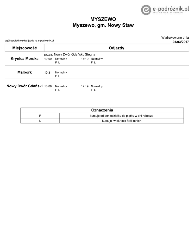 MYSZEWO Myszewo, gm. Nowy Staw Wydrukowano dnia 04/03/2017 ogólnopolski rozkład jazdy na e-podroznik.pl Miejscowość Odjazdy przez: Nowy Dwór Gdański, Stegna Krynica Morska 10:09 Normalny F L Malbork 10:31 Normalny F L Nowy Dwór Gdański 10:09 Normalny F L 17:19 Normalny F L 17:19 Normalny F L Oznaczenia F kursuje od poniedziałku do piątku w dni robocze L kursuje w okresie ferii letnich