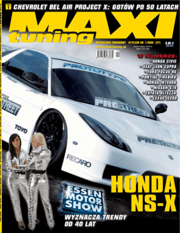 NUMER 1 MIESIĘCZNIK TUNINGOWY STYCZEŃ NR 1/2008 (37) www.maxituning.pl Numer indeksu 324213 ISSN 1733-1668 9,90 z∏ (w tym 7% VAT) Spis treści Edytorial High tech T o ju˝ pewnik: gdy ukazuje si´ nowa edycja gry Need For Speed, Êwiat tuningu mo˝e liczyç na kilka skandalicznie wypasionych democarów. W Polsce tym razem przerobiono Seata Leona Cupr´, a Hiszpanie poszli w coÊ znacznie bardziej egzotycznego. Honda NS-X z bodykitem VeilSide Fortune to pojazd demonstracyjny NFS odbywajàcy tournee po europejskich pokazach – trafi∏ tak˝e na ok∏adk´ MAXI tuningu. Po raz czterdziesty odby∏ si´ Essen Motor Show. Choç trudno mówiç o rozwoju tej imprezy, nie da si´ jednak przeoczyç ogromnej liczby bardzo atrakcyjnie zmodyfikowanych samochodów, rok w rok wype∏niajàcych hale Messe Essen. Pró˝no szukaç na niemieckiej imprezie aut tanich i popularnych (wyjàtkiem w tym roku by∏ Golf I) – przewa˝ajà cacka typu karbonowa Pagani Zonda lub Audi S8 na 24-calowych felgach. Wcià˝ jednak, choç oderwane od rzeczywistoÊci – chyba ˝e mamy na myÊli rzeczywistoÊç w Dubaju – fury zebrane w Essen zachwycajà nas rok w rok. SAMOCHODY 6 W Polsce te˝ – mimo zimy – sytuacja wyglàda ciekawie i przede wszystkim obiecujàco w odniesieniu do roku 2008. W zalewie tuningowanych szybkich Hond i Nissanów wyjàtkowo b∏yszczy ponad 300-konny Ford Focus RS z Wroc∏awia. JDMowy Civic IV generacji z Koszalina oprócz modyfikacji mechanicznych z wysokiej pó∏ki mo˝e poszczyciç si´ tak˝e wyjàtkowà w∏aÊcicielkà. Stale rozwijamy dzia∏ dotyczàcy techniki. W aktualnym numerze to ju˝ trzy materia∏y, ka˝dy z zupe∏nie innej dziedziny, mimo ˝e wszystkie trzy traktujà o tuningu mechanicznym. Dok∏adamy te˝ staraƒ, ˝eby promowaç tuning mechaniczny za sprawà prezentacji samochodów niekoniecznie pi´knych, ale zawsze szybkich – bo dla coraz wi´kszej grupy osób, sens tuningu le˝y w∏aÊnie w tym, by auto nie wyglàda∏o, a jecha∏o. Niektórzy nawet w zast´pstwie s∏owa „jecha∏o” u˝ywajà okreÊlenia ca∏kiem nieparlamentarnego. My jednak pozostaniemy przy ∏agodniejszych okreÊleniach, a wszystkim fanom tuningu, motoryzacji i szybkoÊci ˝yczymy mnóstwa niutonometrów i koni mechanicznych w roku 2008. TYMON GRABOWSKI redaktor naczelny 31 Honda NS-X Profesjonalny prototyp Skoda Octavia 32 Fiat Panda 100 HP 42 Honda Civic 48 Chevrolet Bel Air MAGAZYN X-rated 93 Honda Integra Szybka czystoÊç 56 Seat Leon Cupra 60 Nissan 200SX Ogieƒ z Cupra Âfinka 68 74 98 Technika 131 88 132 102 106 Technika RUBRYKI åwiczenia z mapà 24 Lifestyle Dwa na cztery Toyota Altezza IMPREZY Bia∏y szum 14 Lexus IS200 Essen Motor Show Chce si´ wracaç 138 Zlot VW Vento TUNING Z FABRYKI BMW 135i CAR AUDIO Strongman 112 Chevrolet Tahoe Big Mac 4 N°1 STYCZE¡ 2008 Dziewczyna Julia i Kinga 34 News Iron, Lion, Scion Venciarze 28 Nowości car audio Moc z pomys∏u Pontiac Firebird Zezwolenie na tuning Impreza car audio Z p∏yty i na ˝ywo Not so Camaro 82 Prezentacja konsoli Clarion Zupe∏nie inna jazda Precz z wàtpliwoÊciami Ford Focus RS Za Focusa? Technika Toyota RAV4 Zabawa poza Matrixem 128 Lexus IS 96 Opel Astra Standardy wiecznie ˝ywe 124 Wszystko o... Hummer H2 Bombardier na pla˝y 120 Setka? Ch´tnie! JDM GRL 52 116 Nawet i bez RS 37 38 40 139 140 142 144 146 Informacje tuningowe Lans tuningowca Gadżety tuningowca Auto czytelnika Virtual tuning Tuning modeli Prenumerata Stopka redakcyjna, zapowiedzi 6 Honda NS-X Szcz´Êcie sprzyja odwa˝nym 14 Essen Motor Show 40 lat min´∏o... 34 Scion x 3 Omne Trinum Perfectum 42 Honda Civic 56 Seat Leon Cupra 60 Nissan 200SX 82 98 106 Buell vs Crossfire 124 Toyota RAV4 Red is the new black Toyota Altezza JDM z niespodziankà Na pewniaka Technika Goodbye, Calibras! Gruiii! Statystycznie po 3 ko∏a CAR AUDIO 112 Chevrolet Tahoe Jedêmy gdziekolwiek 116 Hummer H2 Trzy tony i dobre tony Stealth Technologies styczeń 2008 N°1 STYCZE¡ 2008 5 P R E Z E N T A C J A HONDA NSX H I S Z P A N I A Przebiç zesz∏oroczny europejski democar Need For Speed – Mazd´ RX7 z karbonu – nie by∏o ∏atwo. Si´gni´to po broƒ ostatecznà, japoƒskie Ferrari, jeden z trzech dalekowschodnich samochodów z centralnym silnikiem: Hond´ NS-X. To, co wykonano na jej bazie, odsuwa w cieƒ wszystkie dotychczasowe projekty NFS... 6 N°1 STYCZE¡ 2008 N°1 STYCZE¡ 2008 7 HONDA NSX PROFESJONALNY PROTOTYP NS-X MIMO RADYKALNYCH MODYFIKACJI NADAL JEST DOPUSZCZONY DO RUCHU: WSZYSTKIE ELEMENTY POSIADAJÑ STOSOWNÑ HOMOLOGACJ¢, NAWET WYKONANE W JEDNYM TYLKO EGZEMPLARZU PNEUMATYCZNE ZAWIESZENIE. 8 N°1 STYCZE¡ 2008 R ynek tzw. „supersamochodów” ju˝ dawno zdominowali Europejczycy. Ferrari, Lamborghini, Maserati, Jaguar XJ220, McLaren F1... superfur produkowano naprawd´ sporo na Starym Kontynencie. Amerykaƒskie próby z Saleenem, Vectorem czy Moslerem nie wydawa∏y si´ zbyt udane, a Japoƒczycy zaliczyli tylko dwa wejÊcia w tym segmencie. Przy czym pierwsze zakoƒczy∏o si´ powstaniem jednego egzemplarza dopuszczonego do ruchu ulicznego: mowa o Nissanie R390. Jedyny sukces w tej dziedzinie odnios∏a Honda – model NS-X nie tylko nie ust´powa∏ w∏aÊciwoÊciami jezdnymi w∏oskim superautom, ale przewy˝sza∏ je znacznie odpornoÊcià na „katunek” i jazd´ po torze, do czego zosta∏ wszak stworzony. D∏ugo uznawano, ˝e NS-X sam w sobie jest perfekcjà, a jego tuning to zb´dna strata czasu i pieni´dzy. No có˝, czas obaliç stereotypy... Ig∏a w stogu og∏oszeƒ Spróbujcie znaleêç prawostronnego NS-Xa w po∏udniowej Europie. Równie prawdopodobne b´dzie znalezienie pliku dolarów w reklamówce na nasypie kolejowym. Hondy mo˝na Êciàgaç ze Stanów Zjednoczonych (gdzie te˝ nie wyst´pujà w hurtowych iloÊciach, zw∏aszcza na zimnym wschodzie) albo z Japonii (o, kierownica jest znów po niew∏aÊciwej stronie). Jeszcze gorzej zaczyna si´ robiç, gdy dzia∏amy pod presjà czasu – skoro democar ma by
