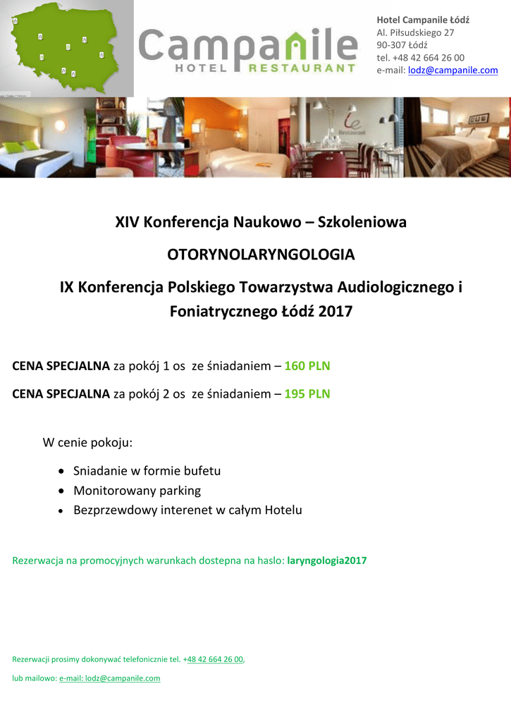 Hotel Campanile Łódź Al. Piłsudskiego 27 90-307 Łódź tel. +48 42 664 26 00 e-mail: [email protected] XIV Konferencja Naukowo – Szkoleniowa OTORYNOLARYNGOLOGIA IX Konferencja Polskiego Towarzystwa Audiologicznego i Foniatrycznego Łódź 2017 CENA SPECJALNA za pokój 1 os ze śniadaniem – 160 PLN CENA SPECJALNA za pokój 2 os ze śniadaniem – 195 PLN W cenie pokoju: Sniadanie w formie bufetu Monitorowany parking Bezprzewdowy interenet w całym Hotelu Rezerwacja na promocyjnych warunkach dostepna na haslo: laryngologia2017 Rezerwacji prosimy dokonywać telefonicznie tel. +48 42 664 26 00, lub mailowo: e-mail: [email protected]