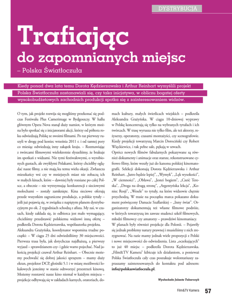 DystRybucjA Trafiając do zapomnianych miejsc – Polska Światłoczuła Kiedy ponad dwa lata temu Dorota Kędzierzawska i Arthur Reinhart wymyślili projekt Polska Światłoczuła zastanawiali się, czy taka inicjatywa, w obliczu bogatej oferty wysokobudżetowych zachodnich produkcji spotka się z zainteresowaniem widzów. O tym, jak projekt rozwija się mogliśmy przekonać się podczas Festiwalu Plus Camerimage w Bydgoszczy. W hallu głównym Opera Nova stanął duży namiot, w którym można było spotkać się z inicjatorami akcji, którzy od półtora roku odwiedzają Polskę ze swoimi filmami. Po raz pierwszy ruszyli w drogę pod koniec września 2011 r. i od tamtej pory co miesiąc odwiedzają inny zakątek kraju. – Rozmawiając z twórcami filmowymi wielokrotnie słyszeliśmy, że brakuje im spotkań z widzami. Nie tymi festiwalowymi, o wyrobionych gustach, ale zwykłymi Polakami, którzy chcieliby oglądać nasze filmy, a nie mają ku temu wielu okazji. Zwłaszcza mieszkańcy wsi czy w mniejszych miast nie zobaczą ich w małych kinach, które – dawniej były rozsiane po całej Polsce, a obecnie – nie wytrzymując konkurencji z sieciowymi molochami – zostały zamknięte. Kina sieciowe oferują przede wszystkim zagraniczne produkcje, a polskie tytuły – jeśli już pojawią się, w związku z napiętym planem dystrybucyjnym po ok. 2 tygodniach schodzą z afisza. My zaś, w czasach, kiedy zakłada się, że odbiorca jest mało wymagający, chcieliśmy przedstawić polskiemu widzowi inną ofertę – podkreśla Dorota Kędzierzawska, współautorka projektu. Aleksandra Grażyńska, koordynator wspomina trudne początki: – W ciągu 25 dni odwiedziliśmy 30 miejscowości. Pierwsza trasa była, jak dotychczas najdłuższą, a pierwszy wyjazd – sprawdzianem czy- i gdzie warto pojechać. Nad jakością projekcji czuwał Arthur Reinhart. – Obecnie możemy pochwalić się dobrej jakości sprzętem – mamy duży ekran, projektor DCP, głośniki 5.1 i w miarę możliwości lokalowych jesteśmy w stanie odtworzyć przestrzeń kinową. Możemy rozstawić nasze kino niemal w każdym miejscu – projekcje odbywają się w zakładach karnych, oratoriach, do- mach kultury, małych świetlicach wiejskich – podkreśla Aleksandra Grażyńska. W ciągu 10-dniowej wyprawy w Polskę koncentrują się tylko na wybranych tytułach i ich twórcach. W trasę wyrusza nie tylko film, ale też aktorzy, reżyserzy, operatorzy, czasami montażyści, czy scenografowie. Kiedy projekcji towarzyszą Marcin Dorociński czy Robert Więckiewicz, i tak pełne sale, pękają w szwach. Oprócz nowych filmów fabularnych pokazywane są również dokumenty i animacje oraz starsze, rekonstruowane cyfrowo filmy, które weszły już do kanonu polskiej kinematografii. Selekcji dokonują Dorota Kędzierzawska i Arthur Reinhart. „Jutro będzie lepiej”, „Wymyk”, „Lęk wysokości”, „W ciemności”, „Obława”, „Jesteś bogiem”, „Cześć Tereska”, „Droga na drugą stronę”, „Argentyńska lekcja”, „Koniec Rosji”, „Wesele” to tytuły, na które widzowie chętnie przychodzą. W trasie na początku marca pokazano dokument poświęcony Danucie Szaflarskiej – „Inny świat”. Organizatorzy dokumentują też własne filmowe podróże, w których towarzyszą im zawsze studenci szkół filmowych, młodzi filmowcy czy amatorzy – prawdziwi kinomaniacy. W planach były również projekcje dla Polonii. – Pojawiły się jednak problemy natury prawnej i musieliśmy z nich zrezygnować. Na razie mamy jednak wiele propozycji z Polski i nowe miejscowości do odwiedzenia. Lista „oczekujących” to już 40 miejsc – podkreśla Dorota Kędzierzawska. „Film&TV Kamera” kibicuje ich działaniom, a ponieważ Polska Światłoczuła cały czas poszukuje wolontariuszy zapraszamy zainteresowanych do kontaktu pod adresem: [email protected]. Wysłuchała Jolanta Tokarczyk Film&TV Kamera 57
