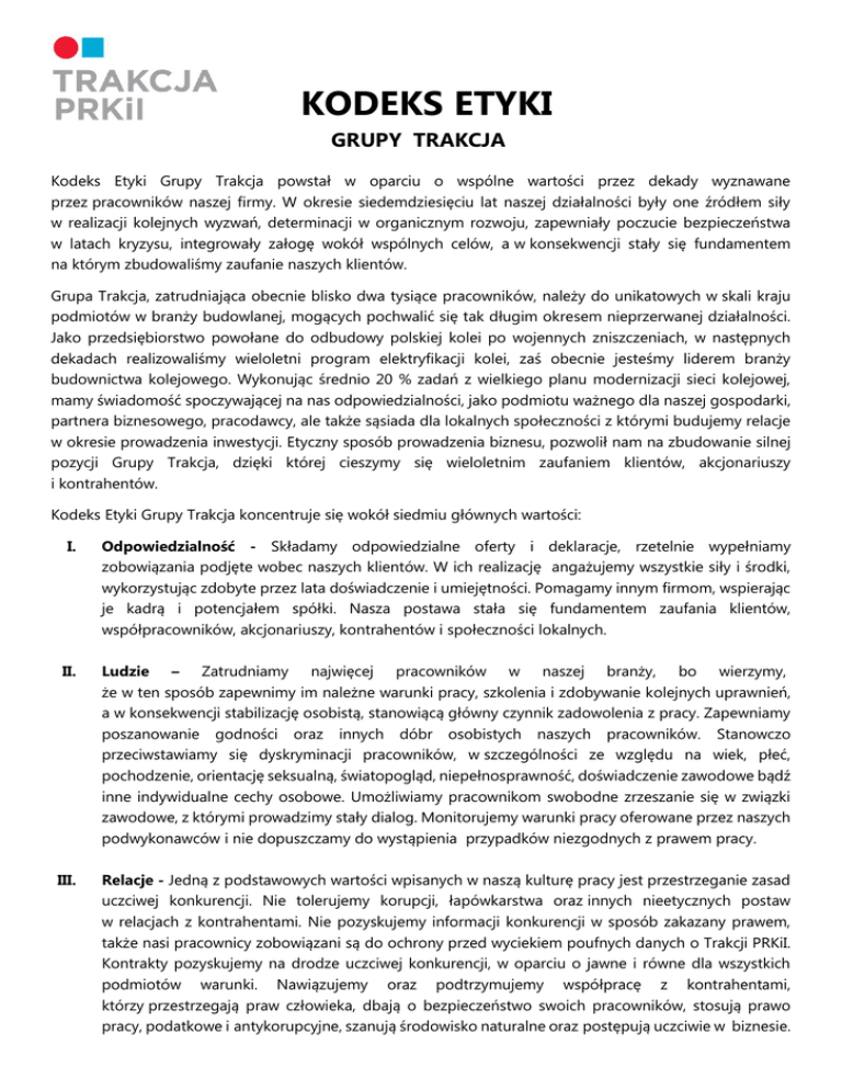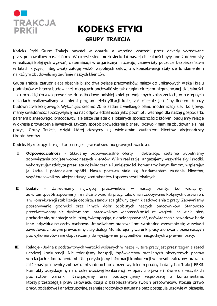 KODEKS ETYKI GRUPY TRAKCJA Kodeks Etyki Grupy Trakcja powstał w oparciu o wspólne wartości przez dekady wyznawane przez pracowników naszej firmy. W okresie siedemdziesięciu lat naszej działalności były one źródłem siły w realizacji kolejnych wyzwań, determinacji w organicznym rozwoju, zapewniały poczucie bezpieczeństwa w latach kryzysu, integrowały załogę wokół wspólnych celów, a w konsekwencji stały się fundamentem na którym zbudowaliśmy zaufanie naszych klientów. Grupa Trakcja, zatrudniająca obecnie blisko dwa tysiące pracowników, należy do unikatowych w skali kraju podmiotów w branży budowlanej, mogących pochwalić się tak długim okresem nieprzerwanej działalności. Jako przedsiębiorstwo powołane do odbudowy polskiej kolei po wojennych zniszczeniach, w następnych dekadach realizowaliśmy wieloletni program elektryfikacji kolei, zaś obecnie jesteśmy liderem branży budownictwa kolejowego. Wykonując średnio 20 % zadań z wielkiego planu modernizacji sieci kolejowej, mamy świadomość spoczywającej na nas odpowiedzialności, jako podmiotu ważnego dla naszej gospodarki, partnera biznesowego, pracodawcy, ale także sąsiada dla lokalnych społeczności z którymi budujemy relacje w okresie prowadzenia inwestycji. Etyczny sposób prowadzenia biznesu, pozwolił nam na zbudowanie silnej pozycji Grupy Trakcja, dzięki której cieszymy się wieloletnim zaufaniem klientów, akcjonariuszy i kontrahentów. Kodeks Etyki Grupy Trakcja koncentruje się wokół siedmiu głównych wartości: I. Odpowiedzialność - Składamy odpowiedzialne oferty i deklaracje, rzetelnie wypełniamy zobowiązania podjęte wobec naszych klientów. W ich realizację angażujemy wszystkie siły i środki, wykorzystując zdobyte przez lata doświadczenie i umiejętności. Pomagamy innym firmom, wspierając je kadrą i potencjałem spółki. Nasza postawa stała się fundamentem zaufania klientów, współpracowników, akcjonariuszy, kontrahentów i społeczności lokalnych. II. Ludzie – Zatrudniamy najwięcej pracowników w naszej branży, bo wierzymy, że w ten sposób zapewnimy im należne warunki pracy, szkolenia i zdobywanie kolejnych uprawnień, a w konsekwencji stabilizację osobistą, stanowiącą główny czynnik zadowolenia z pracy. Zapewniamy poszanowanie godności oraz innych dóbr osobistych naszych pracowników. Stanowczo przeciwstawiamy się dyskryminacji pracowników, w szczególności ze względu na wiek, płeć, pochodzenie, orientację seksualną, światopogląd, niepełnosprawność, doświadczenie zawodowe bądź inne indywidualne cechy osobowe. Umożliwiamy pracownikom swobodne zrzeszanie się w związki zawodowe, z którymi prowadzimy stały dialog. Monitorujemy warunki pracy oferowane przez naszych podwykonawców i nie dopuszczamy do wystąpienia przypadków niezgodnych z prawem pracy. III. Relacje - Jedną z podstawowych wartości wpisanych w naszą kulturę pracy jest przestrzeganie zasad uczciwej konkurencji. Nie tolerujemy korupcji, łapówkarstwa oraz innych nieetycznych postaw w relacjach z kontrahentami. Nie pozyskujemy informacji konkurencji w sposób zakazany prawem, także nasi pracownicy zobowiązani są do ochrony przed wyciekiem poufnych danych o Trakcji PRKiI. Kontrakty pozyskujemy na drodze uczciwej konkurencji, w oparciu o jawne i równe dla wszystkich podmiotów warunki. Nawiązujemy oraz podtrzymujemy współpracę z kontrahentami, którzy przestrzegają praw człowieka, dbają o bezpieczeństwo swoich pracowników, stosują prawo pracy, podatkowe i antykorupcyjne, szanują środowisko naturalne oraz postępują uczciwie w biznesie. IV. W sprawach spornych korzystamy z wszelkich dostępnych form i instytucji dialogu, celem wypracowania kompromisowych rozwiązań, jednocześnie unikając realizacji naszych interesów na drodze sądowej. V. Jakość – powierzone nam zadania realizujemy z należytą jakością, profesjonalizmem oraz w najszybszych możliwych terminach. W swojej pracy wykorzystujemy wszelkie zdobyte umiejętności oraz talenty organizacyjne naszych pracowników, dzięki którym realizujemy postawione przed nami zadania. Nie ustępujemy w wysiłkach nad zwiększaniem efektywności oraz wydajności systemu organizacji pracy. Realizując nasze kontrakty podejmujemy również wszelkie możliwe działania w celu zminimalizowania uciążliwości dla okolicznych społeczności. VI. Bezpieczeństwo - Szczególną uwagę przywiązujemy do zapewnienia naszym pracownikom najwyższego poziomu bezpieczeństwa w miejscu pracy. Za główny cel stawiamy sobie osiągnięcie zerowej wypadkowości na budowach oraz stałe podnoszenie warunków wykonywania pracy. VII. Środowisko naturalne - w działalności biznesowej zachowujemy szczególną dbałość o poszanowanie środowiska naturalnego. Wykorzystujemy ekologiczne technologie prowadzenia prac oraz materiały budowlane przyjazne środowisku. Wszystkie nasze maszyny budowlane przechodzą regularnie przeglądy techniczne. W planowaniu naszej pracy, wybieramy rozwiązania o najmniejszym stopniu oddziaływania na środowisko naturalne, które użytkujemy odpowiedzialnie. VIII. Kompetencje – rozwijamy nasze kompetencje, dzięki czemu systematycznie rozwijamy zakres wykonywanych usług, początkowo, jako firma powołana do elektryfikacji linii kolejowych, budowaliśmy doświadczenie w następnych dziedzinach – pracach torowych, inżynieryjnych, budowlanych, produkcyjnych, projektowych i drogowych. Przygotowujemy się do wykonywania specjalistycznych usług serwisowych sprzętu kolejowego i rozwoju w następnych dziedzinach budownictwa oraz na nowych rynkach geograficznych. Systematycznie odnawiamy i rozbudowujemy nasz park maszynowy, o nowoczesny oraz przyjazny środowisku sprzęt budowlany. W przypadku zaobserwowania nieprawidłowości oraz łamania postanowień Kodeksu Etyki, pracownicy są zobowiązani do zgłoszenia tego faktu swojemu przełożonemu bądź bezpośrednio Dyrektorowi Au