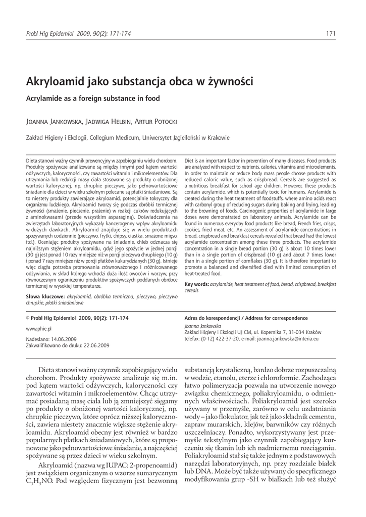 Probl Jankowska Hig Epidemiol J, Helbin J,2009, Potocki90(2): A. Akryloamid 171-174 jako substancja obca w żywności 171 Akryloamid jako substancja obca w żywności Acrylamide as a foreign substance in food Joanna Jankowska, Jadwiga Helbin, Artur Potocki Zakład Higieny i Ekologii, Collegium Medicum, Uniwersytet Jagielloński w Krakowie Dieta stanowi ważny czynnik prewencyjny w zapobieganiu wielu chorobom. Produkty spożywcze analizowane są między innymi pod kątem wartości odżywczych, kaloryczności, czy zawartości witamin i mikroelementów. Dla utrzymania lub redukcji masy ciała stosowane są produkty o obniżonej wartości kalorycznej, np. chrupkie pieczywo, jako pełnowartościowe śniadanie dla dzieci w wieku szkolnym polecane są płatki śniadaniowe. Są to niestety produkty zawierające akryloamid, potencjalnie toksyczny dla organizmu ludzkiego. Akryloamid tworzy się podczas obróbki termicznej żywności (smażenie, pieczenie, prażenie) w reakcji cukrów redukujących z aminokwasami (przede wszystkim asparaginą). Doświadczenia na zwierzętach laboratoryjnych wykazały kancerogenny wpływ akryloamidu w dużych dawkach. Akryloamid znajduje się w wielu produktach spożywanych codziennie (pieczywo, frytki, chipsy, ciastka, smażone mięso, itd.). Oceniając produkty spożywane na śniadanie, chleb odznacza się najniższym stężeniem akryloamidu, gdyż jego spożycie w jednej porcji (30 g) jest ponad 10 razy mniejsze niż w porcji pieczywa chrupkiego (10 g) i ponad 7 razy mniejsze niż w porcji płatków kukurydzianych (30 g). Istnieje więc ciągła potrzeba promowania zrównoważonego i zróżnicowanego odżywiania, w skład którego wchodzi duża ilość owoców i warzyw, przy równoczesnym ograniczeniu produktów spożywczych poddanych obróbce termicznej w wysokiej temperaturze. Diet is an important factor in prevention of many diseases. Food products are analyzed with respect to nutrients, calories, vitamins and microelements. In order to maintain or reduce body mass people choose products with reduced caloric value, such as crispbread. Cereals are suggested as a nutritious breakfast for school age children. However, these products contain acrylamide, which is potentially toxic for humans. Acrylamide is created during the heat treatment of foodstuffs, where amino acids react with carbonyl group of reducing sugars during baking and frying, leading to the browning of foods. Carcinogenic properties of acrylamide in large doses were demonstrated on laboratory animals. Acrylamide can be found in numerous everyday food products like bread, French fries, crisps, cookies, fried meat, etc. An assessment of acrylamide concentrations in bread, crispbread and breakfast cereals revealed that bread had the lowest acrylamide concentration among these three products. The acrylamide concentration in a single bread portion (30 g) is about 10 times lower than in a single portion of crispbread (10 g) and about 7 times lower than in a single portion of cornflakes (30 g). It is therefore important to promote a balanced and diversified died with limited consumption of heat-treated food. Key words: acrylamide, heat treatment of food, bread, crispbread, breakfast cereals Słowa kluczowe: akryloamid, obróbka termiczna, pieczywo, pieczywo chrupkie, płatki śniadaniowe © Probl Hig Epidemiol 2009, 90(2): 171-174 Adres do korespondencji / Address for correspondence www.phie.pl Joanna Jankowska Zakład Higieny i Ekologii UJ CM, ul. Kopernika 7, 31-034 Kraków telefax: (0-12) 422-37-20, e-mail: [email protected] Nadesłano: 14.06.2009 Zakwalifikowano do druku: 22.06.2009 Dieta stanowi ważny czynnik zapobiegający wielu chorobom. Produkty spożywcze analizuje się m.in. pod kątem wartości odżywczych, kaloryczności czy zawartości witamin i mikroelementów. Chcąc utrzymać posiadaną masę ciała lub ją zmniejszyć sięgamy po produkty o obniżonej wartości kalorycznej, np. chrupkie pieczywo, które oprócz niższej kaloryczności, zawiera niestety znacznie większe stężenie akryloamidu. Akryloamid obecny jest również w bardzo popularnych płatkach śniadaniowych, które są proponowane jako pełnowartościowe śniadanie, a najczęściej spożywane są przez dzieci w wieku szkolnym. Akryloamid (nazwa wg IUPAC: 2-propenoamid) jest związkiem organicznym o wzorze sumarycznym C3H5NO. Pod względem fizycznym jest bezwonną substancją krystaliczną, bardzo dobrze rozpuszczalną w wodzie, etanolu, eterze i chloroformie. Zachodząca łatwo polimeryzacja pozwala na utworzenie nowego związku chemicznego, poliakryloamidu, o odmiennych właściwościach. Poliakryloamid jest szeroko używany w przemyśle, zarówno w celu uzdatniania wody – jako flokulator, jak też jako składnik cementu, zapraw murarskich, klejów, barwników czy różnych uszczelniaczy. Ponadto, wykorzystywany jest przemyśle tekstylnym jako czynnik zapobiegający kurczeniu się tkanin lub ich nadmiernemu rozciąganiu. Poliakryloamid stał się także jednym z podstawowych narzędzi laboratoryjnych, np. przy rozdziale białek lub DNA. Może być także używany do specyficznego modyfikowania grup -SH w białkach lub też służyć 172 jako wygaszacz w analizie struktury i funkcji białek metodą FRET [1]. Wysoka aktywność akryloamidu jest spowodowana obecnością grupy winylowej, która jest zdolna do przeprowadzania nukleofilowego ataku. Dzięki nukleofilowej naturze, związek ten może oddziaływać z grupami -SH i -NH2 białek, czy azotem wbudowanym w kwasy nukleinowe [2]. Akryloamid na skalę przemysłową jest produkowany na drodze hydrolizy akrylonitrylu. Do niedawna zjadając kromkę chleba z chrupiącą skórką, czy kawałek pieczywa chrupkiego nie zdawaliśmy sobie sprawy z obecności akryloamidu w pożywieniu. Pierwsze oznaki jego toksycznego wpływu na zdrowie ludzkie pojawiły się u robotników, którzy w swojej pracy mieli styczność z tą substancją. Do objawów zaliczyć można m.in.: cierpnięcie r