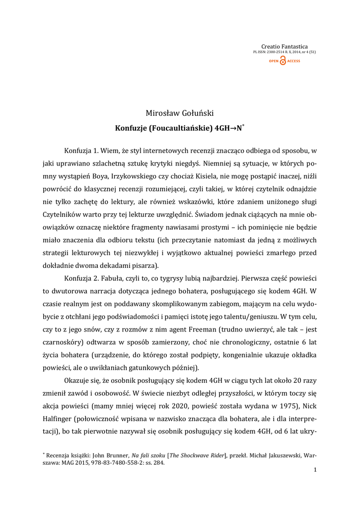 Creatio Fantastica PL ISSN: 2300-2514 R. X, 2014, nr 4 (51) Mirosław Gołuński Konfuzje (Foucaultiańskie) 4GH→N Konfuzja 1. Wiem, że styl internetowych recenzji znacząco odbiega od sposobu, w jaki uprawiano szlachetną sztukę krytyki niegdyś. Niemniej są sytuacje, w których pomny wystąpień Boya, Irzykowskiego czy chociaż Kisiela, nie mogę postąpić inaczej, niźli powrócić do klasycznej recenzji rozumiejącej, czyli takiej, w której czytelnik odnajdzie nie tylko zachętę do lektury, ale również wskazówki, które zdaniem uniżonego sługi Czytelników warto przy tej lekturze uwzględnić. Świadom jednak ciążących na mnie obowiązków oznaczę niektóre fragmenty nawiasami prostymi – ich pominięcie nie będzie miało znaczenia dla odbioru tekstu (ich przeczytanie natomiast da jedną z możliwych strategii lekturowych tej niezwykłej i wyjątkowo aktualnej powieści zmarłego przed dokładnie dwoma dekadami pisarza). Konfuzja 2. Fabuła, czyli to, co tygrysy lubią najbardziej. Pierwsza część powieści to dwutorowa narracja dotycząca jednego bohatera, posługującego się kodem 4GH. W czasie realnym jest on poddawany skomplikowanym zabiegom, mającym na celu wydobycie z otchłani jego podświadomości i pamięci istotę jego talentu/geniuszu. W tym celu, czy to z jego snów, czy z rozmów z nim agent Freeman (trudno uwierzyć, ale tak – jest czarnoskóry) odtwarza w sposób zamierzony, choć nie chronologiczny, ostatnie 6 lat życia bohatera (urządzenie, do którego został podpięty, kongenialnie ukazuje okładka powieści, ale o uwikłaniach gatunkowych później). Okazuje się, że osobnik posługujący się kodem 4GH w ciągu tych lat około 20 razy zmienił zawód i osobowość. W świecie niezbyt odległej przyszłości, w którym toczy się akcja powieści (mamy mniej więcej rok 2020, powieść została wydana w 1975), Nick Halfinger (połowiczność wpisana w nazwisko znacząca dla bohatera, ale i dla interpretacji), bo tak pierwotnie nazywał się osobnik posługujący się kodem 4GH, od 6 lat ukry Recenzja książki: John Brunner, Na fali szoku [The Shockwave Rider], przekł. Michał Jakuszewski, Warszawa: MAG 2015, 978-83-7480-558-2: ss. 284. 1 wał się przed służbami federalnymi. Jako wybitnie uzdolnione dziecko trafił do ośrodka Turnover, w którym szkolono go do działań na rzecz państwa. Jako dwudziestodwulatek uciekł z ośrodka i rozpoczął swą podróż między osobowościami – był między innymi inżynierem utopii, kapłanem wymyślonego przez siebie kultu, a wreszcie głównym informatykiem w hiperkorporacji S-ZO. W każdym z tych zawodów sprawdzał się, a gdy robiło się niebezpiecznie, zmieniał osobowość i personalia, by iść dalej. Władze federalne pozornie najbardziej interesuje, jak mu się to udawało. Rzeczywistość jednak nie jest taka prosta. Freeman, wychowany w innym, równie tajnym ośrodku, jest odpowiednim partnerem dla Nicka, cierpliwie tłumacząc mu piękno i harmonię świata, w którym żyją (ot, jeszcze jedna wersja Equilibrium czy Fahrenheita 457). Co się jednak stanie, gdy szefowie agenta stracą cierpliwość i porwą przyjaciółkę uciekiniera, Kate, by zmusić go do pełnej współpracy? Konfuzja 3. Świat przedstawiony, czyli Pomocny Słuchacz. Na początku lat 90. Ameryką, bo tam toczy się akcja powieści, wstrząsnęło (dosłownie) wielkie trzęsienie ziemi, które zmiotło San Francisco. Pod wpływem szoku (w tytule, co obnaża tytuł angielski, chodzi o nieco inny szok) i nagłej utraty podstaw, na których do tej pory wspierał się społeczny ład, zmienił się sposób zarządzania społeczeństwem. W jego efekcie udało się utrzymać spokój, ale zdano sobie sprawę, jak trudne jest kontrolowanie nastrojów społecznych. Nicka szkolono również po to, by nad tymi nastrojami panował. Jednym z elementów tejże kontroli wydaje się Pomocny Słuchacz, coś w rodzaju darmowej linii zaufania, na którą każdy może zadzwonić, by wyrzucić swoje lęki i żale wobec świata. Nie otrzyma tam wsparcia psychologicznego w sensie porady, ale mając pewność anonimowości, może w ten sposób rozładować emocje. Oficjalnie wiadomo, że Słuchacz nie jest zarządzany przez rząd, ale nikt nie wie przez kogo. Rozwiązanie tej zagadki to kolejny przełomowy moment powieści. (W tle mamy już jak najbardziej państwową loterię delficką, na której ludzie mogą obstawiać zaistnienie, bądź nie, wydarzeń w perspektywie miesięcy czy lat. I to jest właśnie rządowy klucz do nastrojów ludności. Mając wiedzę, ile osób czego oczekuje, władza dostosowuje swoje posunięcia do tychże nastrojów – i oczywiście odpowiednio modelować propagandę, by osiągnąć własne cele. Dla 4GH to nieustające źródło dochodów, gdyż jego zdolności pozwalają mu bez trudu wyczuwać zachowania rządu. W tym miejscu po raz pierwszy muszę przywołać Michela Foucault. Gdy Brunner pisał Na fali szoku, francuski filozof był już u szczytu medialnego powodzenia, a jego przemyślenia 2 dotyczące relacji wiedzy i władzy znane były nie tylko słuchaczom jego wykładów, ale również czytelnikom bestselerowych Nadzorować i karać czy Historia szaleństwa w dobie klasycyzmu. W opisywanej powieści, angielski pisarz nie tylko wykorzystuje założenia tej filozofii, ale również poddaje je krytycznej recepcji. Widać to szczególnie, jeśli porówna się tę powieść z opublikowaną również w MAG-u, a wydaną przed kilkoma miesiącami w tej samej serii „Artefakty”, inną powieścią tego pisarza, Wszyscy na Zanzibarze, pierwotnie wydaną w roku 1968. W niej również Brunner planuje przyszłość, lecz nieco baśniowe, w sensie fantazji genetycznej, rozwiązania, nie mają śladu obecności Foucaulta. Do konsekwencji wynikających z założeń twórcy metafory paneptikonu Brunner dodał własne przemyślenia na temat mediów, zainspirowane zapewne również święcącym wówczas nom