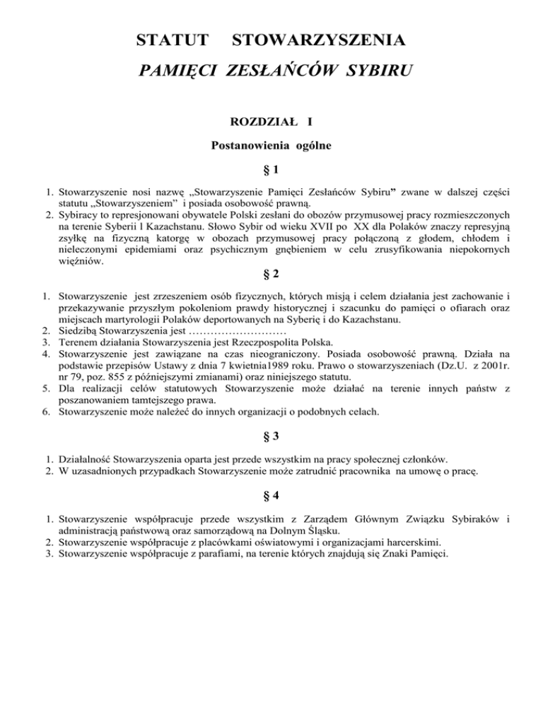STATUT STOWARZYSZENIA PAMIĘCI ZESŁAŃCÓW SYBIRU ROZDZIAŁ I Postanowienia ogólne §1 1. Stowarzyszenie nosi nazwę „Stowarzyszenie Pamięci Zesłańców Sybiru” zwane w dalszej części statutu „Stowarzyszeniem” i posiada osobowość prawną. 2. Sybiracy to represjonowani obywatele Polski zesłani do obozów przymusowej pracy rozmieszczonych na terenie Syberii l Kazachstanu. Słowo Sybir od wieku XVII po XX dla Polaków znaczy represyjną zsyłkę na fizyczną katorgę w obozach przymusowej pracy połączoną z głodem, chłodem i nieleczonymi epidemiami oraz psychicznym gnębieniem w celu zrusyfikowania niepokornych więźniów. §2 1. Stowarzyszenie jest zrzeszeniem osób fizycznych, których misją i celem działania jest zachowanie i przekazywanie przyszłym pokoleniom prawdy historycznej i szacunku do pamięci o ofiarach oraz miejscach martyrologii Polaków deportowanych na Syberię i do Kazachstanu. 2. Siedzibą Stowarzyszenia jest ……………………… 3. Terenem działania Stowarzyszenia jest Rzeczpospolita Polska. 4. Stowarzyszenie jest zawiązane na czas nieograniczony. Posiada osobowość prawną. Działa na podstawie przepisów Ustawy z dnia 7 kwietnia1989 roku. Prawo o stowarzyszeniach (Dz.U. z 2001r. nr 79, poz. 855 z późniejszymi zmianami) oraz niniejszego statutu. 5. Dla realizacji celów statutowych Stowarzyszenie moŜe działać na terenie innych państw z poszanowaniem tamtejszego prawa. 6. Stowarzyszenie moŜe naleŜeć do innych organizacji o podobnych celach. §3 1. Działalność Stowarzyszenia oparta jest przede wszystkim na pracy społecznej członków. 2. W uzasadnionych przypadkach Stowarzyszenie moŜe zatrudnić pracownika na umowę o pracę. §4 1. Stowarzyszenie współpracuje przede wszystkim z Zarządem Głównym Związku Sybiraków i administracją państwową oraz samorządową na Dolnym Śląsku. 2. Stowarzyszenie współpracuje z placówkami oświatowymi i organizacjami harcerskimi. 3. Stowarzyszenie współpracuje z parafiami, na terenie których znajdują się Znaki Pamięci. ROZDZIAŁ II Cele i sposoby realizacji §5 1. Stowarzyszenie ma na celu : 1.1. Integrować pokolenia i przekazywać następcom prawdę historyczną, aby ocalić ją od zapomnienia. 1.2. Kształtować wśród młodzieŜy poczucie przynaleŜności do narodu i państwa poprzez krzewienie wiedzy o martyrologii Polaków. 1.3. Rozbudzać i pielęgnować postawy patriotyczne, antywojenne oraz rozwijać świadomość obywatelską. 1.4. Uświadamiać o moralnym obowiązku opieki nad pamiątkami i miejscami upamiętniającymi tragiczne losy Zesłańców Sybiru. 1.5. Wspomagać i popierać młodzieŜ w realizacji uroczystości patriotycznych, „Ŝywych” lekcji historii, konkursów, gromadzeniu pamiątek oraz innych inicjatyw. 1.6. Propagować idee Stowarzyszenia we współpracy z placówkami oświatowymi, organizacjami kombatanckimi i młodzieŜowymi , mediami i sympatykami w celu rozszerzenia świadomości historycznej Polaków. 1.7. Kontynuować opiekę nad Znakami Pamięci wzniesionymi przez Związek Sybiraków we Wrocławiu. 2. Stowarzyszenie realizuje swoje cele poprzez : 2.1. Wspieranie wszelkiego rodzaju inicjatyw zgodnych z załoŜeniami Stowarzyszenia i zawierających treści związane z martyrologią Polaków. 2.2. Rozszerzanie i utrzymywanie współpracy ze szkołami za pośrednictwem Kuratorium Oświaty w zakresie m. in. powoływanie kolejnych Kapituł Pamięci i Opiekunów Znaków Pamięci, organizacji, konkursów o tematyce martyrologicznej, spotkań w ramach „Ŝywych” lekcji historii oraz otoczenie opieką Sanktuarium Golgoty Wschodu we Wrocławiu. 2.3. Propagowanie za pośrednictwem mediów idei Stowarzyszenia, przekazywanie informacji o uroczystościach patriotycznych oraz innych działaniach słuŜących krzewieniu prawdy historycznej. 2.4. Aktywny współudział przy organizacji uroczystości patriotycznych i konkursów w ścisłej współpracy z młodzieŜą. Uaktywnianie Klubów Wnuków Sybiraków m.in. do udziału w pocztach sztandarowych. 2.5. Pozyskiwanie nowych członków Stowarzyszenia. 2.6. Gromadzenie literatury martyrologicznej i publikacji. ROZDZIAŁ III Członkowie, ich prawa i obowiązki §6 1. Członkowie Stowarzyszenia dzielą się na : 1.1 Członków zwyczajnych 1.2 Członków wspierających 1.3 Członków honorowych §7 1. Członkami zwyczajnymi Stowarzyszenia moŜe być kaŜda osoba fizyczna, która : 1.1 ZłoŜy deklarację członkowską na piśmie. 1.2 Przedstawi pozytywną rekomendację dwóch Członków Stowarzyszenia. 2. Członkiem zwyczajnym staje się na podstawie uchwały Zarządu Stowarzyszenia. §8 1. Członkiem wspierającym moŜe być osoba fizyczna i prawna deklarująca pomoc finansową, rzeczową i merytoryczną w realizacji celów Stowarzyszenia. 2. Członkiem wspierającym staje się po złoŜeniu pisemnej deklaracji na podstawie uchwały Zarządu. §9 1. Członkiem honorowym moŜe być osoba fizyczna, która wniosła wybitny wkład w działalność i rozwój Stowarzyszenia. 2. Członkowie honorowi są przyjmowani przez Walne Zgromadzenie na wniosek 10 członków Stowarzyszenia. § 10 1. Członkowie zwyczajni i wspierający są zobowiązani : 1.1. Dbać o rozwój Stowarzyszenia, jego autorytet i osiągnięcia załoŜonych celów. 1.2. Przestrzegać postanowień statutu Stowarzyszenia, regulaminów i uchwał. 1.3. Brać aktywny udział w działalności Stowarzyszenia. 1.4. Wpłacać wpisowe i regularnie opłacać składki członkowskie. 2. Członkowie wspierający i honorowi nie posiadają biernego i czynnego prawa wyborczego, mogą jednak brać udział z głosem doradczym w pracach Stowarzyszenia. 3. Członkowie honorowi są zwolnieni ze składek członkowskich. § 11 1. Członkowstwo w Stowarzyszeniu ustaje na skutek : 1.1 Dobrowolnego wystąpienia ze Stowarzyszenia. 1.2 Wykluczenia ze Stowarzyszenia uchwała Zarządu z powodu : 1.2.1 nieuczestniczenia w pracach Stowarzyszenia, 1.2.2 utraty praw publicznych, 1