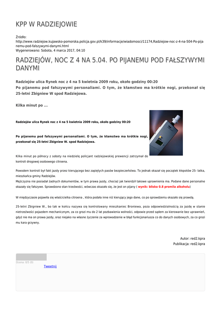 KPP W RADZIEJOWIE Źródło: http://www.radziejow.kujawsko-pomorska.policja.gov.pl/k39/informacje/wiadomosci/11174,Radziejow-noc-z-4-na-504-Po-pija nemu-pod-falszywymi-danymi.html Wygenerowano: Sobota, 4 marca 2017, 04:10 RADZIEJÓW, NOC Z 4 NA 5.04. PO PIJANEMU POD FAŁSZYWYMI DANYMI Radziejów ulica Rynek noc z 4 na 5 kwietnia 2009 roku, około godziny 00:20 Po pijanemu pod fałszywymi personaliami. O tym, że kłamstwo ma krótkie nogi, przekonał się 25-letni Zbigniew W spod Radziejowa. Kilka minut po ... Radziejów ulica Rynek noc z 4 na 5 kwietnia 2009 roku, około godziny 00:20 Po pijanemu pod fałszywymi personaliami. O tym, że kłamstwo ma krótkie nogi, przekonał się 25-letni Zbigniew W. spod Radziejowa. Kilka minut po północy z soboty na niedzielę policjant radziejowskiej prewencji zatrzymał do kontroli drogowej osobowego citroena. Powodem kontroli był fakt jazdy przez kierującego bez zapiętych pasów bezpieczeństwa. To jednak okazał się początek kłopotów 25- latka, mieszkańca gminy Radziejów. Mężczyzna nie posiadał żadnych dokumentów, w tym prawa jazdy, chociaż jak twierdził takowe uprawnienia ma. Podane dane personalne okazały się fałszywe. Sprawdzono stan trzeźwości, wówczas okazało się, że jest on pijany ( wynik: blisko 0.8 promila alkoholu) W międzyczasie pojawiła się właścicielka citroena , która podała inne niż kierujący jego dane, co po sprawdzeniu okazało się prawdą. 25-letni Zbigniew W., bo tak w końcu nazywa się kontrolowany mieszkaniec Broniewa, poza odpowiedzialnością za jazdę w stanie nietrzeźwości pojazdem mechanicznym, za co grozi mu do 2 lat pozbawienia wolności, odpowie przed sądem za kierowanie bez uprawnień, gdyż nie ma on prawa jazdy, oraz niejako na własne życzenie za wprowadzenie w błąd funkcjonariusza co do danych osobowych, za co grozi mu kara grzywny. Autor: red2.kpra Publikacja: red2.kpra Ocena: 0/5 (0) Tweetnij