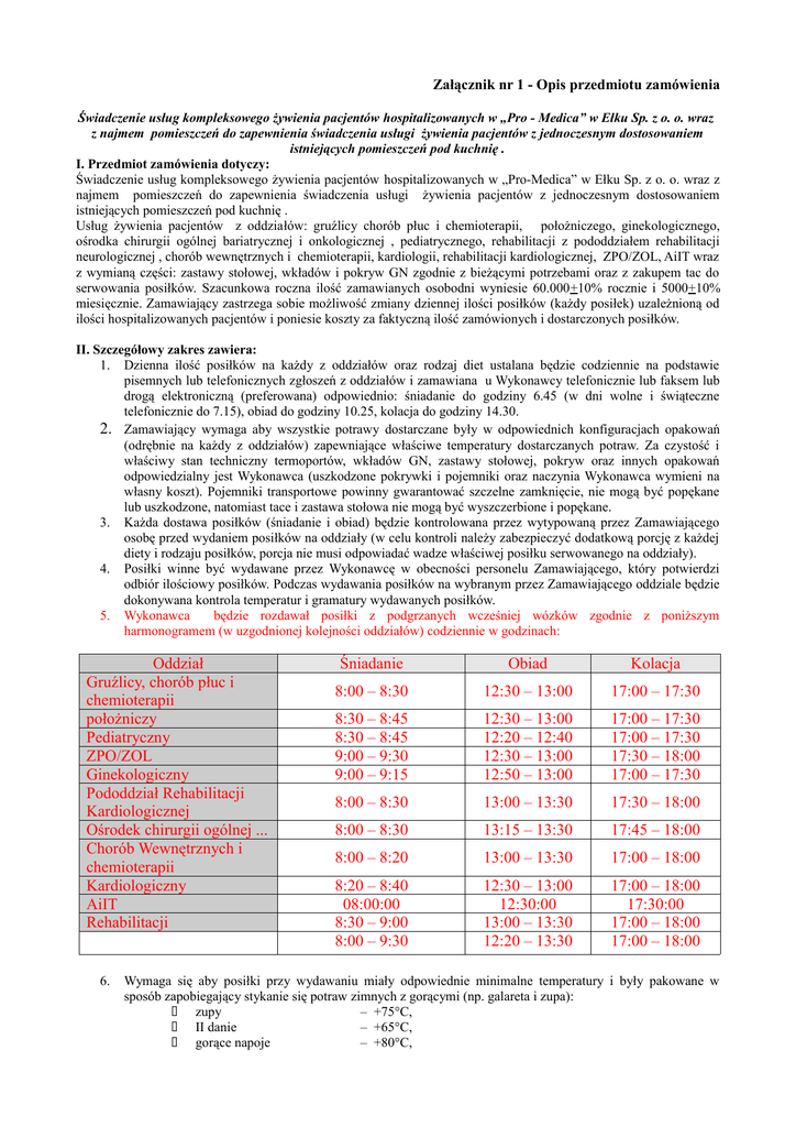Załącznik nr 1 - Opis przedmiotu zamówienia Świadczenie usług kompleksowego żywienia pacjentów hospitalizowanych w „Pro - Medica” w Ełku Sp. z o. o. wraz z najmem pomieszczeń do zapewnienia świadczenia usługi żywienia pacjentów z jednoczesnym dostosowaniem istniejących pomieszczeń pod kuchnię . I. Przedmiot zamówienia dotyczy: Świadczenie usług kompleksowego żywienia pacjentów hospitalizowanych w „Pro-Medica” w Ełku Sp. z o. o. wraz z najmem pomieszczeń do zapewnienia świadczenia usługi żywienia pacjentów z jednoczesnym dostosowaniem istniejących pomieszczeń pod kuchnię . Usług żywienia pacjentów z oddziałów: gruźlicy chorób płuc i chemioterapii, położniczego, ginekologicznego, ośrodka chirurgii ogólnej bariatrycznej i onkologicznej , pediatrycznego, rehabilitacji z pododdziałem rehabilitacji neurologicznej , chorób wewnętrznych i chemioterapii, kardiologii, rehabilitacji kardiologicznej, ZPO/ZOL, AiIT wraz z wymianą części: zastawy stołowej, wkładów i pokryw GN zgodnie z bieżącymi potrzebami oraz z zakupem tac do serwowania posiłków. Szacunkowa roczna ilość zamawianych osobodni wyniesie 60.000+10% rocznie i 5000+10% miesięcznie. Zamawiający zastrzega sobie możliwość zmiany dziennej ilości posiłków (każdy posiłek) uzależnioną od ilości hospitalizowanych pacjentów i poniesie koszty za faktyczną ilość zamówionych i dostarczonych posiłków. II. Szczegółowy zakres zawiera: 1. Dzienna ilość posiłków na każdy z oddziałów oraz rodzaj diet ustalana będzie codziennie na podstawie pisemnych lub telefonicznych zgłoszeń z oddziałów i zamawiana u Wykonawcy telefonicznie lub faksem lub drogą elektroniczną (preferowana) odpowiednio: śniadanie do godziny 6.45 (w dni wolne i świąteczne telefonicznie do 7.15), obiad do godziny 10.25, kolacja do godziny 14.30. 2. Zamawiający wymaga aby wszystkie potrawy dostarczane były w odpowiednich konfiguracjach opakowań (odrębnie na każdy z oddziałów) zapewniające właściwe temperatury dostarczanych potraw. Za czystość i właściwy stan techniczny termoportów, wkładów GN, zastawy stołowej, pokryw oraz innych opakowań odpowiedzialny jest Wykonawca (uszkodzone pokrywki i pojemniki oraz naczynia Wykonawca wymieni na własny koszt). Pojemniki transportowe powinny gwarantować szczelne zamknięcie, nie mogą być popękane lub uszkodzone, natomiast tace i zastawa stołowa nie mogą być wyszczerbione i popękane. 3. Każda dostawa posiłków (śniadanie i obiad) będzie kontrolowana przez wytypowaną przez Zamawiającego osobę przed wydaniem posiłków na oddziały (w celu kontroli należy zabezpieczyć dodatkową porcję z każdej diety i rodzaju posiłków, porcja nie musi odpowiadać wadze właściwej posiłku serwowanego na oddziały). 4. Posiłki winne być wydawane przez Wykonawcę w obecności personelu Zamawiającego, który potwierdzi odbiór ilościowy posiłków. Podczas wydawania posiłków na wybranym przez Zamawiającego oddziale będzie dokonywana kontrola temperatur i gramatury wydawanych posiłków. 5. Wykonawca będzie rozdawał posiłki z podgrzanych wcześniej wózków zgodnie z poniższym harmonogramem (w uzgodnionej kolejności oddziałów) codziennie w godzinach: Oddział Gruźlicy, chorób płuc i chemioterapii położniczy Pediatryczny ZPO/ZOL Ginekologiczny Pododdział Rehabilitacji Kardiologicznej Ośrodek chirurgii ogólnej ... Chorób Wewnętrznych i chemioterapii Kardiologiczny AiIT Rehabilitacji 6. Śniadanie Obiad Kolacja 8:00 – 8:30 12:30 – 13:00 17:00 – 17:30 8:30 – 8:45 8:30 – 8:45 9:00 – 9:30 9:00 – 9:15 12:30 – 13:00 12:20 – 12:40 12:30 – 13:00 12:50 – 13:00 17:00 – 17:30 17:00 – 17:30 17:30 – 18:00 17:00 – 17:30 8:00 – 8:30 13:00 – 13:30 17:30 – 18:00 8:00 – 8:30 13:15 – 13:30 17:45 – 18:00 8:00 – 8:20 13:00 – 13:30 17:00 – 18:00 8:20 – 8:40 08:00:00 8:30 – 9:00 8:00 – 9:30 12:30 – 13:00 12:30:00 13:00 – 13:30 12:20 – 13:30 17:00 – 18:00 17:30:00 17:00 – 18:00 17:00 – 18:00 Wymaga się aby posiłki przy wydawaniu miały odpowiednie minimalne temperatury i były pakowane w sposób zapobiegający stykanie się potraw zimnych z gorącymi (np. galareta i zupa): zupy – +75°C, II danie – +65°C, gorące napoje – +80°C, sałatki, surówki, wędlina – od 2°C do +6°C (+/-2°C), temperatury dostarczanych posiłków mogą obiegać od powyższych w przypadku gdy producent pisemnie (wymagana jest:etykieta na opakowaniu lub oświadczenie producenta) zezwala na podawanie w/w potraw w temperaturach innych niż podane powyżej. 7. Transport posiłków na oddziały odbywać się będzie za pośrednictwem personelu Wykonawcy przy użyciu wózków bemarowych (grzewczych), zapewniających odpowiednie temperatury posiłków podczas transportu na oddziały. Wózki przed zapakowaniem żywości powinny być ogrzane do właściwych temperatur i wyposażone w odpowiednią ilość zastawy stołowej (oddział gruźlicy chorób płuc i chemioterapii – naczynia jednorazowe) w dzierżawionych pomieszczeniach przez Wykonawcę. Zamawiający jest w posiadaniu 9 wózków podgrzewanych oraz 150 kpl naczyń stołowych, które może na okres realizacji umowy nieodpłatnie przekazać dla Wykonawcy. Brakujące wózki, wkłady GN, pokrywki do wkładów GN oraz zastawę stołową Wykonawca będzie uzupełniał na własny koszt. 8. Zmywanie zastawy stołowej, wkładów GN, wózków transportowych i innych pojemników do żywności odbywać się będzie w wyznaczonych pomieszczeniach dzierżawionych przez Wykonawcę przez personel Wykonawcy usługi. Zamawiający nie ponosi odpowiedzialności za uszkodzoną lub zaginioną zastawę stołową /talerze, sztućce, kubki i tace / oraz wózki grzewcze, wkłady GN, pokrywki GN itp. 9. Każdy posiłek podstawowy – śniadanie, obiad, kolacja – powinien być urozmaicony, apetyczny, estetycznie wyglądający, przygotowany zgodnie z zasadami 