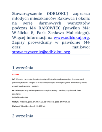 Stowarzyszenie ODBLOKUJ zaprasza młodych mieszkańców Rakowca i okolic na serię darmowych warsztatów podczas M4 RAKOWIEC (pawilon M4: Wiślicka 8, Park Zasława Malickiego). Więcej informacji na www.odblokuj.org. Zapisy prowadzimy w pawilonie M4 oraz mailowo: [email protected]. 1 września VLEPKI Co? Warsztat tworzenia vlepek o tematyce blokowiskowej nawiązujący do przestrzeni publicznej Rakowca. Vlepka to mała samoprzylepna forma plastyczna, dzięki której można wyrazić swoje emocje i poglądy. Po co? Przybliżymy technikę tworzenia vlepki – jednej z bardziej popularnych form streetartu. Gdzie? Pawilon M4 Kiedy? 1 września, godz. 14.00-16.00, 15 września, godz. 14.00-16.00 Dla kogo? Młodzież, dorośli (12-100 lat) 2 września NAUKA GRY WE FRISBEE Co? Zabawa frisbee polega na rzucaniu i łapaniu dysku w kształcie talerza. To dobra okazja na poznanie entuzjastów miejskich sportów, które można praktykować na pobliskich trawnikach. Po co? Zajęcia ruchowe propagujące aktywne spędzanie czasu na świeżym powietrzu. Gdzie? Przy pawilonie M4 Kiedy? 2 września, godz. 14:00-16:00 Dla kogo? Dzieci, Młodzież, dorośli (10-100) 8 września MIEJSKA BIŻUTERIA Co? Miasto inspiruje, miasto wyzwala w nas twórczą energię. Wiele osób stara się zdobić miasto swoimi działaniami, wiele osób zdobi siebie biżuterią z elementami miasta, my natomiast będziemy zdobić miasto biżuterią użytkową. Zrobimy przedmioty wykorzystując ekologiczne surowce, które prócz ozdobnej będą pełniły dodatkową funkcję – poznacie ją w trakcie warsztatu! Po co? W trakcie warsztatu dowiemy się jak sami możemy zdobić miasto oraz jak możemy ułatwić mieszkanie w nim, nie tylko ludziom. Nauczymy się wykorzystywać otaczającą nas przyrodę do tworzenia małych dzieł sztuki. Zajęcia manualne zainspirują nas do działania w jesienne i zimowe wieczory. Gdzie? Pawilon M4 Kiedy? 8 września, godz. 16:00-18:00 Dla kogo? Młodzież, Dorośli (15-100) DOM KULTURY MARZEŃ Co? Do kogo należy dom kultury? Kto jest za niego odpowiedzialny? Jaka jest jego przyszłość? Podziel się opiniami na temat tego miejsca umieszczając swoje wspomnienia i przemyślenia na ścianach wewnątrz budynku. Pomogą Ci w tym wolontariusze oprowadzający tego dnia po kryjącym wiele niespodzianek budynku. Po co? Zebrane opinie posłużą nie tylko poprawie funkcjonowania Domu Kultury „Rakowiec”, ale posłużą także jako źródło cennych informacji dotyczących potrzeb mieszkańców. Postaramy się odpowiedzieć na pytanie o odpowiedzialność użytkowników względem tego miejsca. Gdzie? Dom Kultury „Rakowiec” Kiedy? 8 września, godz. 12:00-18:00 Dla kogo? Młodzież, Dorośli (15-100) 9 września CAPOEIRA REGIONAL Co? Zapraszamy na warsztaty capoeiry dla dzieci i dorosłych, na które składać się będą trening i opowieść o Brazylii i capoeirze. Capoeira to najpiękniejsza sztuka walki i najniebezpieczniejszy taniec. Po co? Capoeira rozwija ciało, umysł i duszę, miesza ruch z muzyką, walkę z tańcem i akrobacją. Gdzie? Przy pawilonie M4 Kiedy? 9 września godz. 14:00-16:00 Dla kogo? Młodzież, dorośli (15-100) 14 września HUMAN BEATBOX Co? Human beatbox - doskonała okazja do zdobycia wiedzy na temat sztuki rytmicznego tworzenia dźwięków ustami, a przy tym niesamowita zabawa w miłym gronie. Po co? By rozwinąć swoje umiejętności rytmiczno-muzyczne poprzez naukę nietypowego sposobu tworzenia muzyki bez użycia instrumentów. Gdzie? Pawilon M4 Kiedy? 14 września godz. 16:00-18:00 Dla kogo? wszyscy (0-100) 15 września MIASTO W KOMIKSIE Co? Nauka rysowania komiksu od podstaw. Twój blok, podwórko, boisko w zupełnie nowej odsłonie! Po co? Możesz podzielić się swoimi historiami wprost z blokowiska umieszczając je we własnoręcznie wykonanym komiksie. Gdzie? Pawilon M4 Kiedy? 15 września 16:00-18:00 Dla kogo? Młodzież, Dorośli (15-100) Jesteś rodzicem, masz młodsze rodzeństwo? Podczas M4 RAKOWIEC dzieci poznają tajniki osiedlowej archeologii, stworzą własny plac zabaw oraz baśniowy ogródek ziołowy. Rodzice nadadzą nowe oblicze starym meblom, zrelaksują się ćwicząc Quigong, podczas Rakowieckiego Departamentu Propozycji stworzą sąsiedzką wizję osiedla. Lubisz gotować? Podziel się przepisem! Chcesz wiedzieć co piszczy w trawie? Poznaj najmniejszych sublokatorów swojego M! Chcesz wiedzieć więcej? Zajrzyj do nas!