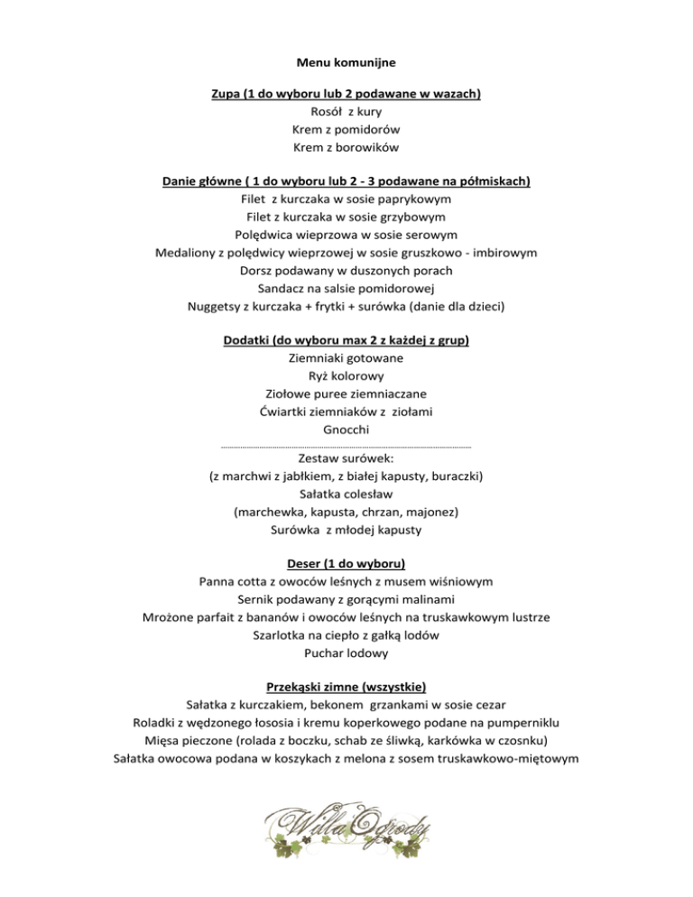 Menu komunijne Zupa (1 do wyboru lub 2 podawane w wazach) Rosół z kury Krem z pomidorów Krem z borowików Danie główne ( 1 do wyboru lub 2 - 3 podawane na półmiskach) Filet z kurczaka w sosie paprykowym Filet z kurczaka w sosie grzybowym Polędwica wieprzowa w sosie serowym Medaliony z polędwicy wieprzowej w sosie gruszkowo - imbirowym Dorsz podawany w duszonych porach Sandacz na salsie pomidorowej Nuggetsy z kurczaka + frytki + surówka (danie dla dzieci) Dodatki (do wyboru max 2 z każdej z grup) Ziemniaki gotowane Ryż kolorowy Ziołowe puree ziemniaczane Ćwiartki ziemniaków z ziołami Gnocchi ……………………………………………………………………………………………………… Zestaw surówek: (z marchwi z jabłkiem, z białej kapusty, buraczki) Sałatka colesław (marchewka, kapusta, chrzan, majonez) Surówka z młodej kapusty Deser (1 do wyboru) Panna cotta z owoców leśnych z musem wiśniowym Sernik podawany z gorącymi malinami Mrożone parfait z bananów i owoców leśnych na truskawkowym lustrze Szarlotka na ciepło z gałką lodów Puchar lodowy Przekąski zimne (wszystkie) Sałatka z kurczakiem, bekonem grzankami w sosie cezar Roladki z wędzonego łososia i kremu koperkowego podane na pumperniklu Mięsa pieczone (rolada z boczku, schab ze śliwką, karkówka w czosnku) Sałatka owocowa podana w koszykach z melona z sosem truskawkowo-miętowym Napoje (bez ograniczeń) Kawa, herbata, soki owocowe, woda z cytryną Menu dorośli 129,00zł Menu dla dzieci 119,00zł (przy wyborze dań dla dzieci) Dodatkowe koszty: Opłata serwisowa za własne ciasto 3zł / os Opłata serwisowa za własny tort 3zł / os Zapewniamy animatora dla dzieci przy minimum 50% obłożeniu lokalu.