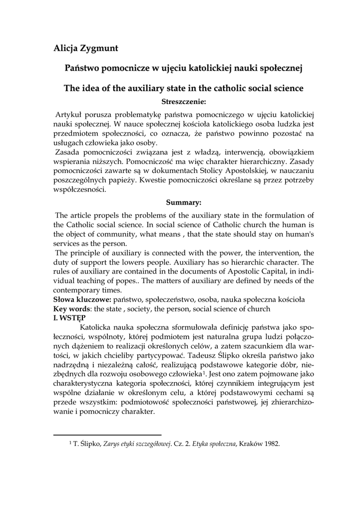 Alicja Zygmunt Państwo pomocnicze w ujęciu katolickiej nauki społecznej The idea of the auxiliary state in the catholic social science Streszczenie: Artykuł porusza problematykę państwa pomocniczego w ujęciu katolickiej nauki społecznej. W nauce społecznej kościoła katolickiego osoba ludzka jest przedmiotem społeczności, co oznacza, że państwo powinno pozostać na usługach człowieka jako osoby. Zasada pomocniczości związana jest z władzą, interwencją, obowiązkiem wspierania niższych. Pomocniczość ma więc charakter hierarchiczny. Zasady pomocniczości zawarte są w dokumentach Stolicy Apostolskiej, w nauczaniu poszczególnych papieży. Kwestie pomocniczości określane są przez potrzeby współczesności. Summary: The article propels the problems of the auxiliary state in the formulation of the Catholic social science. In social science of Catholic church the human is the object of community, what means , that the state should stay on human's services as the person. The principle of auxiliary is connected with the power, the intervention, the duty of support the lowers people. Auxiliary has so hierarchic character. The rules of auxiliary are contained in the documents of Apostolic Capital, in individual teaching of popes.. The matters of auxiliary are defined by needs of the contemporary times. Słowa kluczowe: państwo, społeczeństwo, osoba, nauka społeczna kościoła Key words: the state , society, the person, social science of church I. WSTĘP Katolicka nauka społeczna sformułowała definicję państwa jako społeczności, wspólnoty, której podmiotem jest naturalna grupa ludzi połączonych dążeniem to realizacji określonych celów, a zatem szacunkiem dla wartości, w jakich chcieliby partycypować. Tadeusz Ślipko określa państwo jako nadrzędną i niezależną całość, realizującą podstawowe kategorie dóbr, niezbędnych dla rozwoju osobowego człowieka 1. Jest ono zatem pojmowane jako charakterystyczna kategoria społeczności, której czynnikiem integrującym jest wspólne działanie w określonym celu, a której podstawowymi cechami są przede wszystkim: podmiotowość społeczności państwowej, jej zhierarchizowanie i pomocniczy charakter. 1 T. Ślipko, Zarys etyki szczegółowej. Cz. 2. Etyka społeczna, Kraków 1982. __________________________Alicja Zygmunt____________________________ Podmiotowość państwa sprowadza się do zdolności jego niezależnego istnienia i działania, ale także autonomii we wszystkich dziedzinach życia. Ponieważ społeczność państwowa stanowi konstrukcję składającą się z niejednolitych mniejszych, zróżnicowanych między sobą społeczności, dlatego rzeczą oczywistą jest to, że musi ona dysponować odpowiednimi organami kierowniczymi, którym owa liczność członków jest przyporządkowana. Państwo jest wobec tego nie tylko wspólnotą złożoną z wielu podmiotów, ale również wspólnotą o charakterze hierarchicznym 2. Bardzo istotną właściwością społeczności państwowej jest jej aspekt pomocniczy, wskazujący na fundamentalne z punktu widzenia katolickiej nauki społecznej twierdzenie, że osoba ludzka jest podmiotem tej społeczności, co oznacza, że państwo w swym działaniu powinno pozostać na usługach człowieka jako osoby 3. Mądre i holistyczne korzystanie z zasady pomocniczości ma bez wątpienia wymiar polityczny, gdyż jest powiązane z władzą. Pomocniczość oznacza bowiem dyslokację władzy. Tłumaczy to wielorakie opory w jej stosowaniu, niezależnie od składanych deklaracji. Tłumaczy także możliwość instrumentalnego politycznego jej wykorzystania, kiedy między innymi stosuje się tę zasadę po to, ażeby odebrać władzę przeciwnikom, a dać swoim i kiedy chce się ją stosować dla uzyskania władzy, a nie aby reagować lepiej na potrzeby społeczne 4. Zasada pomocniczości dyktuje obowiązek pomagania jednostkom niższym przez wyższe, tak aby mogły one realizować swoje zadania – gminy powinny tak realizować politykę, aby jak największa ilość zadań była realizowana przez podmioty mniejsze (wspólnoty lokalne i środowiskowe, a w tym i lokalne organizacje pozarządowe). Państwo powinno zatem jak najwięcej spraw przekazywać do prowadzenia samorządom terytorialnym. Państwo według nowoczesnej koncepcji pomocniczości może interweniować na dwa sposoby – nieść pomoc albo w postaci środków, albo w formie rezultatów. Preferowana jest w tym przypadku możliwość pierwsza, gdyż państwo oferuje wówczas warunki społecznego działania, podczas gdy w drugim wypadku jedynie dobra materialne. Najważniejsze jest, aby realizować własne możliwości, wykorzystywać swój potencjał oraz rozwijać własną energię. W 2 s. 341. A. Zwoliński (red.), Encyklopedia nauczania społecznego Jana Pawła II, Radom 2003, Ibidem. S. Fontana, Zasada pomocniczości i obecność katolików w życiu publicznym, „Społeczeństwo” 2002, nr 3-4, s.359. 3 4 358 ________Państwo pomocnicze w ujęciu katolickiej nauki społecznej_________ ten też sposób dochodzimy do pojęcia wolności, czyli możliwości „spełniania się o własnych siłach” 5. Zasada pomocniczości przynosi wizję społeczeństwa żywego, gdzie w sposób swobodny powstaje wiele grup, podejmujących różne inicjatywy i mogących pośredniczyć między jednostką a państwem. By jednak znalazła ona odpowiednie odzwierciedlenie w praktyce, powinny być spełnione następujące warunki: zaufanie do zdolności społecznych podmiotów i ich troski o interes ogółu; przyjęcie założenia, że władzy z samej jej natury nie przysługuje absolutna kompetencja w sprawach określenia i realizacji interesu ogółu; co najważniejsze: po stronie podmiotów społecznych ma istnieć wola autonomii i inicjatywa, „co zakłada, że nie zostały złamane przez państwo totalitarne ani doprowadzone do zdziecinnienia przez państwo paternalistyczne” 6. Interwencja państwa jest zasadna