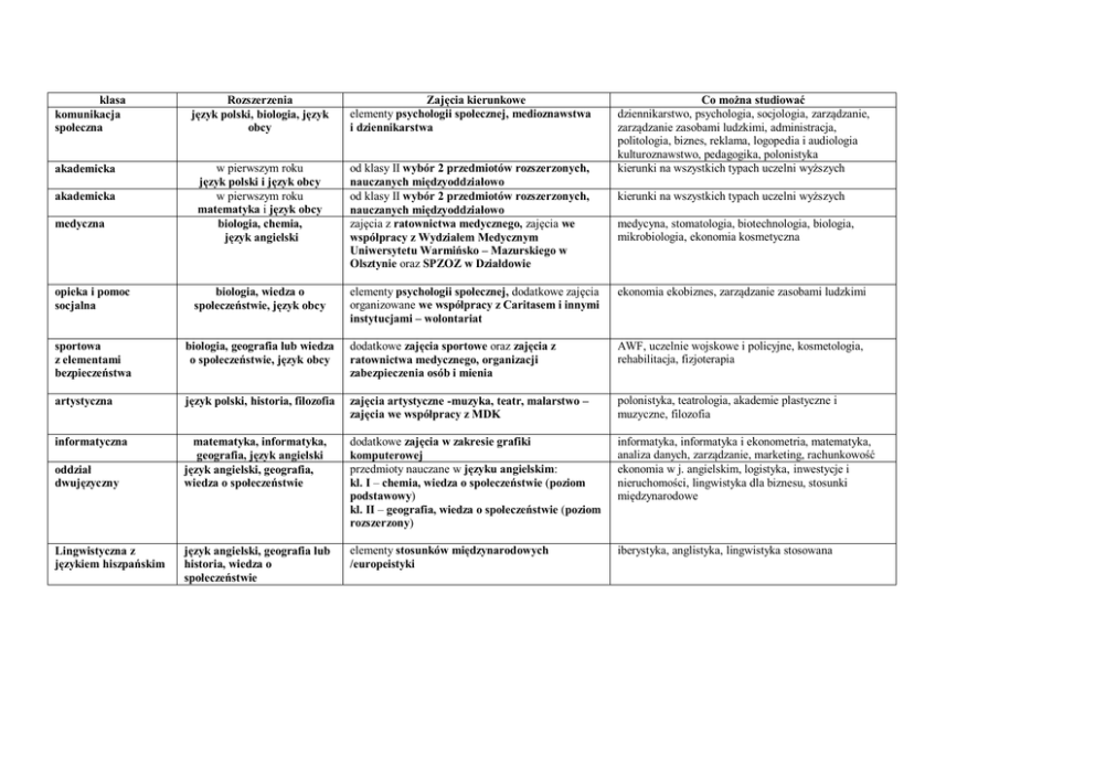 Rozszerzenia język polski, biologia, język obcy Zajęcia kierunkowe elementy psychologii społecznej, medioznawstwa i dziennikarstwa w pierwszym roku język polski i język obcy w pierwszym roku matematyka i język obcy biologia, chemia, język angielski od klasy II wybór 2 przedmiotów rozszerzonych, nauczanych międzyoddziałowo od klasy II wybór 2 przedmiotów rozszerzonych, nauczanych międzyoddziałowo zajęcia z ratownictwa medycznego, zajęcia we współpracy z Wydziałem Medycznym Uniwersytetu Warmińsko – Mazurskiego w Olsztynie oraz SPZOZ w Działdowie opieka i pomoc socjalna biologia, wiedza o społeczeństwie, język obcy elementy psychologii społecznej, dodatkowe zajęcia organizowane we współpracy z Caritasem i innymi instytucjami – wolontariat ekonomia ekobiznes, zarządzanie zasobami ludzkimi sportowa z elementami bezpieczeństwa biologia, geografia lub wiedza o społeczeństwie, język obcy dodatkowe zajęcia sportowe oraz zajęcia z ratownictwa medycznego, organizacji zabezpieczenia osób i mienia AWF, uczelnie wojskowe i policyjne, kosmetologia, rehabilitacja, fizjoterapia artystyczna język polski, historia, filozofia zajęcia artystyczne -muzyka, teatr, malarstwo – zajęcia we współpracy z MDK polonistyka, teatrologia, akademie plastyczne i muzyczne, filozofia informatyczna matematyka, informatyka, geografia, język angielski język angielski, geografia, wiedza o społeczeństwie dodatkowe zajęcia w zakresie grafiki komputerowej przedmioty nauczane w języku angielskim: kl. I – chemia, wiedza o społeczeństwie (poziom podstawowy) kl. II – geografia, wiedza o społeczeństwie (poziom rozszerzony) informatyka, informatyka i ekonometria, matematyka, analiza danych, zarządzanie, marketing, rachunkowość ekonomia w j. angielskim, logistyka, inwestycje i nieruchomości, lingwistyka dla biznesu, stosunki międzynarodowe język angielski, geografia lub historia, wiedza o społeczeństwie elementy stosunków międzynarodowych /europeistyki iberystyka, anglistyka, lingwistyka stosowana klasa komunikacja społeczna akademicka akademicka medyczna oddział dwujęzyczny Lingwistyczna z językiem hiszpańskim Co można studiować dziennikarstwo, psychologia, socjologia, zarządzanie, zarządzanie zasobami ludzkimi, administracja, politologia, biznes, reklama, logopedia i audiologia kulturoznawstwo, pedagogika, polonistyka kierunki na wszystkich typach uczelni wyższych kierunki na wszystkich typach uczelni wyższych medycyna, stomatologia, biotechnologia, biologia, mikrobiologia, ekonomia kosmetyczna