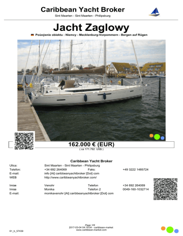 Caribbean Yacht Broker Sint Maarten - Sint Maarten - Philipsburg Jacht Zaglowy Poùoýenie obiektu : Niemcy - Mecklenburg-Vorpommern - Bergen auf Rügen 162.000 € (EUR) ( ca 171.792 US$ ) Caribbean Yacht Broker Ulica: Telefon: E-mail: WEB Sint Maarten - Sint Maarten - Philipsburg +34 692 264069 Faks: info [At] caribbeanyachtbroker [Dot] com http://www.caribbeanyachtbroker.com/ Imiæ Imiæ E-mail: Venohr Telefon Monika Telefon 2 monikavenohr [At] caribbeanyachtbroker [Dot] com 61_b_57439 Page 1/9 2017-03-04 04:19:04 - caribbean-market www.caribbean-market.com +49 3222 1485724 +34 692 264069 0049-160-1032714 Caribbean Yacht Broker Sint Maarten - Sint Maarten - Philipsburg Typ ùodzi Numer kodu Typ ùodzi Producent: Model Designer Stan Materiaù Olinowanie Rok Kolor Dùugoúã LOA Dùugoúã LWL Wysokoúã pomieszczeñ Waga 61_b_57439 Jacht Zaglowy Jeanneau Sun Odyssey 439 P. Briand Excellent CSF Slup 2013 biaùy 13,34 m ( 43,8 ft ) 12,00 m ( 39,4 ft ) 19,61 m ( 64,3 ft ) 9.640,0 kg ( 21.253 lbs ) Numer kodu Zgùoú Niemcy Ksztaùt kadùuba Kokpit Naprawianych roku Kontrola Szerokoúã Szkic Jednokadùubowy Kokpit Aft Waga (Ballast) 2.850,0 kg ( 6.283 lbs ) Podwójne koùa - lina 4,24 m ( 13,9 ft ) 2,20 m ( 7,2 ft ) Dane na temat silnika - Napædy Silnik gùówny Prowadziã Wydajnoúã Rok Propeller Proste Yanmar Model Paliwo: 54,0 PS ( 40 KW ) Godziny otwarcia Prædkoúã maksymalna Tankdaten Iloúã paliwa Woda Kanalizacja 61_b_57439 200 L( 53 Gal ) 330 L( 87 Gal ) 80 L( 21 Gal ) Page 2/9 2017-03-04 04:19:04 - caribbean-market www.caribbean-market.com 3JH5-CE Caribbean Yacht Broker Sint Maarten - Sint Maarten - Philipsburg Sprzæt Okræty Instruments Zaloguj Compass GPS Anemometr Scoreboard Sonar Radar Ploter NavText Fax Pogoda VHF Radio SSB Pactor El Autopilot Wiatr Kontroli Fishfinder AIS Komputer Wyposaýenie techniczne Odtwarzacz CD Radio Telewizja Ùàcznoúã satelitarna Systemu 12 V DC Systemu 24 V DC Ùadowarka Solar Cells Wiatr Generator Wave Generator Generator 110-220 V Invertor 110-220 V Moc Shore Ogrzewanie Klimatyzacja Druckwasseranlage Systemu ciepùej wody Gazowniæ Watermaker Ster strumieniowy Divecompressor Bilgepump elektrycznie Bilgepump Maunel 61_b_57439 Urzadzenie & podzial Boat Equipment 4 8 2 2 1 Anchor Winda kotwiczna Teak Kàpieliska Ladder Prysznic rufowy Rack Equipment Trap Daivits Davit Ùódki Ùódki m. AB Bukszpryt Trim Tabs Wyposaýenie wnætrz Flybridge 2. Helm na lot Boat Trailer Kabiny Koje Toalety Zùy Wùaúciciele kabiny Spiýarnia Zatopiã Kuchenka gazowa Kuchenka elektryczna Piec Benzyna Piekarnik gazowy Piekarnik Elektryczny Lodówka Zamraýarka Kuchenka mikrofalowa Zmywarka Pralnia Bezpieczeñstwo Kamizelki ratunkowe Liferaft EPRIB Szperacze System Gaúnice Page 3/9 2017-03-04 04:19:04 - caribbean-market www.caribbean-market.com Inne dodatki Szyber dach Hafenpersenning Latajàcy most Ganzpersenning Cieñ niedz Fly Markiza na rufie pokùad Bimini Sprayhood Caribbean Yacht Broker Sint Maarten - Sint Maarten - Philipsburg 61_b_57439 Page 4/9 2017-03-04 04:19:04 - caribbean-market www.caribbean-market.com Caribbean Yacht Broker Sint Maarten - Sint Maarten - Philipsburg Jeanneau Sun Odyssey 439 - 2013 Jeanneau Sun Odyssey 439 - 2013 61_b_57439 Page 5/9 2017-03-04 04:19:04 - caribbean-market www.caribbean-market.com Caribbean Yacht Broker Sint Maarten - Sint Maarten - Philipsburg Jeanneau Sun Odyssey 439 - 2013 Jeanneau Sun Odyssey 439 - 2013 61_b_57439 Page 6/9 2017-03-04 04:19:04 - caribbean-market www.caribbean-market.com Caribbean Yacht Broker Sint Maarten - Sint Maarten - Philipsburg Jeanneau Sun Odyssey 439 - 2013 Jeanneau Sun Odyssey 439 - 2013 61_b_57439 Page 7/9 2017-03-04 04:19:04 - caribbean-market www.caribbean-market.com Caribbean Yacht Broker Sint Maarten - Sint Maarten - Philipsburg Jeanneau Sun Odyssey 439 - 2013 Jeanneau Sun Odyssey 439 - 2013 61_b_57439 Page 8/9 2017-03-04 04:19:04 - caribbean-market www.caribbean-market.com Caribbean Yacht Broker Sint Maarten - Sint Maarten - Philipsburg Jeanneau Sun Odyssey 439 - 2013 61_b_57439 Page 9/9 2017-03-04 04:19:04 - caribbean-market www.caribbean-market.com