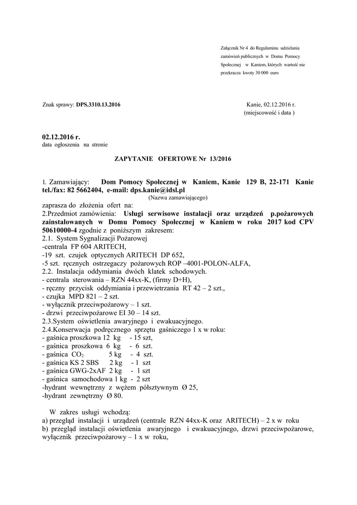 Załącznik Nr 4 do Regulaminu udzielania zamówień publicznych w Domu Pomocy Społecznej w Kaniem, których wartość nie przekracza kwoty 30 000 euro Znak sprawy: DPS.3310.13.2016 Kanie, 02.12.2016 r. (miejscowość i data ) 02.12.2016 r. data ogłoszenia na stronie ZAPYTANIE OFERTOWE Nr 13/2016 1. Zamawiający: Dom Pomocy Społecznej w Kaniem, Kanie 129 B, 22-171 Kanie tel./fax: 82 5662404, e-mail: [email protected] (Nazwa zamawiającego) zaprasza do złożenia ofert na: 2.Przedmiot zamówienia: Usługi serwisowe instalacji oraz urządzeń p.pożarowych zainstalowanych w Domu Pomocy Społecznej w Kaniem w roku 2017 kod CPV 50610000-4 zgodnie z poniższym zakresem: 2.1. System Sygnalizacji Pożarowej -centrala FP 604 ARITECH, -19 szt. czujek optycznych ARITECH DP 652, -5 szt. ręcznych ostrzegaczy pożarowych ROP –4001-POLON-ALFA, 2.2. Instalacja oddymiania dwóch klatek schodowych. - centrala sterowania – RZN 44xx-K, (firmy D+H), - ręczny przycisk oddymiania i przewietrzania RT 42 – 2 szt., - czujka MPD 821 – 2 szt. - wyłącznik przeciwpożarowy – 1 szt. - drzwi przeciwpożarowe EI 30 – 14 szt. 2.3.System oświetlenia awaryjnego i ewakuacyjnego. 2.4.Konserwacja podręcznego sprzętu gaśniczego 1 x w roku: - gaśnica proszkowa 12 kg - 15 szt, - gaśnica proszkowa 6 kg - 6 szt. - gaśnica CO2 5 kg - 4 szt. - gaśnica KS 2 SBS 2 kg - 1 szt - gaśnica GWG-2xAF 2 kg - 1 szt - gaśnica samochodowa 1 kg - 2 szt -hydrant wewnętrzny z wężem półsztywnym Ø 25, -hydrant zewnętrzny Ø 80. W zakres usługi wchodzą: a) przegląd instalacji i urządzeń (centrale RZN 44xx-K oraz ARITECH) – 2 x w roku b) przegląd instalacji oświetlenia awaryjnego i ewakuacyjnego, drzwi przeciwpożarowe, wyłącznik przeciwpożarowy – 1 x w roku, c) przegląd gaśnic i hydrantów – 1 x w roku, d) sprawdzenie sprawności działania, e) wymiana elementów, których termin jest określony przez producenta ( np. akumulatory), f) konserwacja, g) sporządzenie protokołu. h) ewentualne naprawy. 3. Termin realizacji zamówienia: od 01.01.2017 r. do 31.12.2017 r. 4. Okres gwarancji: czas trwania umowy. 5. Miejsce i termin złożenia oferty: Dom Pomocy Społecznej w Kaniem, Dział Księgowości w terminie do godz. 11.00 w dniu 16.12.2016r. osobiście, za pośrednictwem Poczty Polskiej lub kurierem. 6. Termin otwarcia ofert: 16.12.2016 r., godz.11.05. Kryterium oceny ofert: najniższa cena. 7. Warunki płatności: przelew 21 dni od dnia otrzymania faktury. 8. Osoba upoważniona do kontaktu z wykonawcami: Elżbieta Florczak tel. 82 5662404. 9. Sposób przygotowania oferty: ofertę należy sporządzić w formie pisemnej, w języku polskim w zamkniętej, opieczętowanej kopercie opisanej: Usługi serwisowe instalacji oraz urządzeń p.pożarowych zainstalowanych w Domu Pomocy Społecznej w Kaniem- 2017”. 10.Treść oferty: 10.1 Nazwa wykonawcy.............................................................................................................. 10.2 Adres wykonawcy............................................................................................................… 10.3 NIP .................................................................................................................................... 10.4 Regon.................................................................................................................................... 10.5 Nr rachunku bankowego.................................................................................................…. 10.6 Oferuję wykonanie przedmiotu zamówienia za: Cenę netto...........................................…..zł (słownie złotych..................................................... …................................................................................................................................................). Podatek VAT......................................zł (słownie złotych........................................................... …................................................................................................................................…............). Cenę brutto.........................................zł (słownie złotych............................................................. …................................................................................................................................................). 10.7. Oświadczam, że zapoznałem się z opisem przedmiotu zamówienia i nie wnoszę do niego zastrzeżeń. 10.8. Termin realizacji zamówienia: od 01.01.2017 r. do 31.12.2017 r. 10.9. Okres gwarancji: czas trwania umowy 10.10. Potwierdzam termin realizacji zamówienia do dnia 31.12.2017 r. 10.11. Wyrażam zgodę na warunki płatności określone w zapytaniu ofertowym. 10.12. Do oferty dołączam (wymagane) potwierdzony za zgodność odpis z KRS lub wypis z CEIDG określający profil działalności, aktualny na dzień sporządzenia oferty. ……………………........................ (miejscowość, data) …........................................................... (Pieczęć i podpis Wykonawcy lub osoby upoważnionej) Umowa Nr 13/2016 W dniu 30.12.2016 r. pomiędzy: Domem Pomocy Społecznej w Kaniem, NIP: 564-12-72-462, REGON: 0002967673 reprezentowanym przez: Elżbietę Florczak- dyrektora, zwanym w treści umowy Zamawiającym, a …................................................................................................................................................ …................................................................................................................................................... reprezentowanym przez: …................................................................................................................................................... …................................................................................................................................