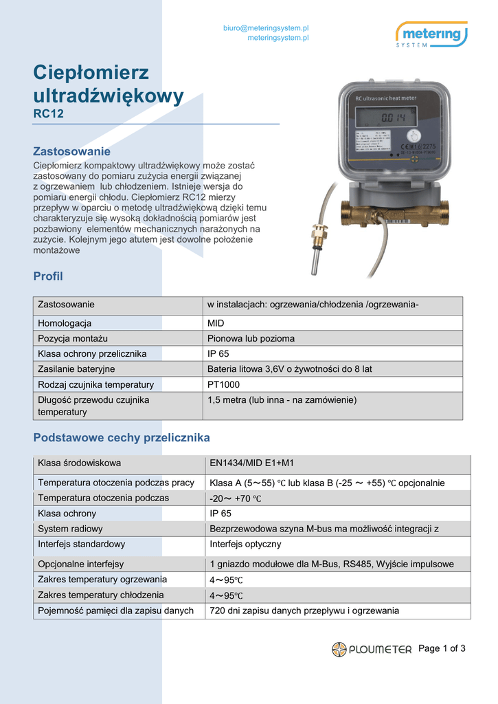 [email protected] meteringsystem.pl Ciepłomierz ultradźwiękowy RC12 Zastosowanie Ciepłomierz kompaktowy ultradźwiękowy może zostać zastosowany do pomiaru zużycia energii związanej z ogrzewaniem lub chłodzeniem. Istnieje wersja do pomiaru energii chłodu. Ciepłomierz RC12 mierzy przepływ w oparciu o metodę ultradźwiękową dzięki temu charakteryzuje się wysoką dokładnością pomiarów jest pozbawiony elementów mechanicznych narażonych na zużycie. Kolejnym jego atutem jest dowolne położenie montażowe Profil Homologacja w instalacjach: ogrzewania/chłodzenia /ogrzewaniachłodzenia MID Pozycja montażu Pionowa lub pozioma Klasa ochrony przelicznika IP 65 Zasilanie bateryjne Bateria litowa 3,6V o żywotności do 8 lat Rodzaj czujnika temperatury PT1000 Długość przewodu czujnika temperatury 1,5 metra (lub inna - na zamówienie) Zastosowanie Podstawowe cechy przelicznika Klasa środowiskowa EN1434/MID E1+M1 Temperatura otoczenia podczas pracy Klasa A (5~55) ℃ lub klasa B (-25 ~ +55) ℃ opcjonalnie Temperatura otoczenia podczas przechowywania Klasa ochrony -20~ +70 ℃ System radiowy Interfejs standardowy Bezprzewodowa szyna M-bus ma możliwość integracji z 868,434,169MHz Interfejs optyczny (OMS) Opcjonalne interfejsy 1 gniazdo modułowe dla M-Bus, RS485, Wyjście impulsowe Zakres temperatury ogrzewania 4~95℃ Zakres temperatury chłodzenia 4~95℃ Pojemność pamięci dla zapisu danych 720 dni zapisu danych przepływu i ogrzewania IP 65 Page 1 of 3 [email protected] meteringsystem.pl Wyświetlacz Typ i rozdzielczość wyświetlacza LCD, 8 znaków Jednostki pomiaru MWh - kWh - GJ - Gcal - ℃ –K - m³ - m³/h Wartości całkowite 99,999,999 - 9,999,999.9 - 999,999.99 - 99,999.999 Wyświetlane wartości Energia - Zasilanie - Objętość - Prędkość przepływu - Temperatura itp. Interfejsy Optyczny Zakres pasma 2400 (standard) M-Bus Zakres pasma 300-9600 (opcjonalny) RS485 Zakres pasma 300-9600 (opcjonalny) Wyjście impulsowe Pojedyncze wyjście impulsowe (opcjonalny) Wejście temperaturowe Min. różnica temperatur Maks. różnica temperatur ΔΘmin K ΔΘmax K Bezwzględny zakres pomiaru temperatury Θ ℃ 3 (możliwość dostosowania do 2K) 105 (możliwość dostosowania do 110) 4 ~95 (możliwość dostosowania do 4-130) Page 2 of 3 [email protected] meteringsystem.pl Wersja z połączeniem gwintowym Nominalna wartość przepływu qp Nominalna średnica DN Długość korpusu L mm Wysokość H Szerokość przelicznika W Przyłącze gwintowe na przetworniku m3/h 0,6 1,5 1,5 1,5 2,5 2,5 mm 15 15 20 20 20 20 110 110 130 190 130 mm 100 75 78 78 mm 101 101 cale Gwint przyłącza na śrubunku cale Ciśnienie robocze G3/4B 101 G3/4B G1B R1/2 R1/2 MPa R3/4 G1B 78 101 101 G1B G1B R3/4 R3/4 R3/4 1,6/2,5 Qp :Qi 50:1, 100:1, 250:1 Nominalna wartość przepływu qp Nominalna średnica DN Długość korpusu L mm 160/290 Wysokość H mm 81 Szerokość przelicznika W mm 101 m3/h 3,5 mm 25 Przyłącze gwintowe na przetworniku cale Gwint przyłącza na śrubunku cale Maks. ciśnienie robocze MPa Qp :Qi 101 78 190 G1 1/4B R1 6 10 32 40 180/260 200/300 84 88 101 G1 1/2B 101 G2B R1 1/4 R1 1/2 1,6/2,5 50:1, 100:1, 250:1 Page 3 of 3