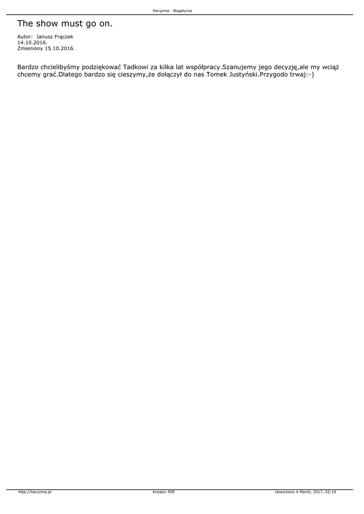 Haryzma - Bogatynia The show must go on. Autor: Janusz Frączek 14.10.2016. Zmieniony 15.10.2016. Bardzo chcielibyśmy podziękować Tadkowi za kilka lat współpracy.Szanujemy jego decyzję,ale my wciąż chcemy grać.Dlatego bardzo się cieszymy,że dołączył do nas Tomek Justyński.Przygodo trwaj:-) http://haryzma.pl Kreator PDF Utworzono 4 March, 2017, 02:19