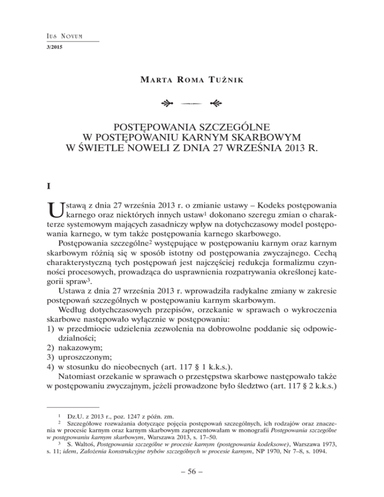 IUS NOVUM 3/2015 M A RTA R O M A T UŻ N I K POSTĘPOWANIA SZCZEGÓLNE W POSTĘPOWANIU KARNYM SKARBOWYM W ŚWIETLE NOWELI Z DNIA 27 WRZEŚNIA 2013 R. I U stawą z dnia 27 września 2013 r. o zmianie ustawy – Kodeks postępowania karnego oraz niektórych innych ustaw1 dokonano szeregu zmian o charakterze systemowym mających zasadniczy wpływ na dotychczasowy model postępowania karnego, w tym także postępowania karnego skarbowego. Postępowania szczególne2 występujące w postępowaniu karnym oraz karnym skarbowym różnią się w sposób istotny od postępowania zwyczajnego. Cechą charakterystyczną tych postępowań jest najczęściej redukcja formalizmu czynności procesowych, prowadząca do usprawnienia rozpatrywania określonej kategorii spraw3. Ustawa z dnia 27 września 2013 r. wprowadziła radykalne zmiany w zakresie postępowań szczególnych w postępowaniu karnym skarbowym. Według dotychczasowych przepisów, orzekanie w sprawach o wykroczenia skarbowe następowało wyłącznie w postępowaniu: 1) w przedmiocie udzielenia zezwolenia na dobrowolne poddanie się odpowiedzialności; 2) nakazowym; 3) uproszczonym; 4) w stosunku do nieobecnych (art. 117 § 1 k.k.s.). Natomiast orzekanie w sprawach o przestępstwa skarbowe następowało także w postępowaniu zwyczajnym, jeżeli prowadzone było śledztwo (art. 117 § 2 k.k.s.) Dz.U. z 2013 r., poz. 1247 z późn. zm. Szczegółowe rozważania dotyczące pojęcia postępowań szczególnych, ich rodzajów oraz znaczenia w procesie karnym oraz karnym skarbowym zaprezentowałam w monografii Postępowania szczególne w postępowaniu karnym skarbowym, Warszawa 2013, s. 17–50. 3 S. Waltoś, Postępowania szczególne w procesie karnym (postępowania kodeksowe), Warszawa 1973, s. 11; idem, Założenia konstrukcyjne trybów szczególnych w procesie karnym, NP 1970, Nr 7–8, s. 1094. 1 2 – 56 – Postępowania szczególne w postępowaniu karnym skarbowym... IUS NOVUM 3/2015 W wypadkach wskazanych w kodeksie i na zasadach w nim określonych upoważniony organ postępowania przygotowawczego lub jego przedstawiciel mógł nakładać także za wykroczenia skarbowe karę grzywny w drodze mandatu karnego (art. 117 § 3 k.k.s.). Aktualny przepis art. 117 k.k.s. zakłada, że orzekanie w sprawach o przestępstwa skarbowe i wykroczenia skarbowe następuje wyłącznie w postępowaniu: 1) w przedmiocie udzielenia zezwolenia na dobrowolne poddanie się odpowiedzialności; 2) zwyczajnym; 3) nakazowym; 4) w stosunku do nieobecnych (art. 117 § 1 k.k.s.). Art. 117 § 2 k.k.s. przewiduje, iż w sprawach o wykroczenia skarbowe w postępowaniu zwyczajnym orzeka się, gdy brak jest podstaw do rozpoznania sprawy w postępowaniu nakazowym oraz gdy odmówiono uprzednio udzielenia zezwolenia na dobrowolne poddanie się odpowiedzialności. II Z miany przewidziane w art. 117 § 1 i 2 k.k.s. wiążą się z likwidacją postępowania uproszczonego w Kodeksie postępowania karnego, co powoduje jednocześnie rezygnację z tego trybu w sprawach o przestępstwa i wykroczenia skarbowe. Postępowanie uproszczone znajdowało szerokie zastosowanie do większości przestępstw i wykroczeń skarbowych. Wobec stosowania do ścigania przestępstw skarbowych przepisów Kodeksu postępowania karnego, które przyjmowały tryb uproszczony wobec czynów zagrożonych karą pozbawienia wolności nieprzekraczającą pięciu lat (art. 325b § 1 pkt 1 k.p.k. w zw. z art. 113 § 1 k.k.s.) w zasadzie wszystkie przestępstwa i wykroczenia skarbowe objęte były postępowaniem uproszczonym4. Z uwagi na przejęcie uproszczeń do postępowania zwyczajnego, wymuszona była zatem zmiana art. 117 § 1 i 2 k.k.s. Pierwszy z tych przepisów wprost odnosił się do orzekania w sprawach o wykroczenia skarbowe, a drugi, przejmując tę regulację i dodając tryb zwyczajny – do spraw o przestępstwa skarbowe. Zmiana sprowadza się do przyjęcia, że § 1 dotyczy trybów postępowania zarówno o przestępstwa, jak i o wykroczenia skarbowe i pomija postępowanie uproszczone, natomiast § 2 odnosi się tylko do wykroczeń skarbowych i dla uproszczenia procedowania przejmuje wzorem postępowania w sprawach o wykroczenia powszechne prymat orzekania w trybie nakazowym. Dopiero, gdy nie ma podstaw do zastosowania tego trybu oraz gdy odmówiono uprzednio udzielenia 4 S. Baniak, Prawo karne skarbowe, Warszawa 2006, s. 540–541. – 57 – IUS NOVUM M A RTA R O M A T U Ż N I K 3/2015 zezwolenia na dobrowolne poddanie się odpowiedzialności, sprawę kieruje się do postępowania zwyczajnego. Reguła ta nie działa jednak w sprawach o przestępstwa skarbowe. Rezygnacja z postępowania uproszczonego w rozpoznawaniu czynów karnych skarbowych wpłynęła również na przebieg postępowania sądowego (art. 157 § 1 oraz art. 158 k.k.s.). Zmiana art. 157 § 1 k.k.s., przewidującego obowiązkowy udział organu finansowego, jako oskarżyciela publicznego, w rozprawie w trybie uproszczonym, wiąże się z likwidacją tego trybu i odmiennym podejściem do obowiązkowej obecności oskarżyciela publicznego w rozprawie w trybie zwykłym, w zależności od tego, czy w sprawie przeprowadzono uprzednio dochodzenie, czy śledztwo. Ustawodawca, biorąc pod uwagę specyfikę spraw karnych skarbowych, rodzaj czynów, ich powiązanie z prawem finansowym oraz fakt, że jest to oskarżyciel publiczny szczególny, jedynie do tego typu spraw przyjął obowiązkowy udział w rozprawie w trybie zwykłym organu finansowego, który po dochodzeniu wniósł akt oskarżenia w sprawach o przestępstwa skarbowe. W sprawach o wykroczenia skarbowe, gdzie także prowadzi się dochodzenie, udział ten jest obowiązkowy tylko wtedy, gdy prezes sądu lub sąd tak zarządzi. W związku z likwidacją trybu uproszczonego zaistniała także konieczność odpowiedniego zmodyfikowania treści art. 158 k.k.s. Przepis ten dotyczy osoby pociągniętej do odpowiedzialności posiłkowej i w § 2 nakazuje odroczenie rozprawy w razie usprawiedliwion