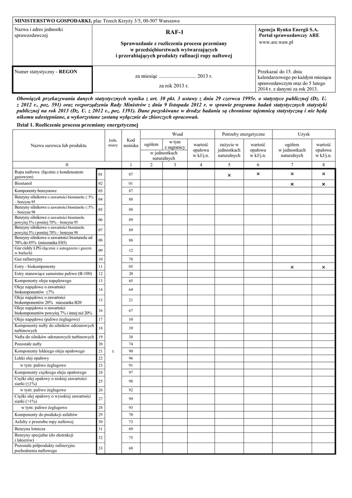 MINISTERSTWO GOSPODARKI, plac Trzech Krzyży 3/5, 00-507 Warszawa Nazwa i adres jednostki sprawozdawczej RAF-1 Sprawozdanie z rozliczenia procesu przemiany w przedsiębiorstwach wytwarzających i przerabiających produkty rafinacji ropy naftowej Numer statystyczny - REGON Agencja Rynku Energii S.A. Portal sprawozdawczy ARE www.are.waw.pl Przekazać do 15. dnia kalendarzowego po każdym miesiącu sprawozdawczym oraz do 5 lutego 2014 r. z danymi za rok 2013. za miesiąc ............................ 2013 r. za rok 2013 r. Obowiązek przekazywania danych statystycznych wynika z art. 30 pkt. 3 ustawy z dnia 29 czerwca 1995r. o statystyce publicznej (Dz. U. z 2012 r., poz. 591) oraz rozporządzenia Rady Ministrów z dnia 9 listopada 2012 r. w sprawie programu badań statystycznych statystyki publicznej na rok 2013 (Dz. U. z 2012 r., poz. 1391). Dane pozyskiwane w drodze badania są chronione tajemnicą statystyczną i nie będą nikomu udostępniane, a wykorzystane zostaną wyłącznie do zbiorczych opracowań. Dział 1. Rozliczenie procesu przemiany energetycznej Wsad Jedn. miary Nazwa surowca lub produktu 0 Ropa naftowa (łącznie z kondensatem gazowym) Bioetanol Kod nośnika 1 01 07 02 01 03 87 04 88 05 88 06 89 07 89 08 86 09 12 Gaz rafineryjny 10 78 Estry - biokomponenty 11 05 Estry stanowiące samoistne paliwo (B-100) 12 20 Komponenty oleju napędowego Oleje napędowe o zawartości biokomponentów ≤7% Oleje napędowe o zawartości biokomponentów 20% mieszanka B20 Oleje napędowe o zawartości biokomponentów powyżej 7% i innej niż 20% Oleje napędowe (paliwo żeglugowe) Komponenty nafty do silników odrzutowych turbinowych Nafta do silników odrzutowych turbinowych 13 65 14 64 15 21 16 67 17 10 18 39 19 38 Pozostałe nafty 20 Komponenty lekkiego oleju opałowego 21 Lekki olej opałowy 22 96 23 91 Komponenty ciężkiego oleju opałowego Ciężki olej opałowy o niskiej zawartości siarki (≤1%) w tym: paliwo żeglugowe Ciężki olej opałowy o wysokiej zawartości siarki (>1%) w tym: paliwo żeglugowe 24 97 25 98 26 92 27 99 28 93 Komponenty do produkcji asfaltów 29 70 Asfalty z przerobu ropy naftowej 30 73 Benzyna lotnicza Benzyny specjalne (do ekstrakcji i lakierów) Pozostałe półprodukty rafineryjne pochodzenia naftowego 31 69 32 75 33 68 Komponenty benzynowe Benzyny silnikowe o zawartości bioetanolu ≤ 5% – benzyna 95 Benzyny silnikowe o zawartości bioetanolu ≤ 5% – benzyna 98 Benzyny silnikowe o zawartości bioetanolu powyżej 5% i poniżej 70% – benzyna 95 Benzyny silnikowe o zawartości bioetanolu powyżej 5% i poniżej 70% – benzyna 98 Benzyny silnikowe o zawartości bioetanolu od 70% do 85% (mieszanka E85) Gaz ciekły LPG (łącznie z autogazem i gazem w butlach) w tym: paliwo żeglugowe 74 t 90 w tym ogółem z zagranicy w jednostkach naturalnych 2 3 Potrzeby energetyczne Uzysk wartość opałowa w kJ/j.n. zużycie w jednostkach naturalnych wartość opałowa w kJ/j.n. ogółem w jednostkach naturalnych wartość opałowa w kJ/j.n. 4 5 6 7 8 × × × × × × × × Dział 1. Rozliczenie procesu przemiany energetycznej (dok.) Wsad Jedn. miary Nazwa surowca lub produktu 0 Kod nośnika 1 w tym ogółem z zagranicy w jednostkach naturalnych 2 3 Potrzeby energetyczne Uzysk wartość opałowa w kJ/j.n. zużycie w jednostkach naturalnych wartość opałowa w kJ/j.n. ogółem w jednostkach naturalnych wartość opałowa w kJ/j.n. 4 5 6 7 8 × × × × × × × × × × × × × × Oleje bazowe 34 80 Oleje silnikowe 35 71 Oleje i preparaty smarowe Wazeliny, gacze, parafiny, woski pochodzenia naftowego Benzyna do pirolizy 36 82 37 72 38 76 Gudron 39 59 Pozostałe produkty naftowe 40 77 Biometanol 41 Biodimetyloeter 42 58 Bio-ETBE 43 08 Bio-MTBE 44 09 Inne dodatki uszlachetniające 45 81 Etan 46 57 Koks naftowy 47 63 Benzole surowe 48 52 Siarka 49 55 Oleje odpadowe – przepracowane Pozostałe odpady przemysłowe stałe i ciekłe Paliwa odpadowe gazowe 50 22 × × × × × 34 × × × × × 52 79 × × × Gaz ziemny wysokometanowy Gaz ziemny z odmetanowania pokładów węgla Węgiel kamienny do celów energetycznych Koks i półkoks z węgla 53 13 × × × × 15 × × 60 × × Ciepło w parze i gorącej wodzie 57 GJ 23 Energia elektryczna 58 MWh 24 × × × × × × Odzysk z przemysłu petrochemicznego 59 51 w tym: 54 55 t GJ dam3 t 56 06 62 × × × × × × × × 60 61 62 t 63 64 Dział 2. Moce przerobowe (w tys. ton/rok) Nazwa procesu Moc przerobowa Nazwa procesu Moc przerobowa 0 1 0 1 Destylacja atmosferyczna 01 Koksowanie 08 Destylacja próżniowa 02 Reforming katalityczny 09 Kraking katalityczny (ekwiwalentny) 03 Hydroodsiarczanie (HDS), Hydrotreating (HT) 10 Kraking katalityczny 04 Alkilacja 11 Hydrokraking 05 Polimeryzacja 12 Kraking termiczny 06 Izomeryzacja 13 Visbreaking 07 Produkcja ETBE 14 Produkcja MTBE 15 Proszę podać szacunkowy czas (w minutach) przeznaczony na przygotowanie danych dla potrzeb wypełnienia formularza 1 Proszę podać szacunkowy czas (w minutach) przeznaczony na wypełnienie formularza 2 .................................................................... (imię, nazwisko i telefon osoby, która sporządziła sprawozdanie) ............................................. (miejscowość, data) ................................................................. (imię, nazwisko i telefon osoby zatwierdzającej sprawozdanie)