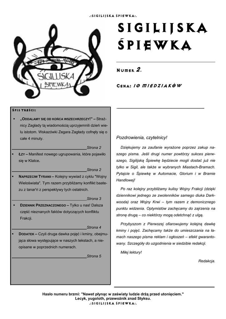 .:Sigilijska Śpiewka:. SIGILIJSKA ŚPIEWKA _________________________________________ NUMER 2. CENA: 10 miedziaków ____________________________________ SPIS TREŚCI: „ODDALAMY SIĘ OD KOŃCA WSZECHRZECZY!” – Strażnicy Zagłady tą wiadomością uprzyjemnili dzień wielu istotom. Wskazówki Zegara Zagłady cofnęły się o całe 4 minuty. _______________________________Strona 2 szego pisma. Jeśli drugi numer powtórzy sukces pierw- się w Klatce. szego, Sigilijską Śpiewkę będziecie mogli dostać już nie NAPRZECIW TYRANII – Kolejny wywiad z cyklu "Wojny Wieloświata". Tym razem przybliżamy konflikt baatezu z tanar'ri z perspektywy tych ostatnich. _______________________________Strona 3 DZIENNIK PRZEZNACZONEGO – Tylko u nas! Dalsza część nieznanych faktów dotyczących konfliktu Frakcji. _______________________________Strona 4 Dziękujemy za zaufanie wyrażone poprzez zakup na- ŁZY – Manifest nowego ugrupowania, które pojawiło _______________________________Strona 2 Pozdrowienia, czytelnicy! DODATEK – Czyli druga dawka pojęć i kminy, obejmująca słowa występujące w naszych tekstach, a nieopisane w poprzednich numerach. _______________________________Strona 5 tylko w Sigil, ale także w wybranych Miastach-Bramach. Pytajcie o Śpiewkę w Automacie, Glorium i w Bramie Handlowej! Po raz kolejny przybliżamy kulisy Wojny Frakcji (dzięki dziennikowi jednego ze zwolenników samego diuka Darkwooda) oraz Wojny Krwi – tym razem z demonicznego punktu widzenia. Optymistów zachęcamy do zajrzenia na stronę drugą – co niektórzy mogą odetchnąć z ulgą. Przybyszom z Pierwszej ofiarowujemy kolejną dawkę kminy i pojęć. Zachęcamy także do umieszczania na łamach naszego pisma reklam i ogłoszeń – efekt gwarantowany. Szczegóły do uzgodnienia w siedzibie redakcji. Miłej lektury! Redakcja. _______________________________ Hasło numeru brzmi: "Nawet płynąc w zaświaty ludzie drżą przed utonięciem." Lecyk, yugoloth, przewoźnik znad Styksu. .:sigilijska śpiewka:. .:Sigilijska śpiewka:. Oddalamy się od końca wszechrzeczy! Puści informują: Zegar Zagłady cofnął swe wskazówki o cztery minuty, wskazując obecnie dziewięć minut przed przeciwszczytem. Do sigilijskiej braci posłany został faktotum. Jako jedyni zdołaliśmy się dowiedzieć, jakie są prawdopodobne powody zmiany w Zegarze: - Przyczyny widzimy w uspokojeniu ostatnich konfliktów zbrojnych w Klatce, która najpewniej wpływa na równowagę rynkową i gospodarczą, a także migracyjną. Nie należy pominąć uciszenia Vecny i wzrośnięcia w siłę obu stronnictw Wojny Krwi, które obecnie są w sytuacji patowej. Także liczne pomniejsze skupiska konfliktowe zawierają rozejmy i sojusze. Nawet nasi zwiadowcy z Pierwszej zdają się przynosić same przychylne wieści. Nie ulega wątpliwości, iż wieloświat chwilowo się ustabilizował, jednak zmiana o całe cztery minuty jest czymś wyjątkowym. Choć Armagedonu nie da się powstrzymać, można go odwlec w czasie, a Entropia może – przynajmniej pozornie – maleć. To napawa złudnym optymizmem, jednak oczywistym jest, iż na każdy krok w tył przypadać muszą dwa kroki w przód – relacjonuje Kalachan Pęknięta Stal, frakcyjny goniec. Ostatnia zmiana godziny w Zegarze nastąpiła kilka dni po wybuchu Wojny Frakcji, w momencie gdy nieumarli poczęli łapać się za czerepy z oddziałami walczących biesów. O zdanie spytaliśmy aktywnego członka Stowarzyszenia Historycznego, które wchodzi w skład Rady Sigil. Misuel Diaspor podkreśla, że w natłoku zmian z ostatnich lat nie można jednoznacznie podsumować wielu wydarzeń. Twierdzi, iż głupotą jest próba interpretacji tak gwałtownej różnicy ułożenia wskazówek Zegara, tym bardziej, że w ostatnich dekadach wskazówki parły do przodu. - Frakcja musiała zapomnieć, iż na sfery mają wpływ nie tylko Sigil i Plany Zewnętrzne. Nie wiadomo, z jakiego powodu przesuwały się wskazówki wprzód i być może nie możemy stwierdzić, które zjawiska uległy zała- godzeniu. Równie dobrze mogły istnieć zaburzenia parażywiołów, o których nie mieliśmy skąd usłyszeć. A może niektóre Kryształowe Sfery odparły atak wynaturzeń z Odległej Dziedziny? Sam fakt, iż modrony pospieszyły się ze swym Marszem po wieloświecie wskazuje, iż potrzebują one zrewidowania swych zapisków i kalkulacji. Skoro nawet najdoskonalszy mechanizm zawodzi, tym bardziej ograniczone zdolności pojmowania śmiertelników nie mogą być przeceniane. Zegar Zagłady znajduje się od czasu wygnania frakcji przez Panią w siedzibie Pustych. Wygląda jak zwykły, duży zegar, co by stać mógł w wielu salonach przy wejściu. Od niepamiętnych lat wskazuje on postęp ostatecznej zagłady. Nic dziwnego, że każda zmiana jest skrupulatnie notowana i budzi duże emocje, choć trudno jest takowe jednoznacznie zinterpretować. Nikt nie wie, do czego doprowadziłaby próba zmiany położenia wskazówek za pomocą siły. C. Nowa oferta zakładu Wesołek! Wielokrotnego użytku, zamykana na klucz, komfortowa i indywidualnie dopasowana – nasza najnowsza trumna pozwoli na godniejsze życie pozagrobowe! Wyposażona jest w magiczne negatory wykrycia, posiada możliwość zamontowania trzydziestu metrów sześciennych pozawymiarowej próżni przy pomocy najświeższych badań Gildii Magów! Zagraj w brydża i ugość kochanka – także śmiertelnego! Dla pierwszych stu klientów możliwość wyboru przy połowicznym rabacie niezmiernie ekskluzywnych kieliszków – ich kolor zmienia się zależnie od grupy i szlachetności nalanej krwi! Ceny do uzgodnienia w siedzibie sklepu! Ci, co potrzebują, wiedzą, gdzie pukać! •••Ogłoszenie Płatne Chcesz zamieścić własne ogłoszenie? Zgłoś się do nas! Promocyjne ceny dla wszelakich organizacji! Łzy Przepisów na łzę jest kilka. Pierwszy z nich: czuć niesamowity ból ciała. Drugi: odczuć łkanie duszy, chociażby w wyniku straty bliskie