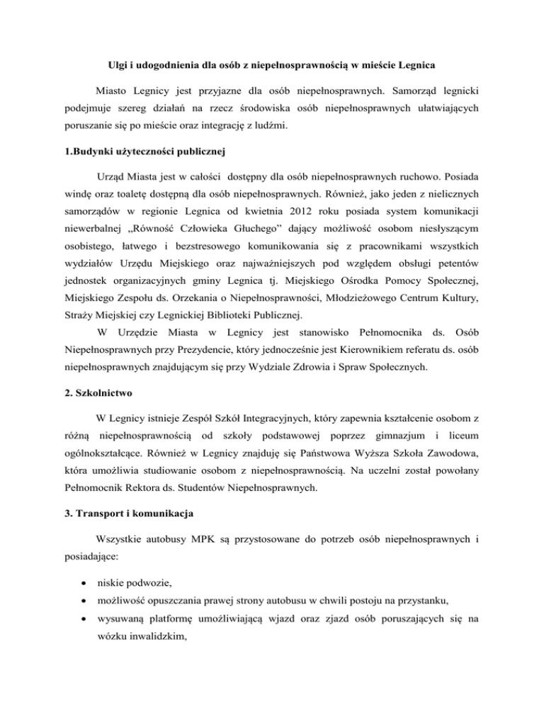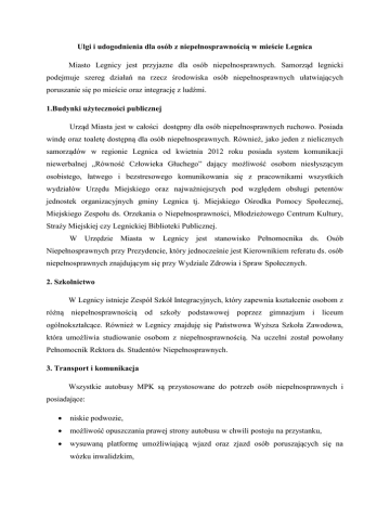 Ulgi i udogodnienia dla osób z niepełnosprawnością w mieście Legnica Miasto Legnicy jest przyjazne dla osób niepełnosprawnych. Samorząd legnicki podejmuje szereg działań na rzecz środowiska osób niepełnosprawnych ułatwiających poruszanie się po mieście oraz integrację z ludźmi. 1.Budynki użyteczności publicznej Urząd Miasta jest w całości dostępny dla osób niepełnosprawnych ruchowo. Posiada windę oraz toaletę dostępną dla osób niepełnosprawnych. Również, jako jeden z nielicznych samorządów w regionie Legnica od kwietnia 2012 roku posiada system komunikacji niewerbalnej „Równość Człowieka Głuchego” dający możliwość osobom niesłyszącym osobistego, łatwego i bezstresowego komunikowania się z pracownikami wszystkich wydziałów Urzędu Miejskiego oraz najważniejszych pod względem obsługi petentów jednostek organizacyjnych gminy Legnica tj. Miejskiego Ośrodka Pomocy Społecznej, Miejskiego Zespołu ds. Orzekania o Niepełnosprawności, Młodzieżowego Centrum Kultury, Straży Miejskiej czy Legnickiej Biblioteki Publicznej. W Urzędzie Miasta w Legnicy jest stanowisko Pełnomocnika ds. Osób Niepełnosprawnych przy Prezydencie, który jednocześnie jest Kierownikiem referatu ds. osób niepełnosprawnych znajdującym się przy Wydziale Zdrowia i Spraw Społecznych. 2. Szkolnictwo W Legnicy istnieje Zespół Szkół Integracyjnych, który zapewnia kształcenie osobom z różną niepełnosprawnością od szkoły podstawowej poprzez gimnazjum i liceum ogólnokształcące. Również w Legnicy znajduję się Państwowa Wyższa Szkoła Zawodowa, która umożliwia studiowanie osobom z niepełnosprawnością. Na uczelni został powołany Pełnomocnik Rektora ds. Studentów Niepełnosprawnych. 3. Transport i komunikacja Wszystkie autobusy MPK są przystosowane do potrzeb osób niepełnosprawnych i posiadające: niskie podwozie, możliwość opuszczania prawej strony autobusu w chwili postoju na przystanku, wysuwaną platformę umożliwiającą wjazd oraz zjazd osób poruszających się na wózku inwalidzkim, 1 specjalnie wydzielone miejsca dla osób poruszających się na wózku inwalidzkim oraz dla osób niewidomych. Podróżujące komunikacją miejską uprawnione są do bezpłatnego przejazdu następujące osoby: osoby niepełnosprawne w stopniu znacznym całkowicie niezdolne do pracy oraz niezdolne do samodzielnej egzystencji (w przeszłości I grupa inwalidzka), dzieci i młodzież dotknięta inwalidztwem lub niepełnosprawna objęta kształceniem specjalnym na trasie: miejsce zamieszkania lub miejsce pobytu do miejsca kształcenia i miejsca odbywania przygotowania przedszkolnego, do placówki opiekuńczowychowawczej, ośrodka rehabilitacyjno-wychowawczego, domu pomocy społecznej, ośrodka wsparcia, zakładu opieki zdrowotnej, poradni psychologiczno-pedagogicznej i z powrotem, oraz opiekun osoby, wymienionej w wyliczeniu powyżej. Osoby niepełnosprawne w stopniu umiarkowanym lub lekkim, całkowicie lub częściowo niezdolne do pracy (w przeszłości II i III grupa inwalidzka) uprawnione są do przejazdu ulgowego. Miejskie Przedsiębiorstwo Komunikacyjne oferuje dla osób niepełnosprawnych usługi przewozowe. Przewozy są wykonywane specjalnym mikrobusem wyposażonym w windę hydrauliczną, siedem dni w tygodniu w godz. od 6 – 22. Koszt przewozu osoby niepełnosprawnej mikrobusem wynosi: 1. Na terenie Miasta Legnica: odległość do 7 km - 4 zł (opłata stała), za każdy następny 1 km - 1 zł, abonamenty: - abonament okresowy 30 dniowy – opłata równa wartości biletu normalnego okresowego 30 dniowego "imiennego" obowiązującego w MPK sp. z o.o. w Legnicy uprawniający do dwukrotnego przejazdu na jednej określonej trasie np. dom – praca, praca – dom, z wyłączeniem sobót i niedziel, - abonament okresowy 14 dniowy - opłata równa połowie wartości biletu normalnego okresowego 30 dniowego "imiennego" powiększona o kwotę 5 zł. – uprawniający do 2 dwukrotnego przejazdu na jednej określonej trasie w okresie 14 dni w celu korzystania z zabiegów medycznych, szkolenia zawodowego lub edukacji, z wyłączeniem sobót i niedziel, - abonamenty o których mowa powyżej zakupić można w dowolnym dniu miesiąca, wskazując dzień rozpoczęcia okresu jego ważności. przewóz dzieci i młodzieży szkolnej – bezpłatnie – po zakwalifikowaniu dziecka do przewozów przez UM Legnica – zgodnie z ustawą o systemie oświaty. 2. Poza terenem Miasta Legnica: przejazd na odległość nie przekraczającą 30 km - opłata stała + 1,50 zł za każdy kilometr przejazdu liczony od granic miasta, przejazd na odległość przekraczającą 30 km – opłata wg kosztów rzeczywistych wynikających z umowy zawartej przez gminę Legnica z podmiotem wykonującym przewozy. 3. Opłata za postój: opłata za pierwsze pół godziny postoju 5 zł, opłata za każde następne rozpoczęte pół godziny 5 zł. 4.Infrastruktura Na każdym płatnym parkingu usytuowane jest miejsce lub miejsca (w zależności od wielkości parkingu) przeznaczone dla osób niepełnosprawnych. Osoba posiadająca „kartę parkingową” parkuje w miejscu oznaczonym kopertą. Jeżeli oznaczone miejsce jest zajęte, osoba niepełnosprawna ma prawo zaparkować na dowolnie wolnym miejscu również bezpłatnie. Większość przejść dla pieszych na skrzyżowaniach w mieście Legnica ma obniżone krawężniki, które umożliwiają swobodny przejazd wózkiem inwalidzkim. Zarząd Dróg Miejskich przy realizacji zadań inwestycyjnych i remontowych ciągów komunikacyjnych przyjął jako standard obniżanie krawężników i dostosowanie przejść dla pieszych do potrzeb osób niepełnosprawnych z różnymi dysfunkcjami. Obecnie większość głównych ciągów komunikacyjnych poza obniżonymi krawężnikami wyposażona jest w tzw. System „płyt STOP” ułatwiających niewidomym i niedowidzącym ustalenie krawędzi chodnika przed wejściem na jezdnie i zatokę autobusową. Jedno