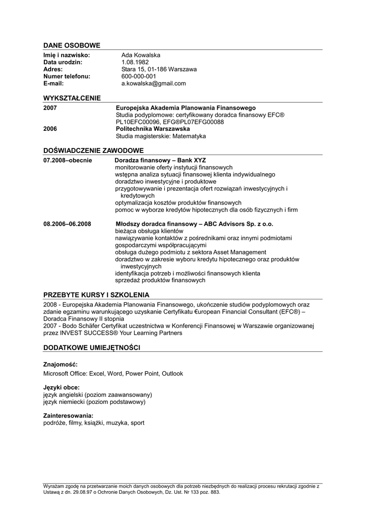 DANE OSOBOWE Imię i nazwisko: Data urodzin: Adres: Numer telefonu: E-mail: Ada Kowalska 1.08.1982 Stara 15, 01-186 Warszawa 600-000-001 [email protected] WYKSZTAŁCENIE 2007 2006 Europejska Akademia Planowania Finansowego Studia podyplomowe: certyfikowany doradca finansowy EFC® PL10EFC00096, EFG®PL07EFG00088 Politechnika Warszawska Studia magisterskie: Matematyka DOŚWIADCZENIE ZAWODOWE 07.2008–obecnie Doradza finansowy – Bank XYZ monitorowanie oferty instytucji finansowych wstępna analiza sytuacji finansowej klienta indywidualnego doradztwo inwestycyjne i produktowe przygotowywanie i prezentacja ofert rozwiązań inwestycyjnych i kredytowych optymalizacja kosztów produktów finansowych pomoc w wyborze kredytów hipotecznych dla osób fizycznych i firm 08.2006–06.2008 Młodszy doradca finansowy – ABC Advisors Sp. z o.o. bieŜąca obsługa klientów nawiązywanie kontaktów z pośrednikami oraz innymi podmiotami gospodarczymi współpracującymi obsługa duŜego podmiotu z sektora Asset Management doradztwo w zakresie wyboru kredytu hipotecznego oraz produktów inwestycyjnych identyfikacja potrzeb i moŜliwości finansowych klienta sprzedaŜ produktów finansowych PRZEBYTE KURSY I SZKOLENIA 2008 - Europejska Akademia Planowania Finansowego, ukończenie studiów podyplomowych oraz zdanie egzaminu warunkującego uzyskanie Certyfikatu €uropean Financial Consultant (EFC®) – Doradca Finansowy II stopnia 2007 - Bodo Schäfer Certyfikat uczestnictwa w Konferencji Finansowej w Warszawie organizowanej przez INVEST SUCCESS® Your Learning Partners DODATKOWE UMIEJĘTNOŚCI Znajomość: Microsoft Office: Excel, Word, Power Point, Outlook Języki obce: język angielski (poziom zaawansowany) język niemiecki (poziom podstawowy) Zainteresowania: podróŜe, filmy, ksiąŜki, muzyka, sport WyraŜam zgodę na przetwarzanie moich danych osobowych dla potrzeb niezbędnych do realizacji procesu rekrutacji zgodnie z Ustawą z dn. 29.08.97 o Ochronie Danych Osobowych, Dz. Ust. Nr 133 poz. 883.