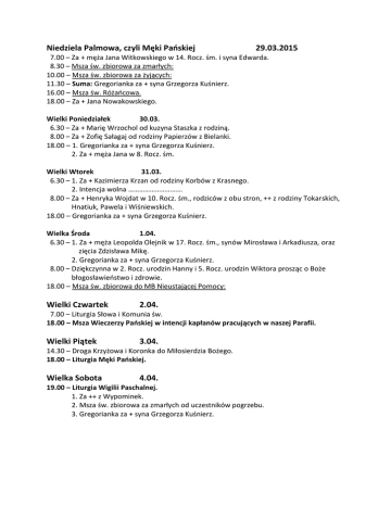 Niedziela Palmowa, czyli Męki Pańskiej 29.03.2015 7.00 – Za + męża Jana Witkowskiego w 14. Rocz. śm. i syna Edwarda. 8.30 – Msza św. zbiorowa za zmarłych: 10.00 – Msza św. zbiorowa za żyjących: 11.30 – Suma: Gregorianka za + syna Grzegorza Kuśnierz. 16.00 – Msza św. Różańcowa. 18.00 – Za + Jana Nowakowskiego. Wielki Poniedziałek 30.03. 6.30 – Za + Marię Wrzochol od kuzyna Staszka z rodziną. 8.00 – Za + Zofię Sałagaj od rodziny Papierzów z Bielanki. 18.00 – 1. Gregorianka za + syna Grzegorza Kuśnierz. 2. Za + męża Jana w 8. Rocz. śm. Wielki Wtorek 31.03. 6.30 – 1. Za + Kazimierza Krzan od rodziny Korbów z Krasnego. 2. Intencja wolna ………………………… 8.00 – Za + Henryka Wojdat w 10. Rocz. śm., rodziców z obu stron, ++ z rodziny Tokarskich, Hnatiuk, Pawela i Wiśniewskich. 18.00 – Gregorianka za + syna Grzegorza Kuśnierz. Wielka Środa 1.04. 6.30 – 1. Za + męża Leopolda Olejnik w 17. Rocz. śm., synów Mirosława i Arkadiusza, oraz zięcia Zdzisława Mikę. 2. Gregorianka za + syna Grzegorza Kuśnierz. 8.00 – Dziękczynna w 2. Rocz. urodzin Hanny i 5. Rocz. urodzin Wiktora prosząc o Boże błogosławieństwo i zdrowie. 18.00 – Msza św. zbiorowa do MB Nieustającej Pomocy: Wielki Czwartek 2.04. 7.00 – Liturgia Słowa i Komunia św. 18.00 – Msza Wieczerzy Pańskiej w intencji kapłanów pracujących w naszej Parafii. Wielki Piątek 3.04. 14.30 – Droga Krzyżowa i Koronka do Miłosierdzia Bożego. 18.00 – Liturgia Męki Pańskiej. Wielka Sobota 4.04. 19.00 – Liturgia Wigilii Paschalnej. 1. Za ++ z Wypominek. 2. Msza św. zbiorowa za zmarłych od uczestników pogrzebu. 3. Gregorianka za + syna Grzegorza Kuśnierz.