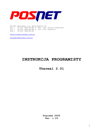 02-281 Tel.: Tel.: Fax.: Warszawa, ul. Municypalna 33 (0-22) 868-68-88 w. 201..204 (Dział handlowy) (0-22) 868-68-88 w. 251..253 (Serwis) (0-22) 868-68-89 http://www.posnet.com.pl [email protected] INSTRUKCJA PROGRAMISTY Thermal 2.01 Styczeń 2005 Ver. 1.23 1 Spis treści 1. WSTĘP............................................................................................................................................5 2. PROTOKÓŁ KOMUNIKACYJNY................................................................................................6 2.1 Syntaktyka rozkazów.................................................................................................................6 2.2 Obsługa sytuacji błędnych.........................................................................................................7 3. SEKWENCJE STERUJĄCE.........................................................................................................10 3.1 Ogólne zasady syntaktyki komend..........................................................................................10 3.2 Programowanie parametrów / sterowanie układem elektronicznym.......................................13 [LBSETCK]: Ustawienie zegara..............................................................................................13 [LBDSP]: Sterowanie wyświetlaczem / szufladą.....................................................................14 [LBDSPLINE]: Sterowanie linią wyświetlacza klienta............................................................15 [LBSETPTU] : Zmiana stawek PTU........................................................................................15 [LBSETHDR]: Programowanie nagłówka...............................................................................17 [LBGETHDR]: Odczytywanie nagłówka.................................................................................18 [LBSETRAB] : Wybór metody rozliczania rabatu...................................................................18 [LBSRVINFO] : Programowanie daty przeglądu okresowego ...............................................18 [LBAUTH] : Wprowadzanie kodu autoryzacyjnego ..............................................................19 [LBFEED] : Wysuw papieru....................................................................................................19 [LBCONF] : Konfiguracja - oszczędność papieru, operacja na wyświetlaczu operatora........20 [LBCONFW]: Konfiguracja wyświetlacza klienta...................................................................20 [LBSERM]: Obsługa błędów...................................................................................................20 3.3 Transakcja...............................................................................................................................21 [LBTRSHDR]: Początek transakcji..........................................................................................21 [LBTRSLN] : Linia paragonu...................................................................................................22 3.4 Obsługa kaucji.........................................................................................................................24 [LBTRSDEP]: Obsługa kaucji w linii paragonu......................................................................25 [LBDEP+]: Kaucja pobrana (za sprzedaż opakowania)...........................................................25 [LBDEPSTR+]: Storno kaucji pobranej...................................................................................26 [LBDEP-]: Kaucja wydana (za zwrot opakowania).................................................................27 [LBDEPSTR-]: Storno kaucji wydanej....................................................................................27 [LBOPAK]: Zwrot kaucji.........................................................................................................28 3.5 Zakończenie transakcji............................................................................................................29 [LBTREXITCAN] : Anulowanie transakcji ................................................................................29 [LBTREXIT] : Standardowe zatwierdzenie transakcji............................................................29 [LBRABAT] : Rabat/narzut w trakcie transakcji.....................................................................33 [LBGRPRAB] : Rabat/narzut do grupy towarów w danej stawce PTU...................................34 [LBPODSUM] : Rabat/narzut do paragonu od podsumy.........................................................35 [LBTRFORMPLAT]: Obsługa form płatności........................................................................36 [LBTRXEND1] : Zatwierdzenie transakcji z formami płatności (2).......................................37 3.6 Zakończenie paragonu z dodatkowymi liniami po logo fiskalnym ($y + $z)........................41 Linie wydań opakowań (pobranie kaucji )................................................................................42 Linie zwrotów opakowań (wydanie kaucji)..............................................................................42 Rozliczenie form płatności.......................................................................................................43 Linia dodatkowych stopek paragonu........................................................................................43 Linie informacyjne - definicja..................................................................................................44 Koniec wydruku........................................................................................................................44 3.7 Drukowanie raportów / kontrola bazy danych........................................................................45 [LBCSHREP1]: Raport kasy / zmiany uwzględniający formy płatności.................................45 [LBCSHREP2] : Rapo