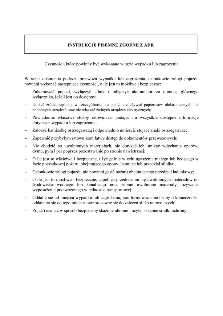 INSTRUKCJE PISEMNE ZGODNE Z ADR Czynności, które powinny